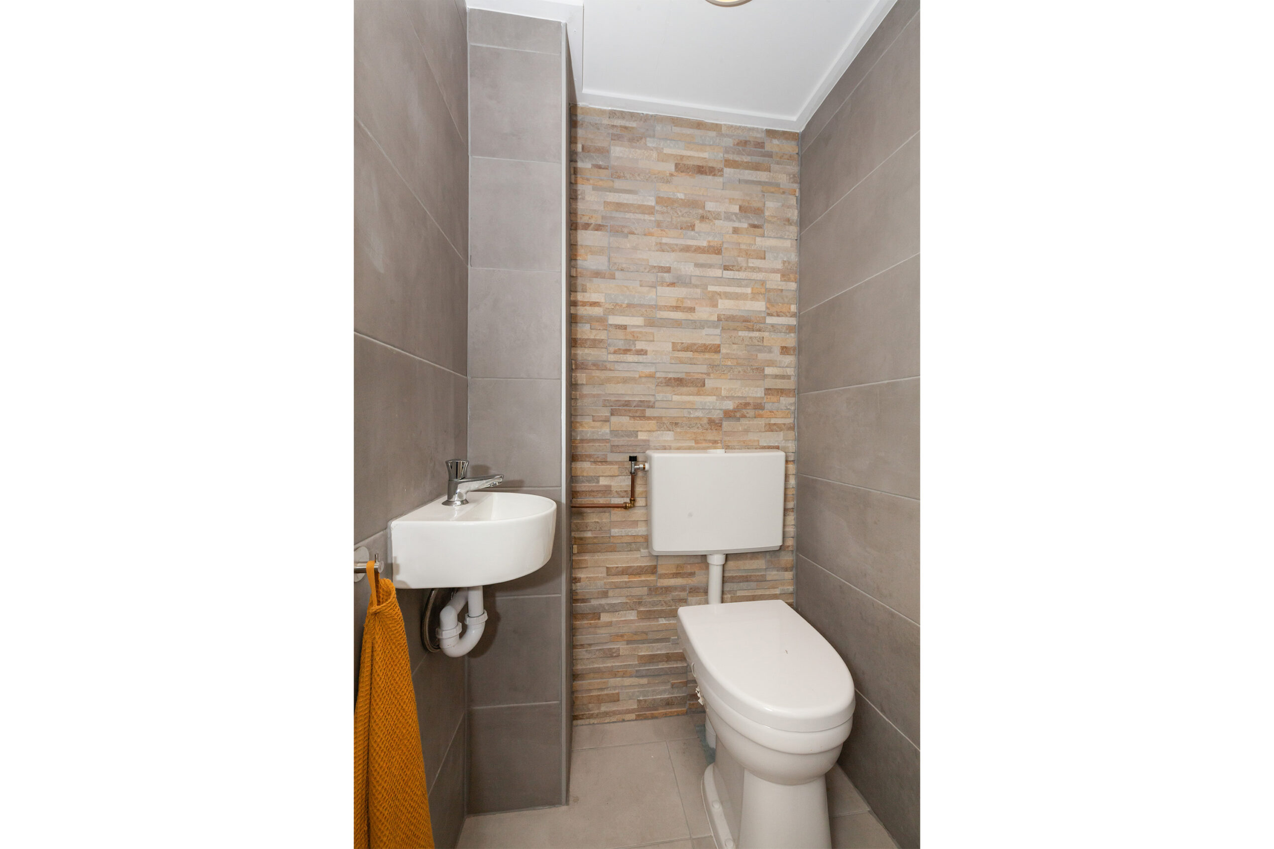 Nette toiletruimte voorzien van een vrijhangend closet en een handwasfonteintje.