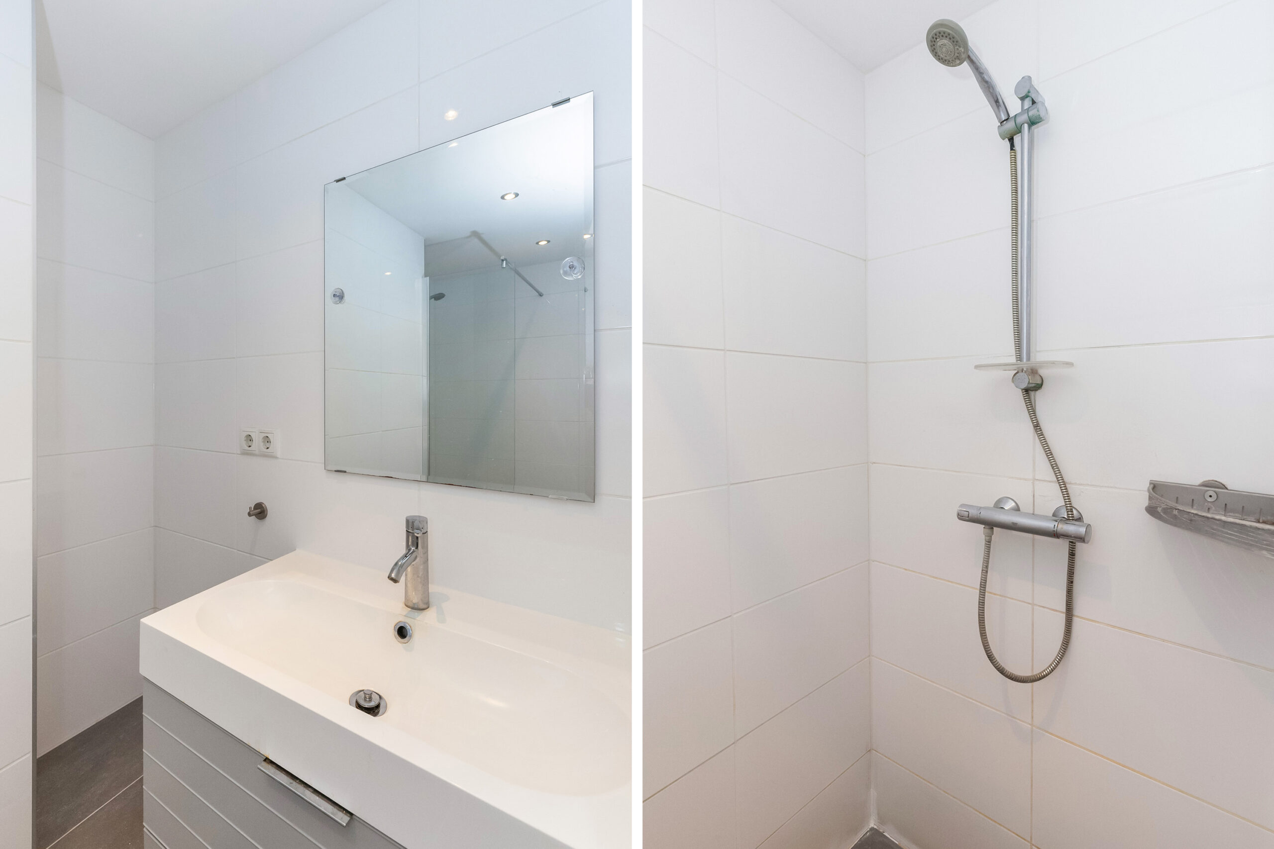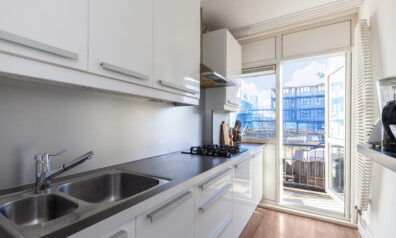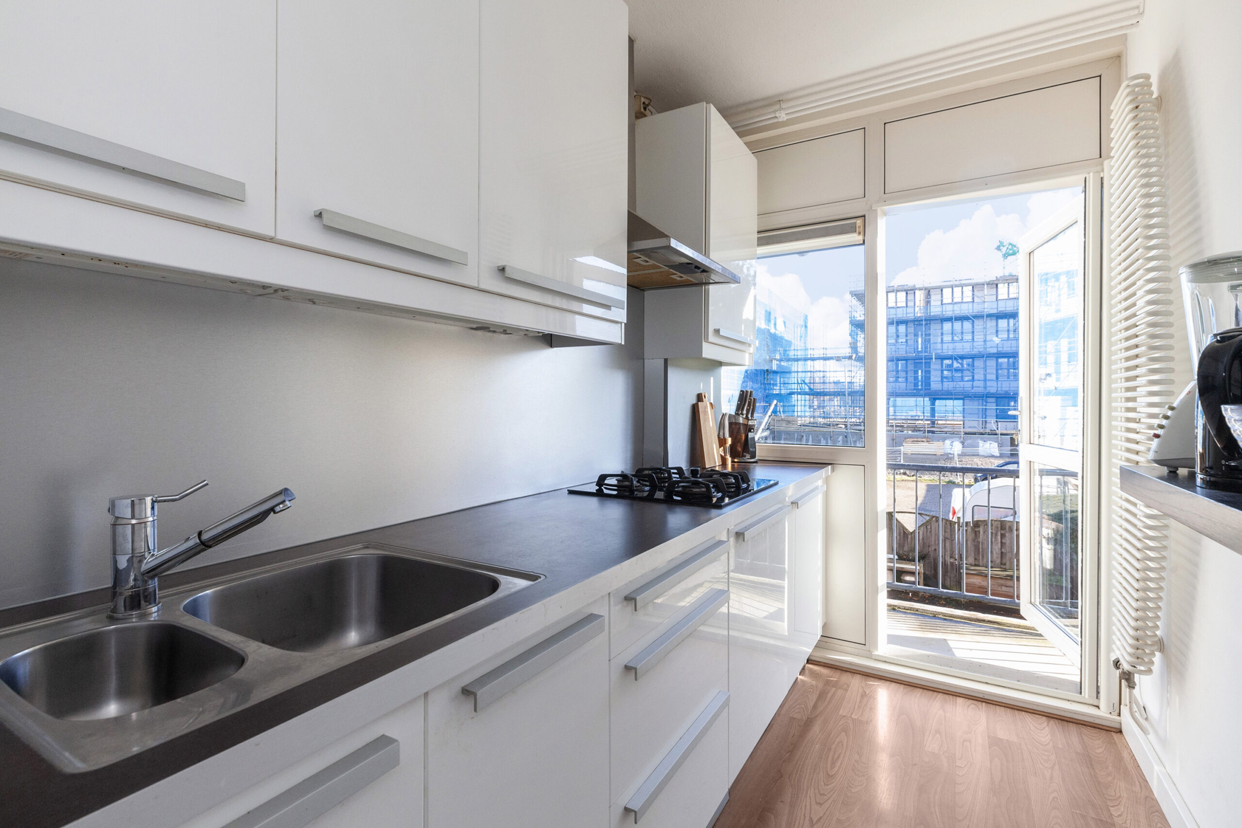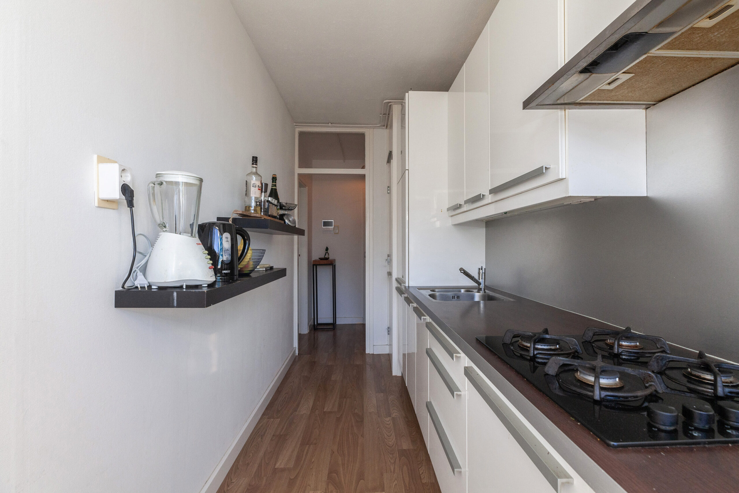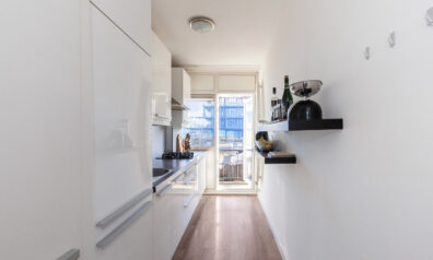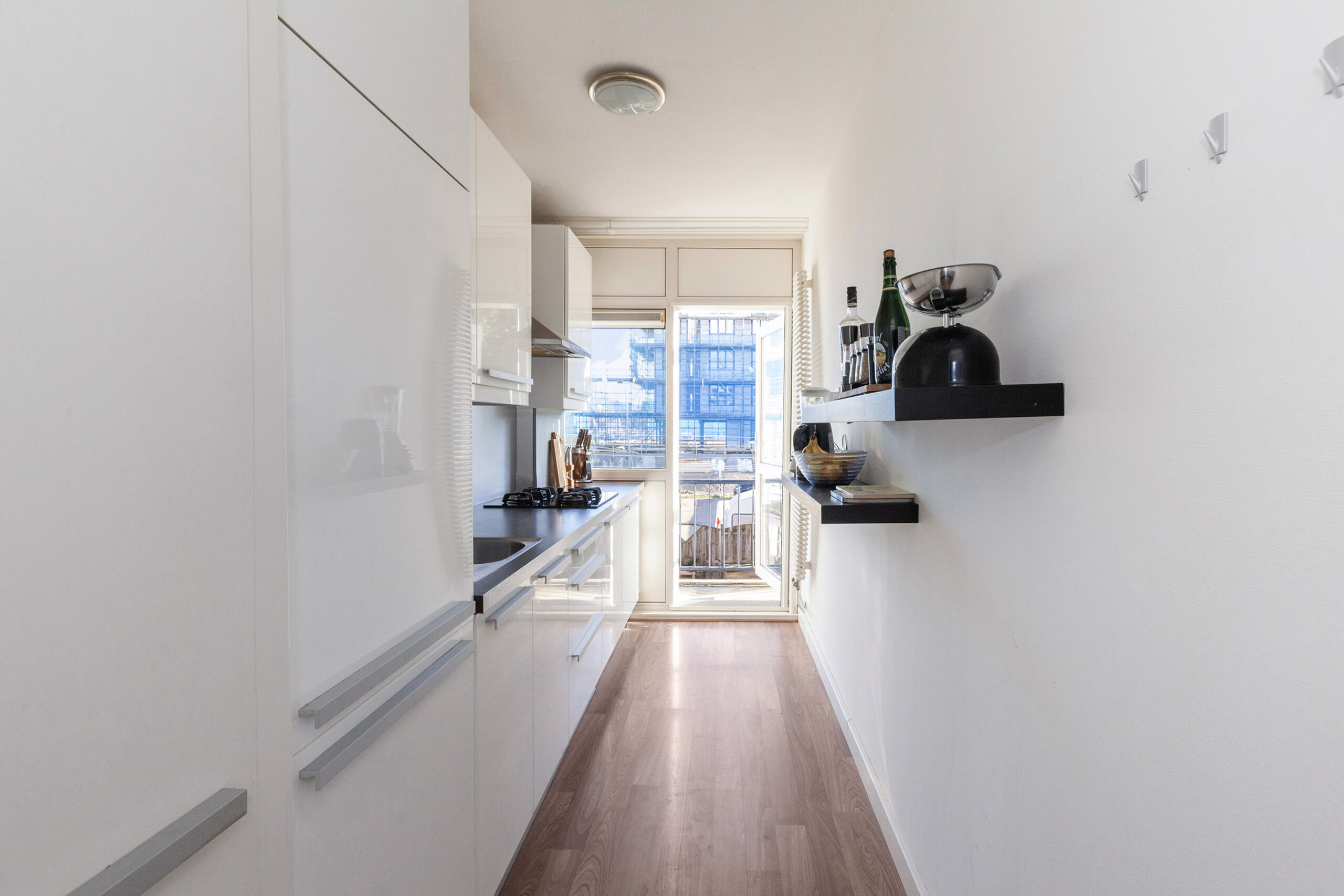 De keuken is uitgevoerd in een rechte opstelling met een witte hoogglans afwerking. Aan inbouwapparatuur heeft u de beschikking over een vier-pits gaskookplaat, afzuigkap, koel-/vriescombinatie en een vaatwasser. Daarnaast treft u in één van de kastjes de C.V.-ketel. Vanuit de keuken is er toegang tot het balkon van circa 2.19 x 1.14m.