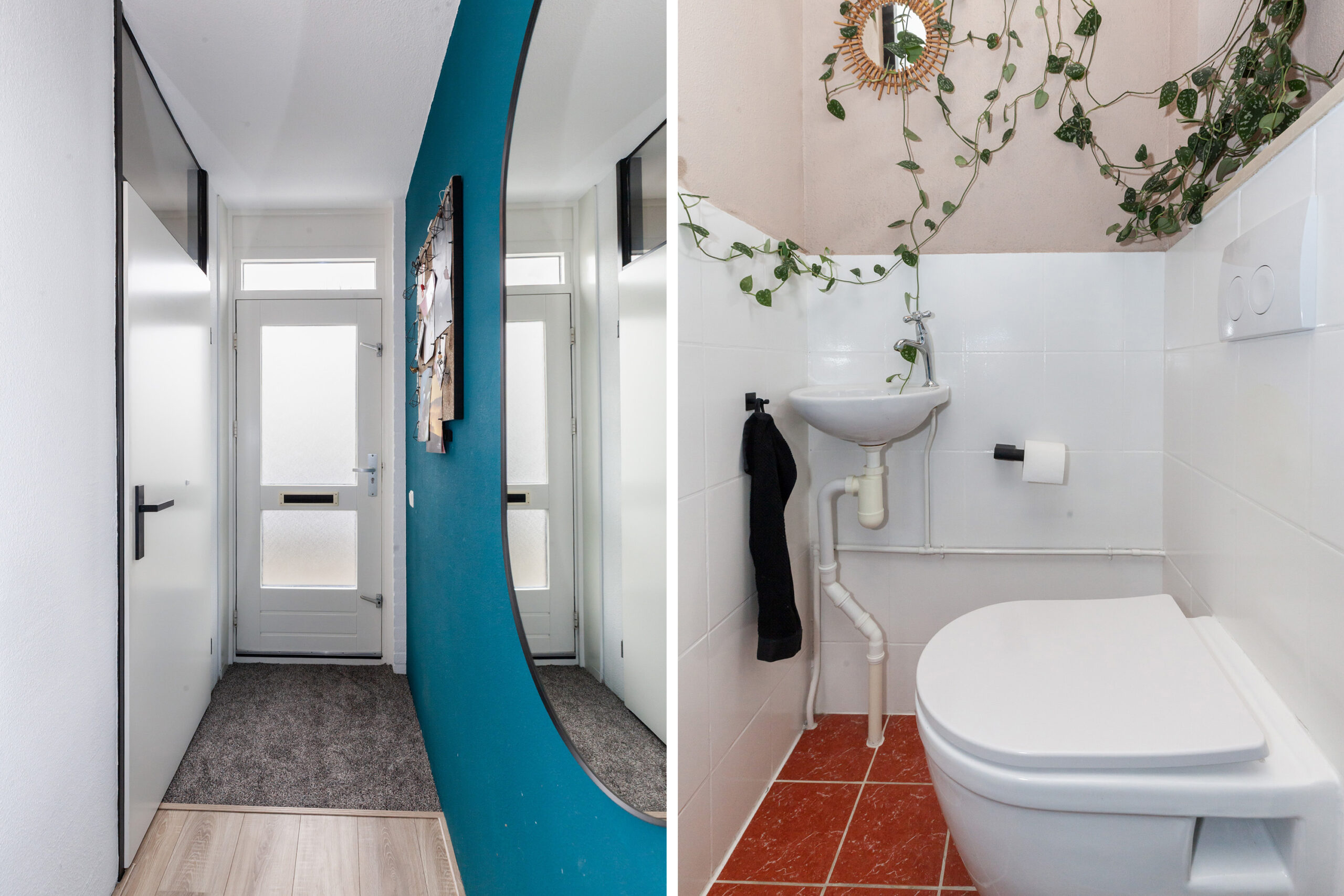 U stapt binnen in een ruime hal waar de toiletruimte, meterkast en trap naar de verdieping is. Tevens is er toegang tot de woonkamer.