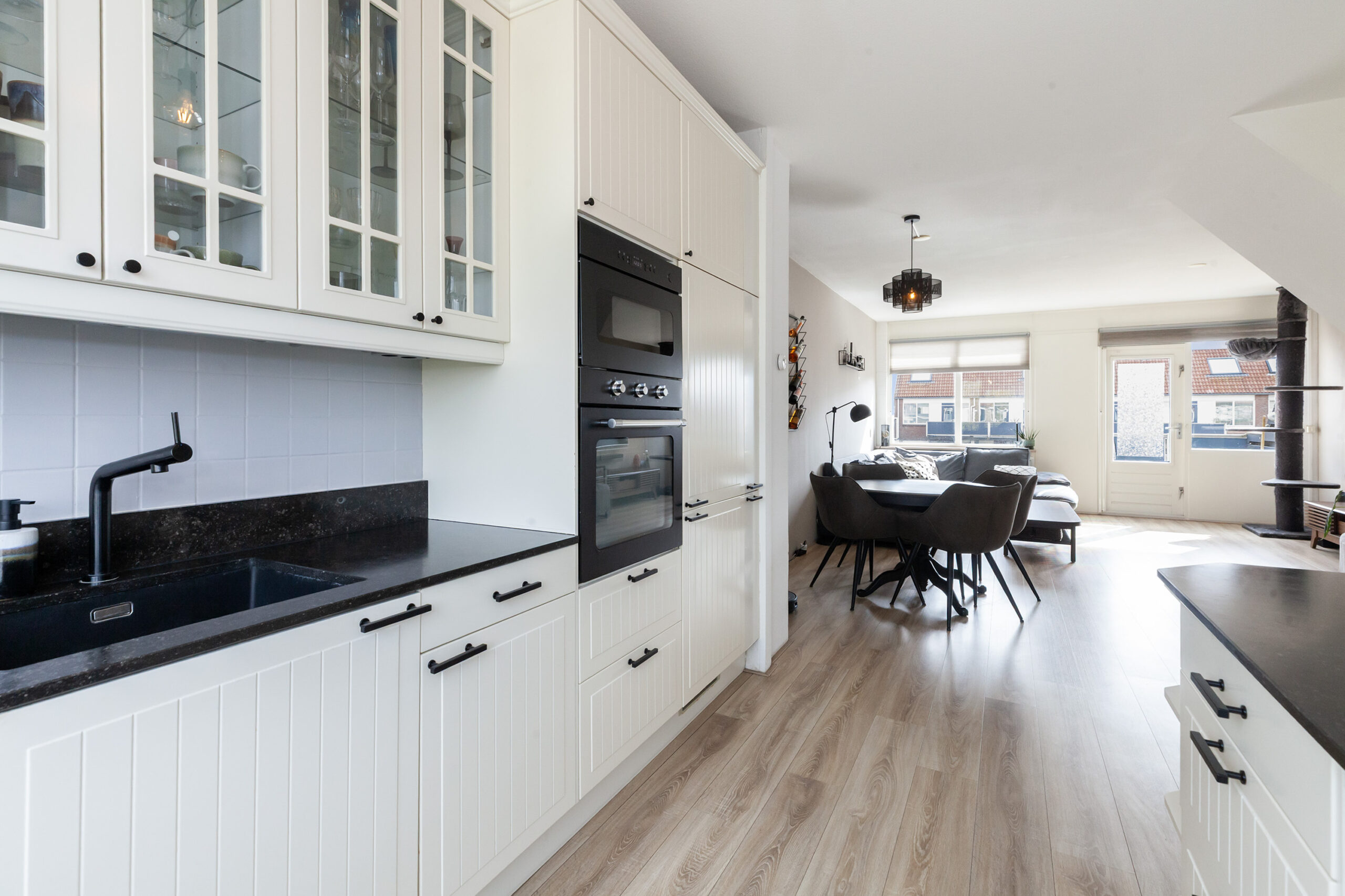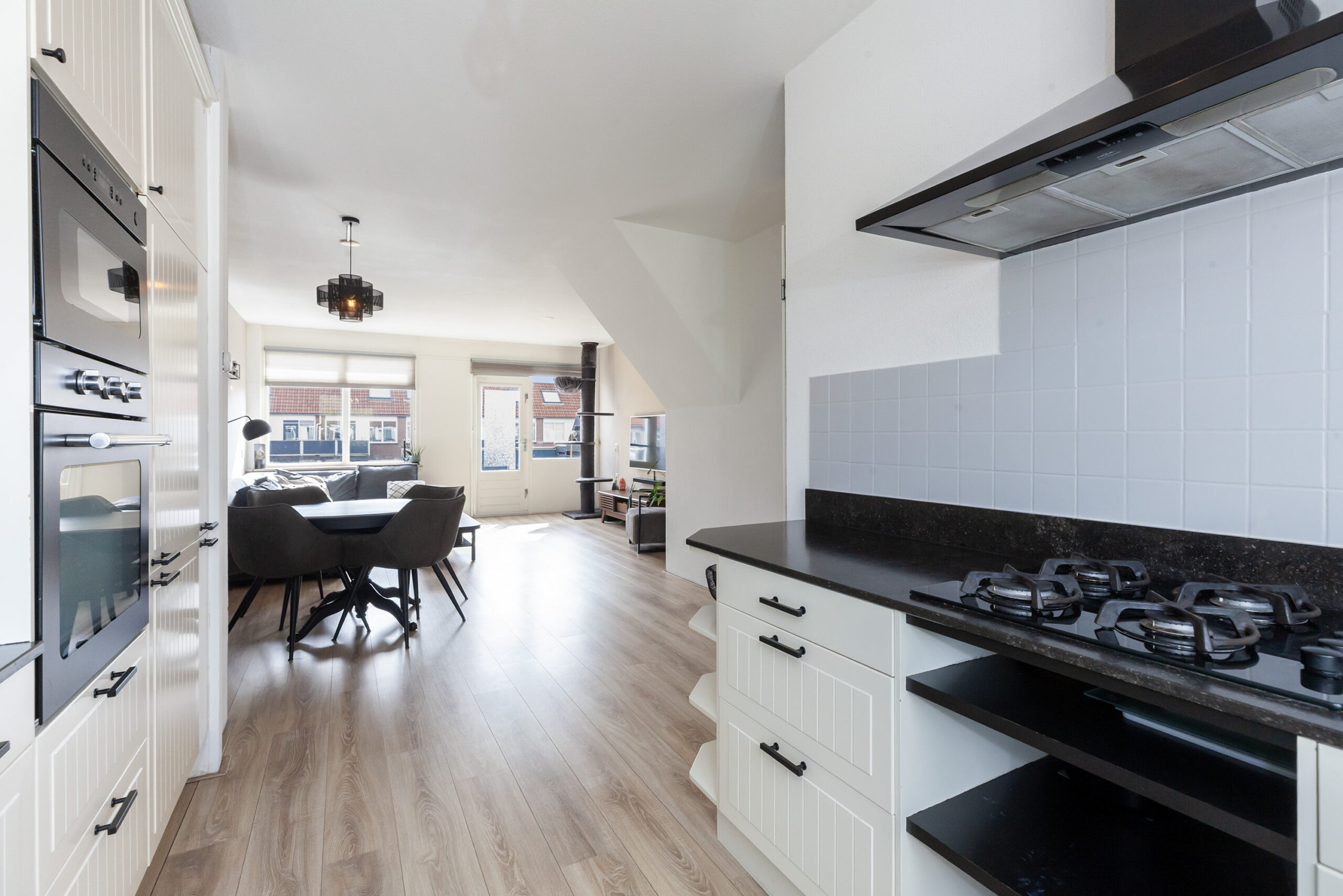 De keuken is aan de voorzijde gesitueerd waar u leuk weg kijkt over de omgeving. Aan weerszijden is er een rechte opstelling in een contrasterende kleurstelling. U heeft de beschikking over een 4-pits gaskookplaat, afzuigkap, koel-/vriescombinatie, vaatwasser, magnetron en oven.