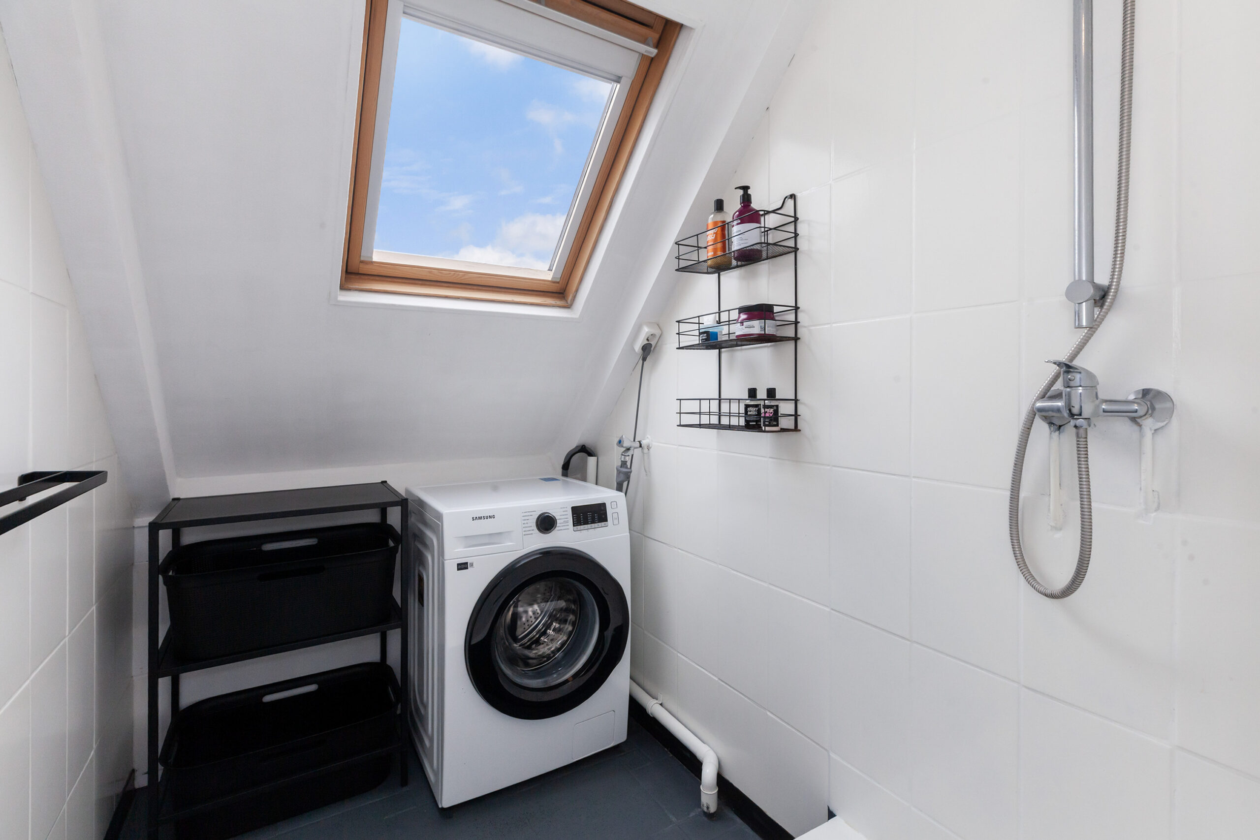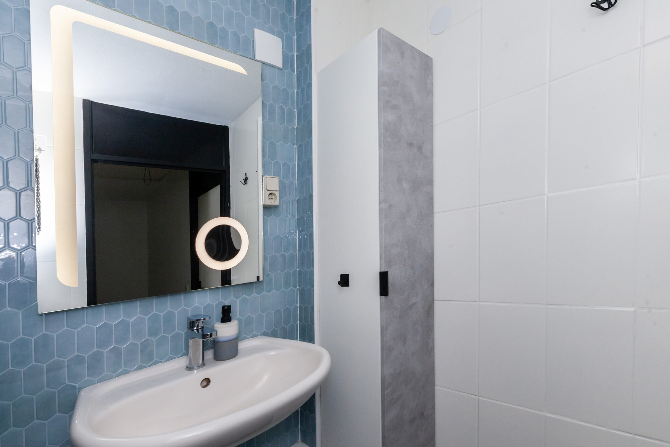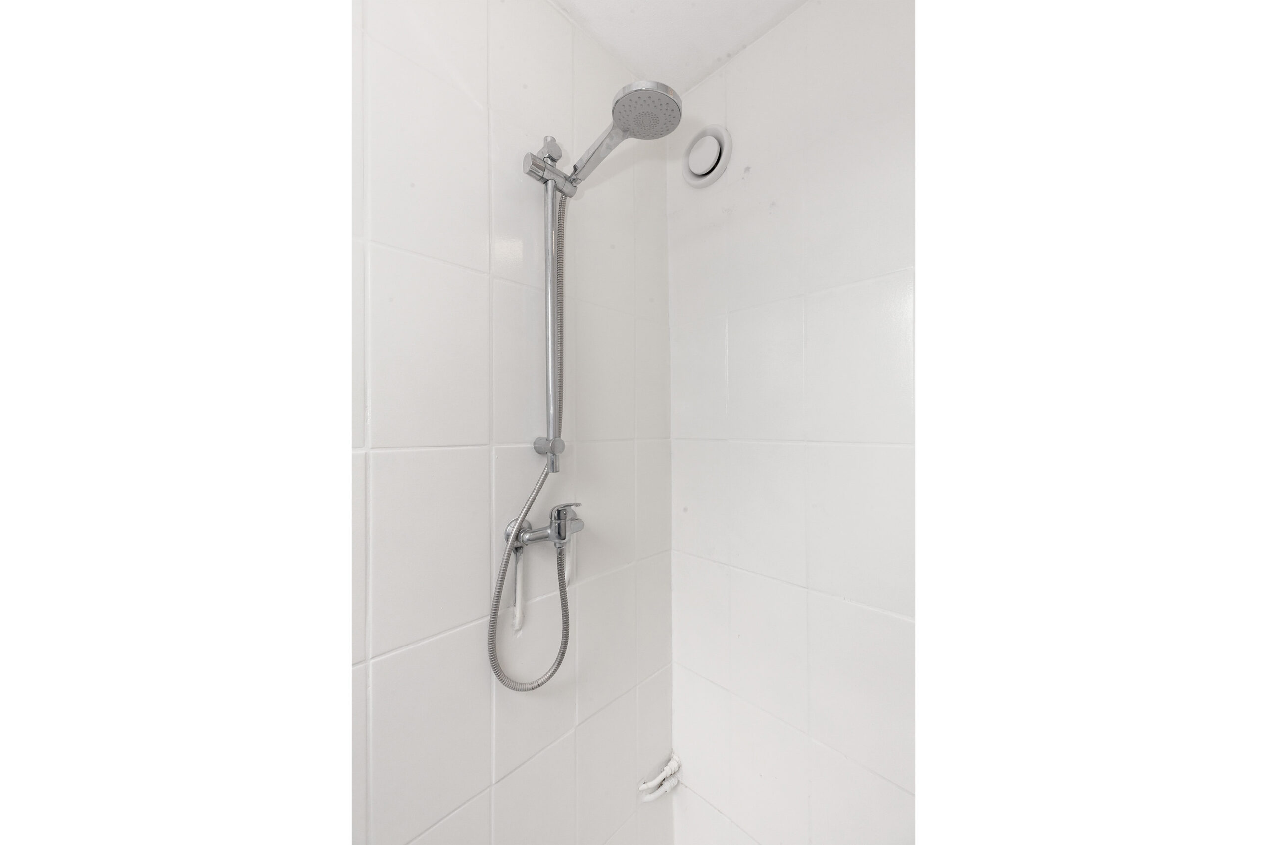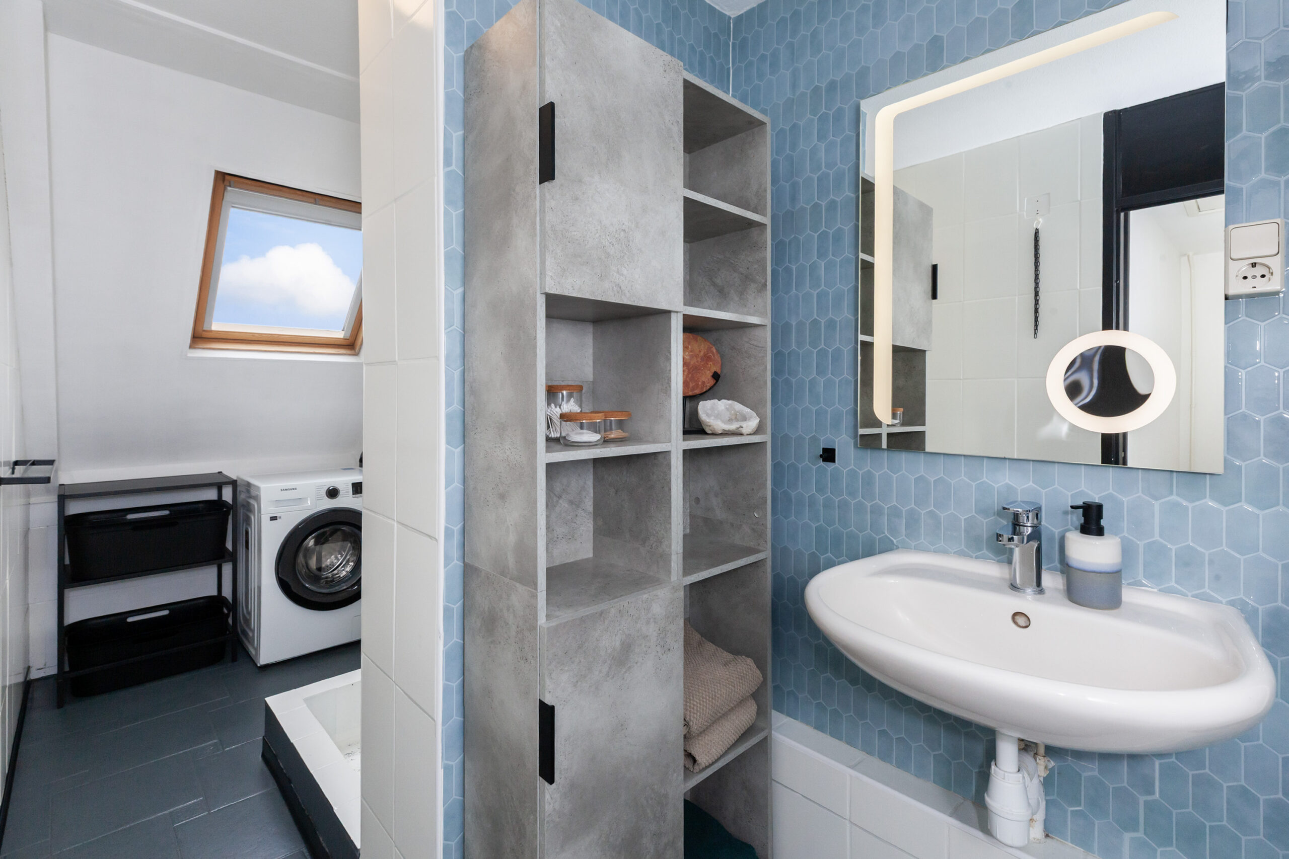 De badkamer is voorzien van een douche, wastafel en de aansluitingen voor uw wasapparatuur.