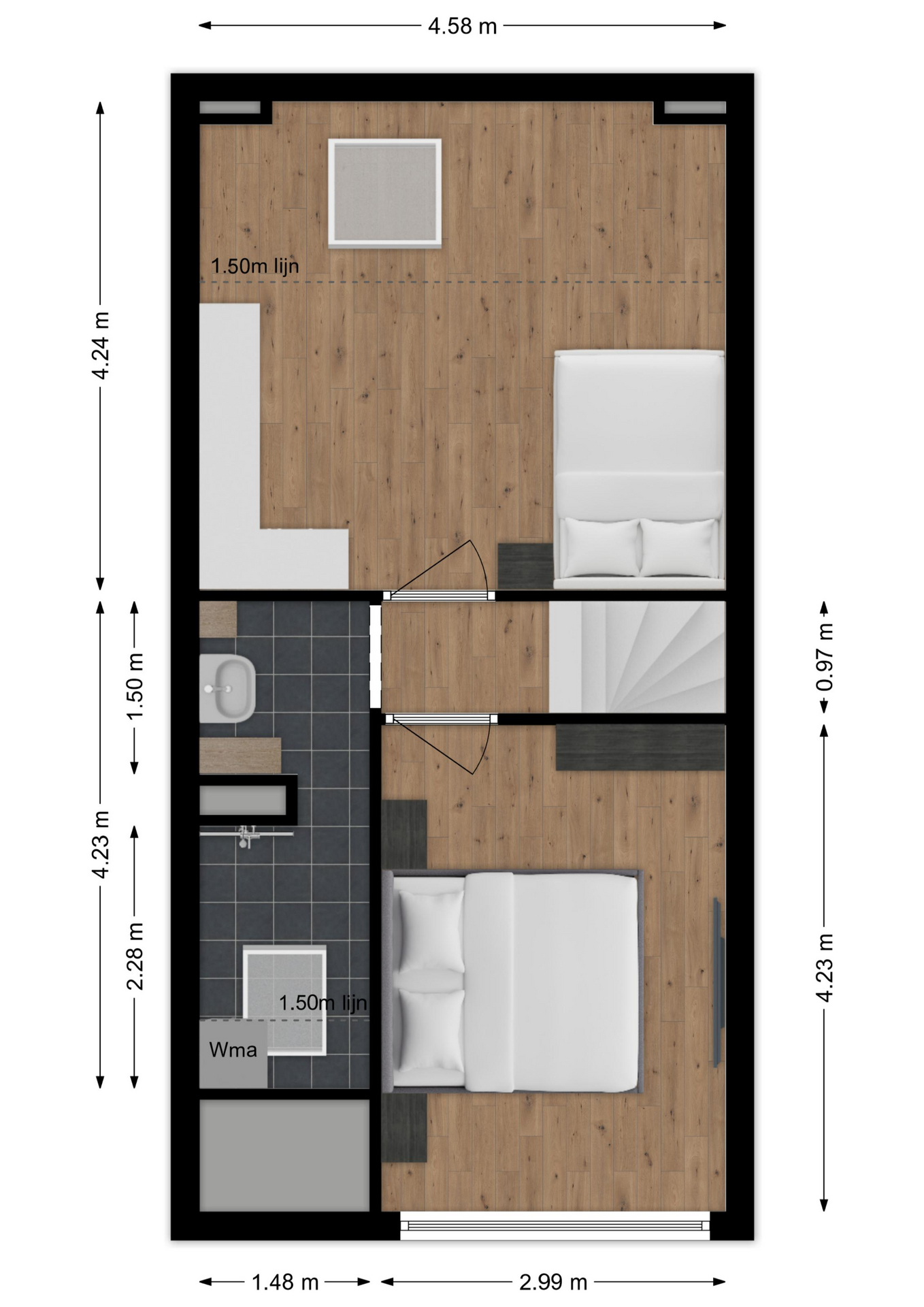 Aan de achterzijde is er over de volle breedte een tweede slaapkamer.