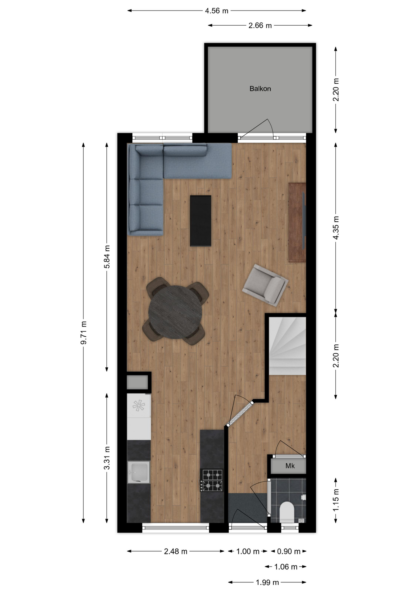 De woonkamer is heerlijk ruim van opzet waar u alle plaats heeft om een gezellige zit- en eethoek te creëren. Vanuit de kamer is er toegang tot het balkon van circa 2.66 x 2.20m. Aan de voorzijde vloeit de kamer over in de keuken.