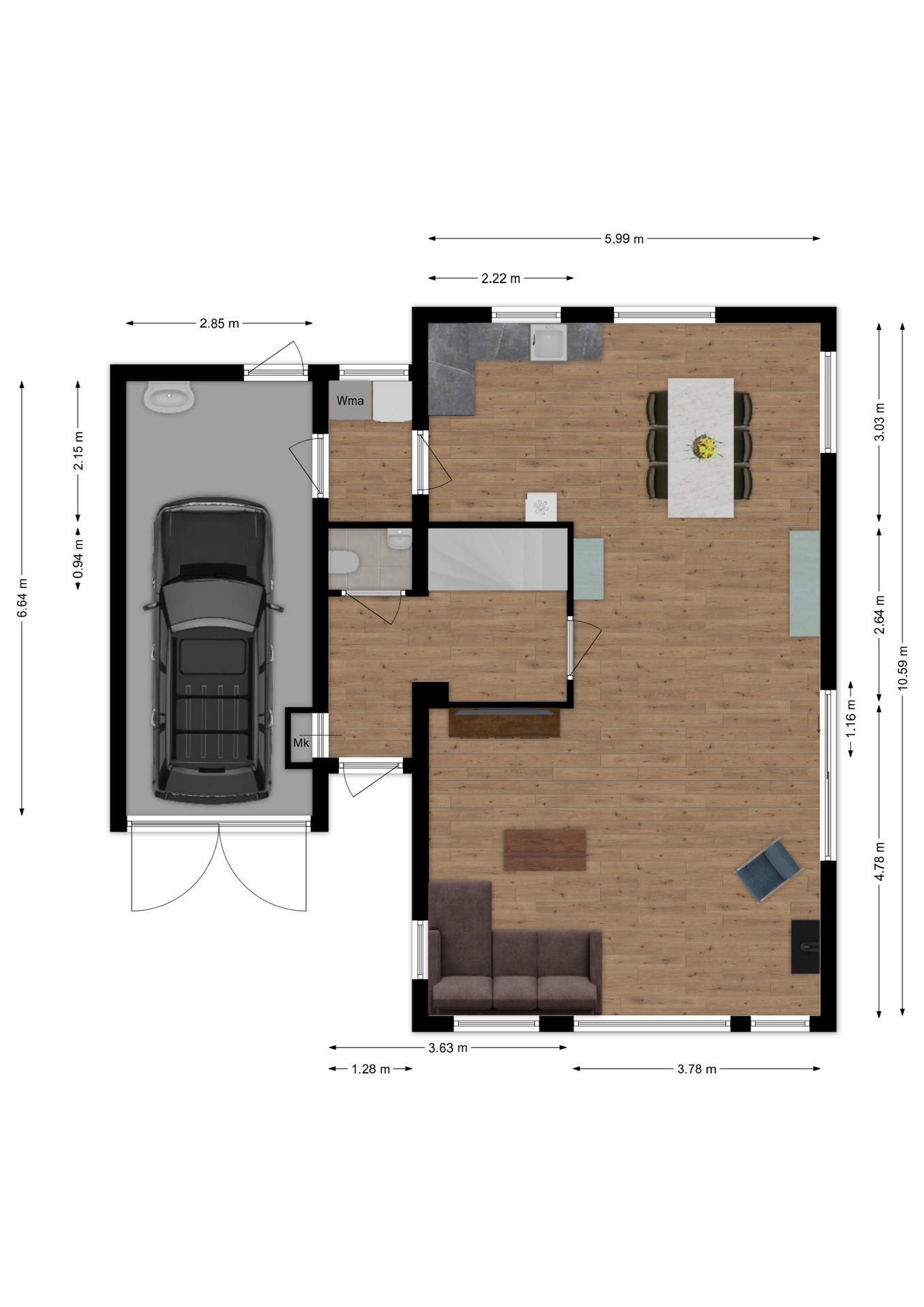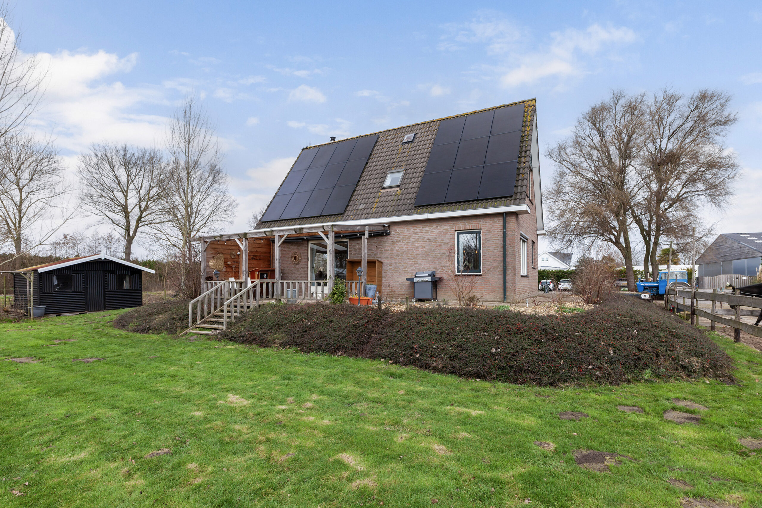 In de garage (circa 6.64 x 2.85m) kunt u uw auto parkeren doordat er twee openslaande deuren zijn aan de voorzijde, maar het biedt ook juist plaats voor het opbergen van jassen en schoenen e.d. Hier is ook de pomp van de vloerverwarming, omvormer van de 21 zonnepanelen, een wasbak en een radiator. Via de achterdeur nemen we een kijken rondom de woning, gaat u mee?