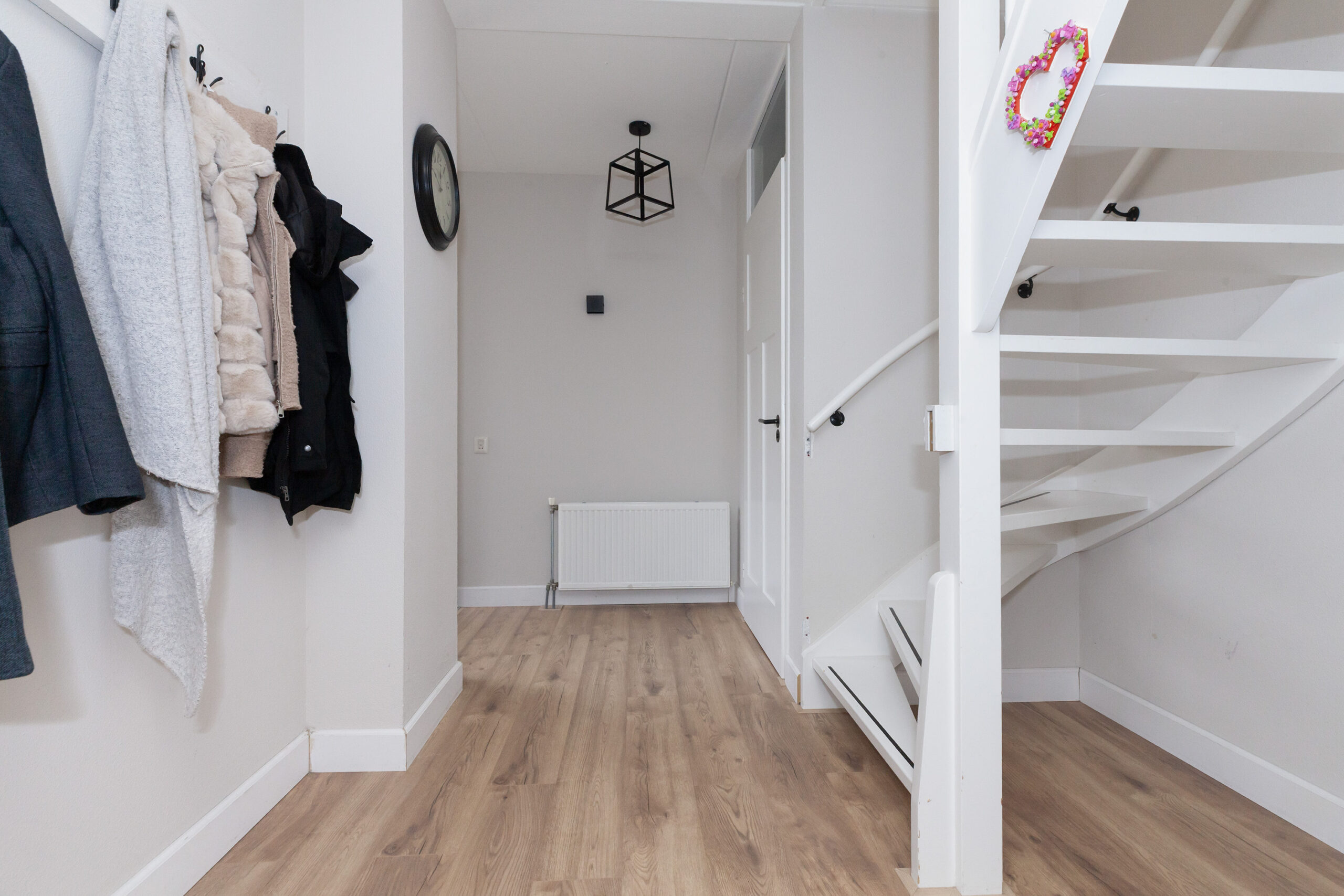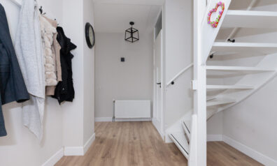 L-vormige hal. In deze ontvangstruimte is de meterkast, trap naar de eerste verdieping, toiletruimte en gaderobe. Aan het einde van de hal heeft u toegang tot de woonkamer.
