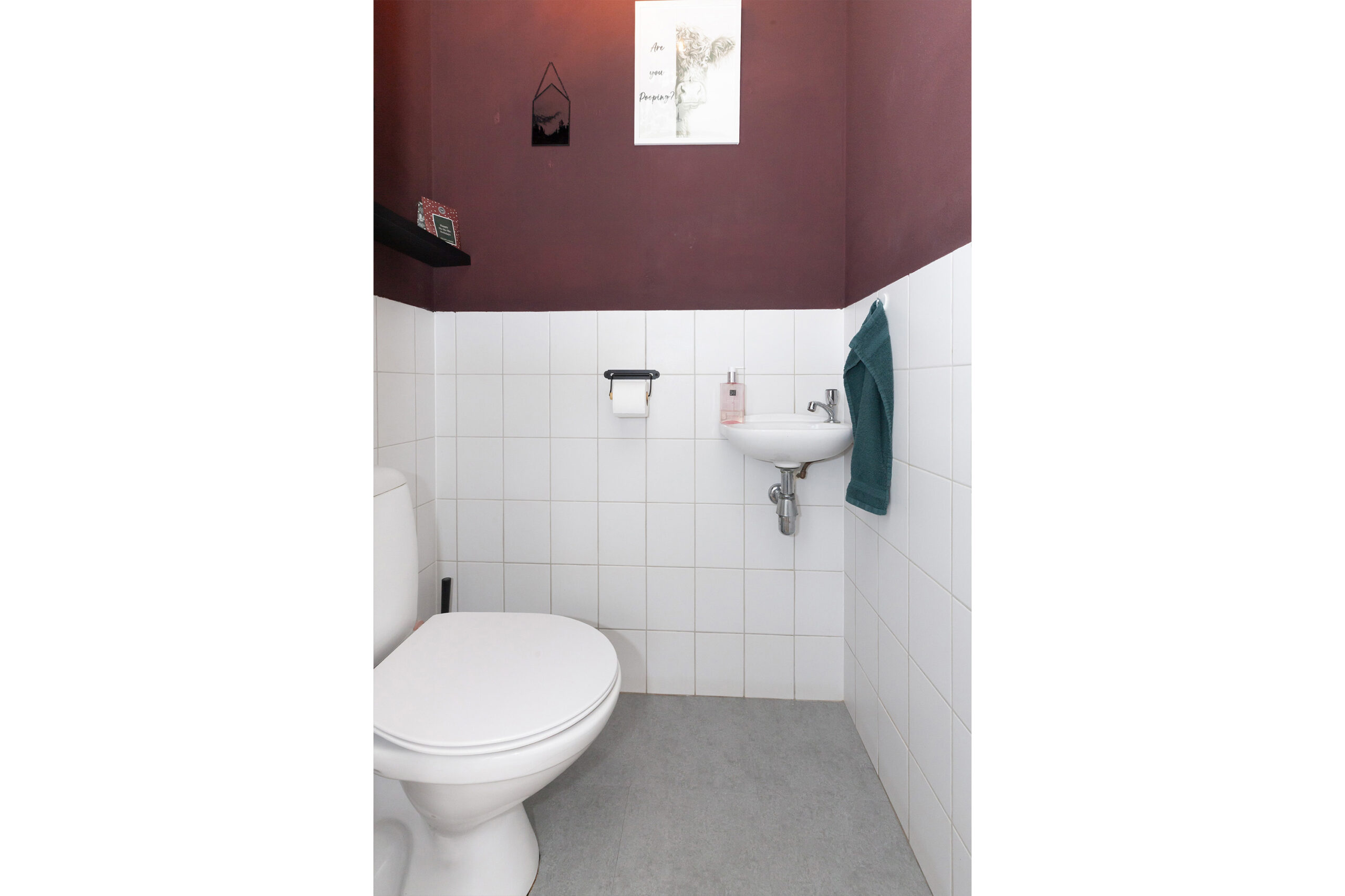 Nette toiletruimte voorzien van een staand toilet en een handwasfonteintje.