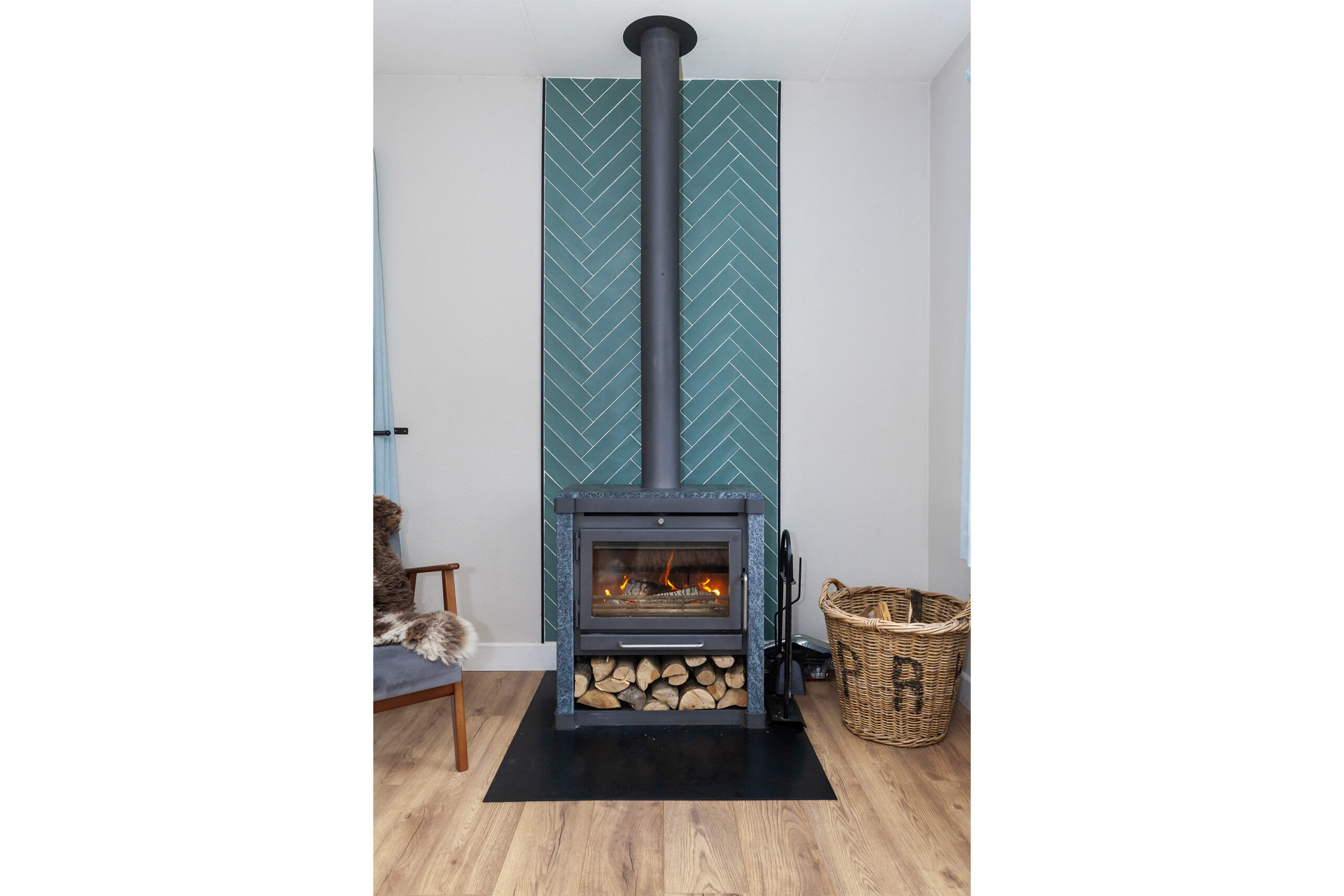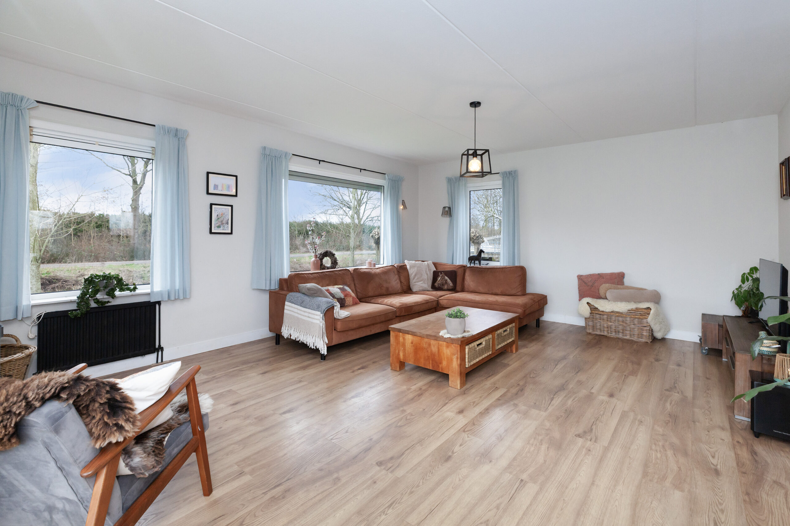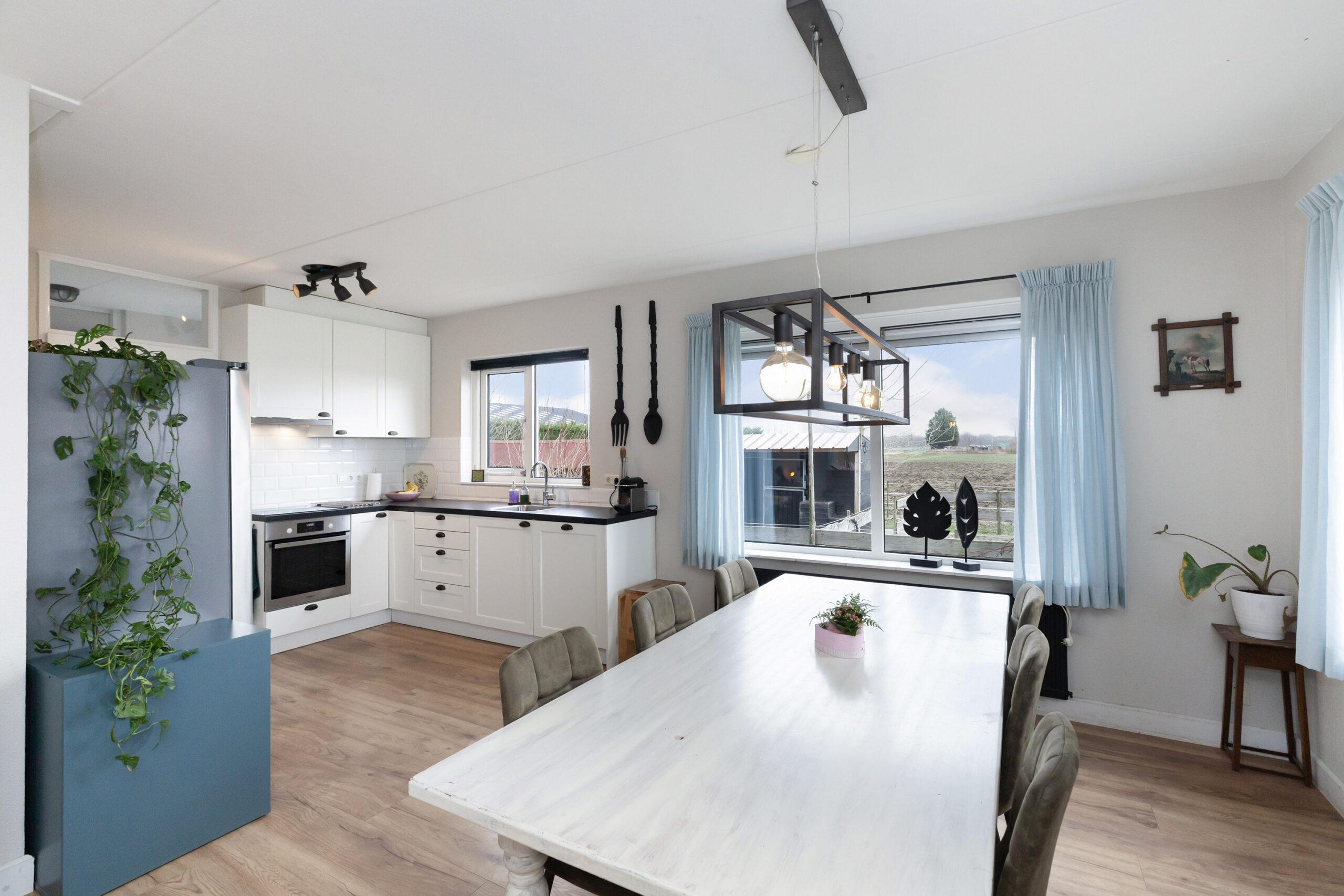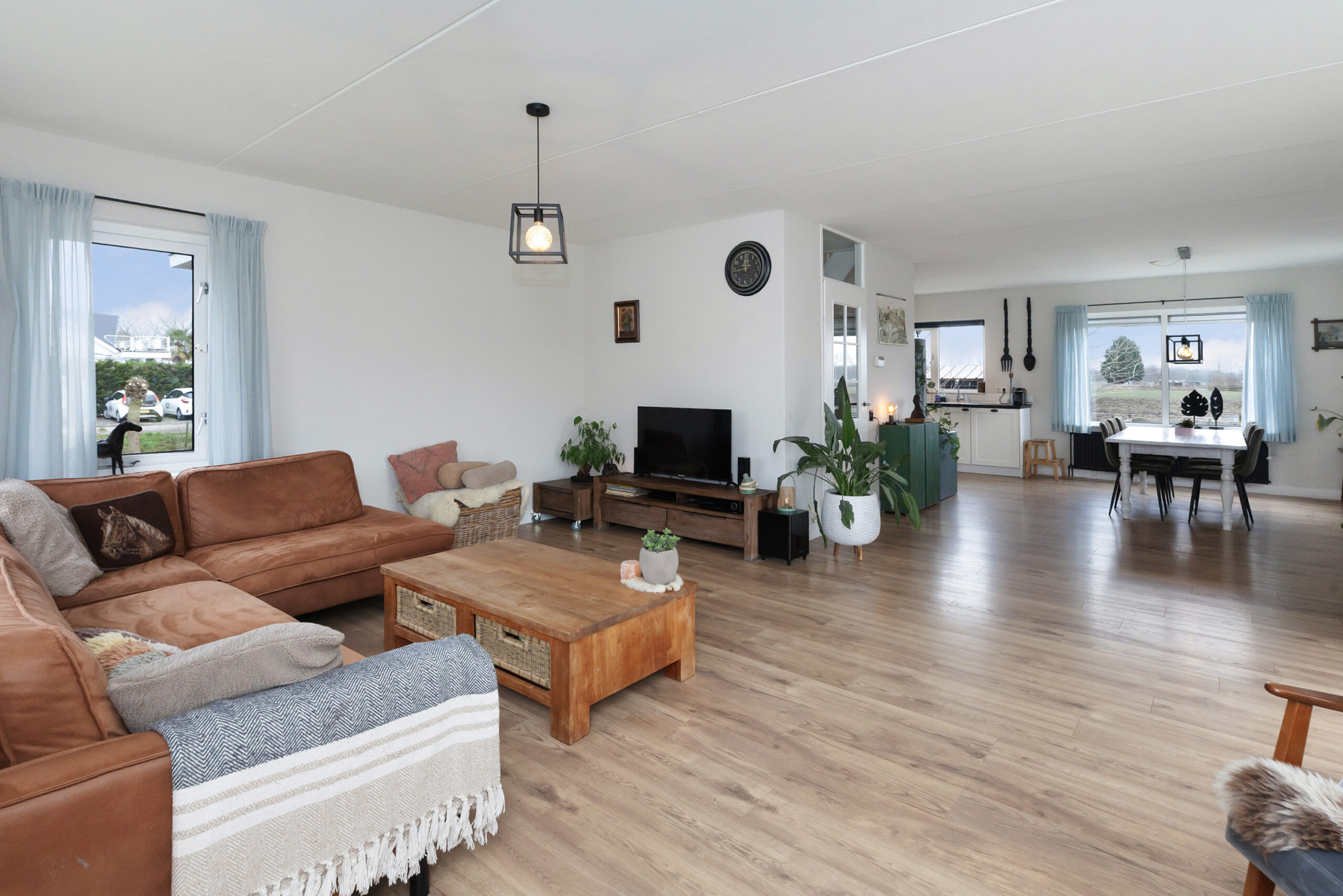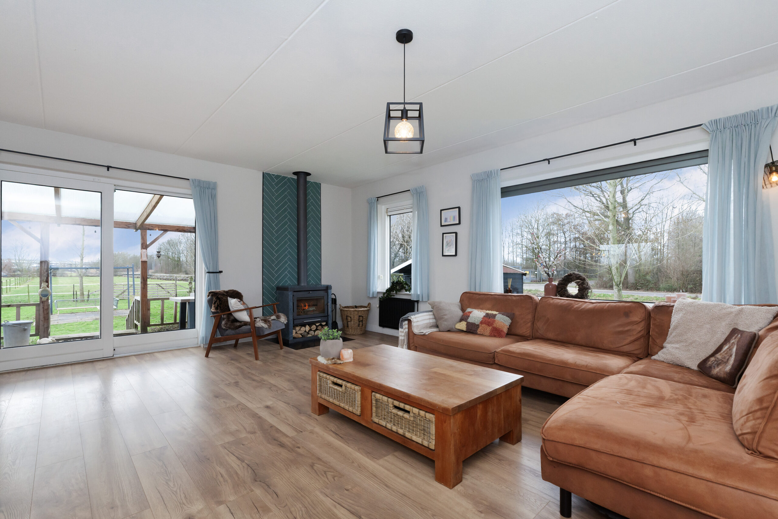 De woonkamer ligt tezamen met de keuken als het ware in een U-vorm rondom de hal. De zithoek is aan de voorzijde gegroepeerd bij de fraaie houtkachel. Doet u de schuifpui open, dan betrekt u het buitenleven direct met binnen. Daarnaast biedt het ook weids uitzicht over groene landerijen. De eethoek staat in open verbinding met keuken.