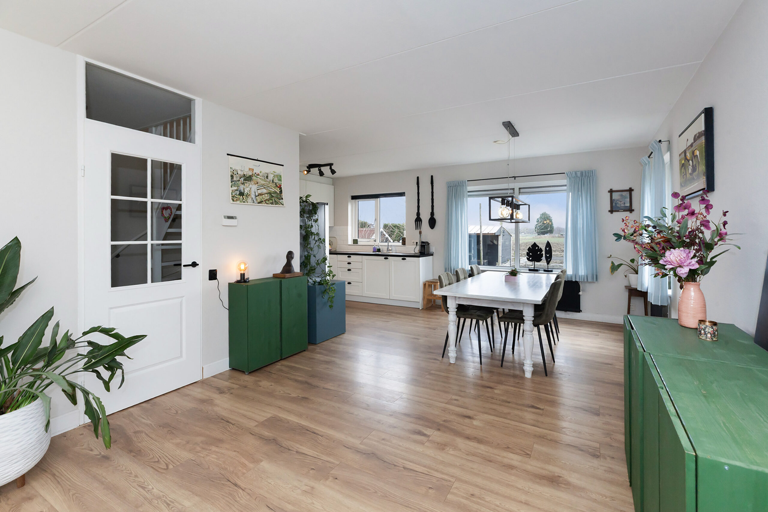 Als u via de voordeur binnenstapt, dan komt u in de ruime