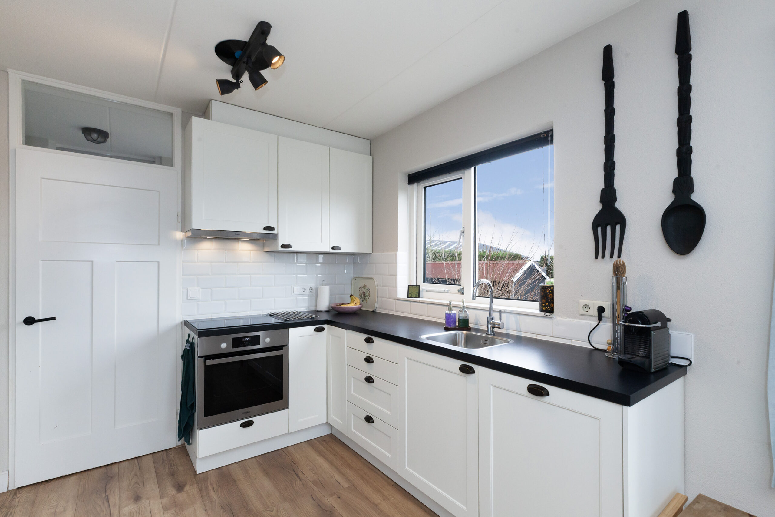 Geheel passend in stijl heeft de keuken een landelijke uitstraling. Aan de hoekopstelling is er beschikking over een inductiekookplaat, oven, afzuigkap, close-in boiler en vaatwasser. Aan de andere zijde heeft u de koel-/vriescombinatie. Vanuit de keuken komt in de bijkeuken.