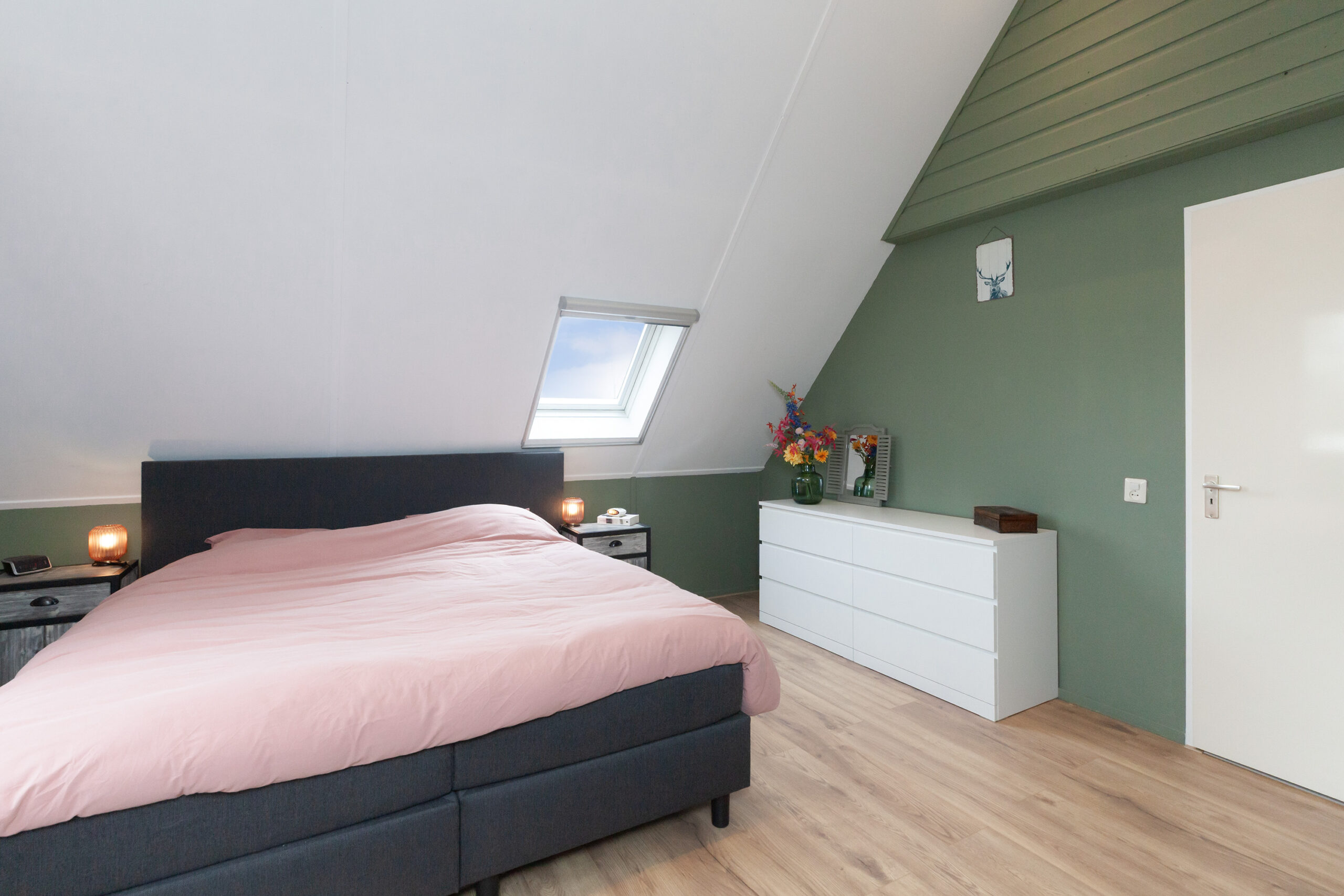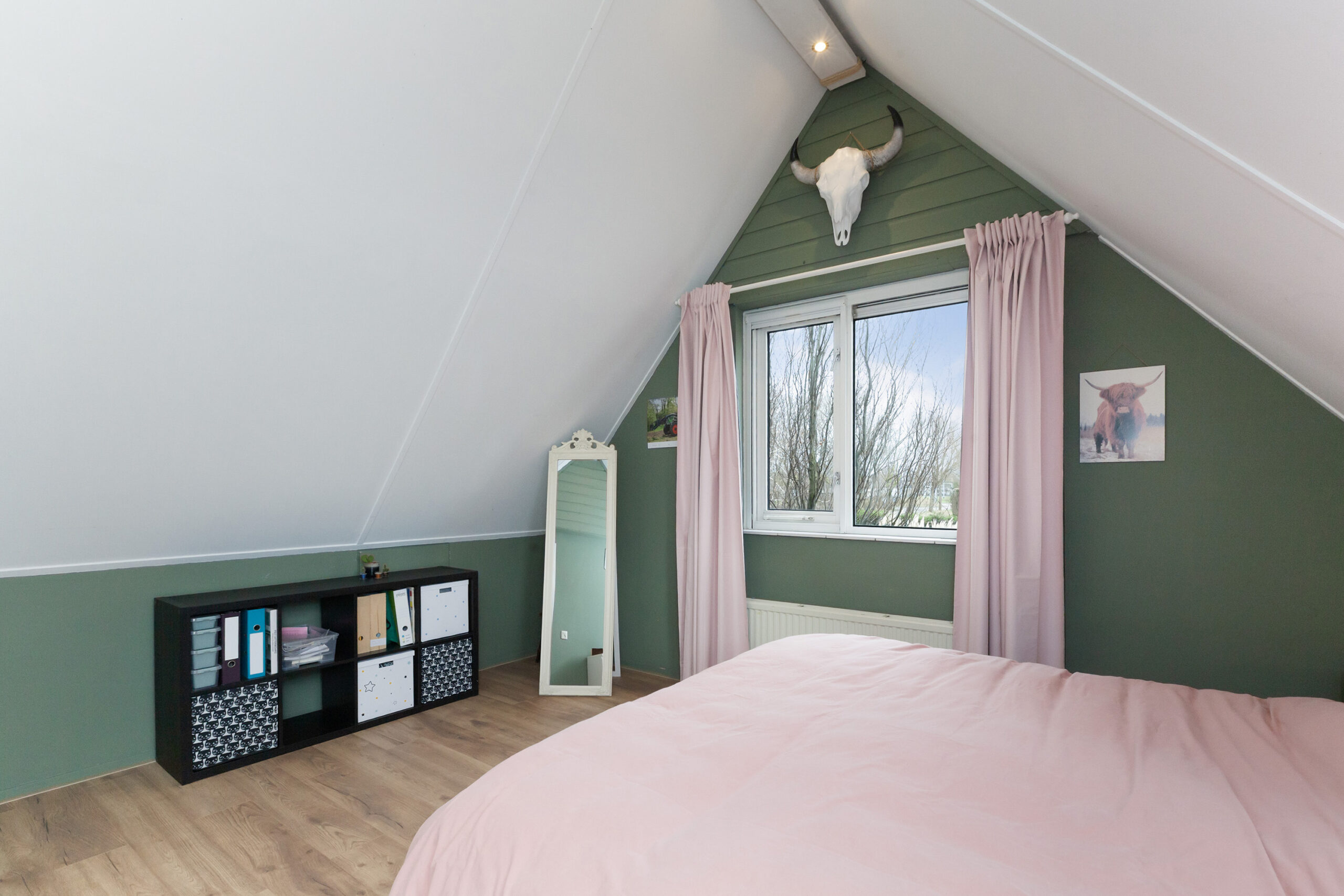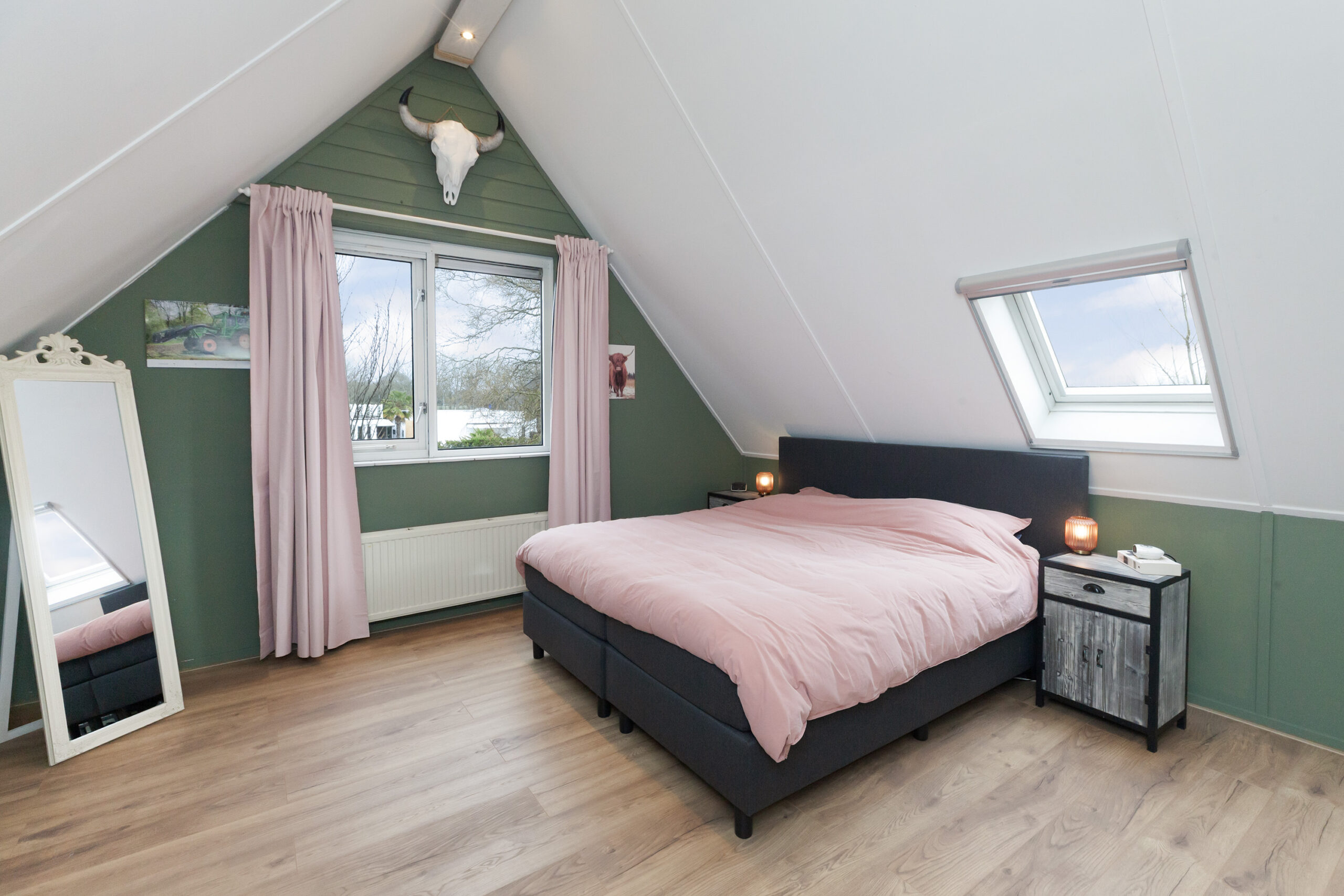 Tot slot deze slaapkamer aan de achterzijde. Dit is heerlijk wakker worden toch? De ramen open en u geniet van vrij zicht! Onder het schuine dak is opbergruimte.