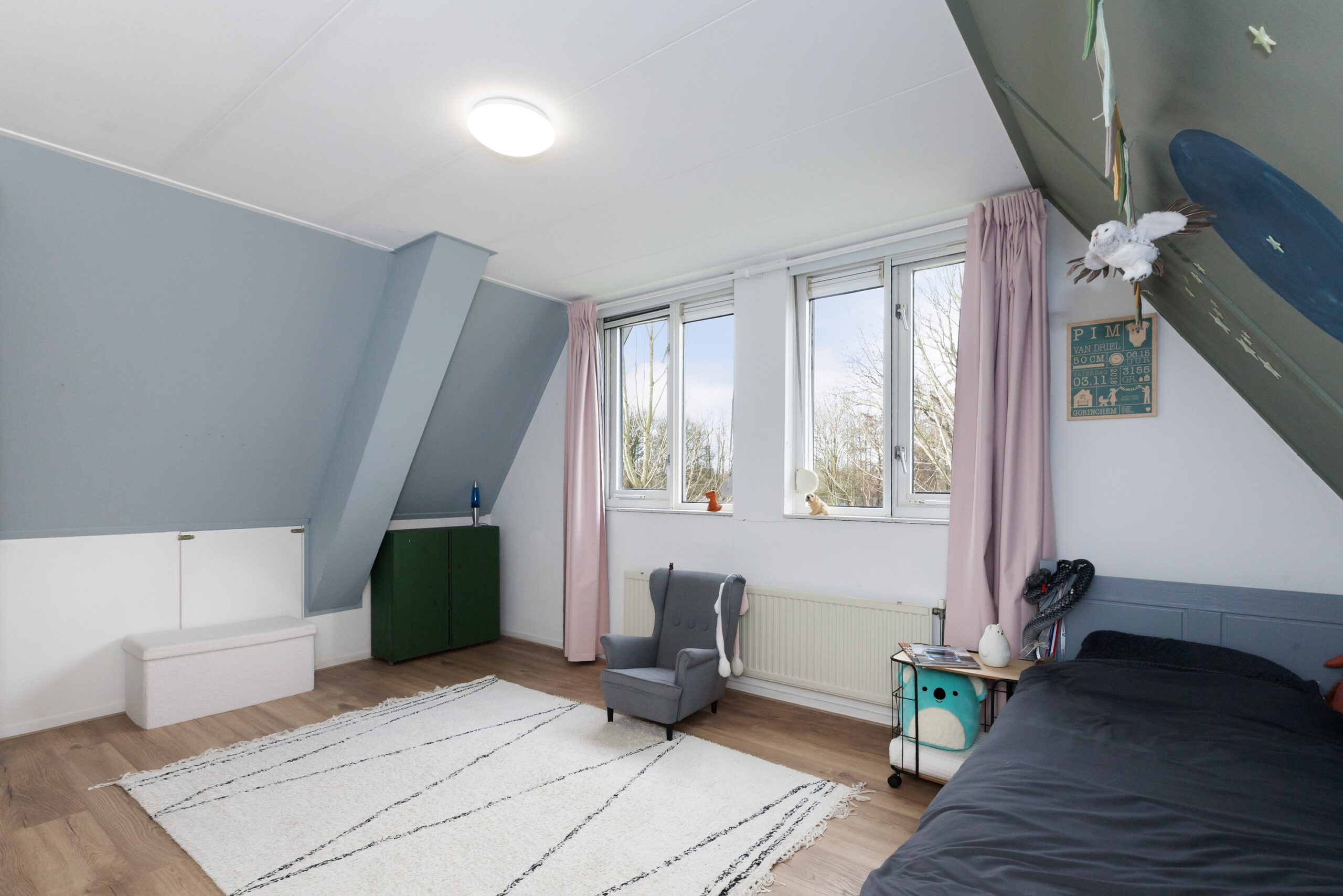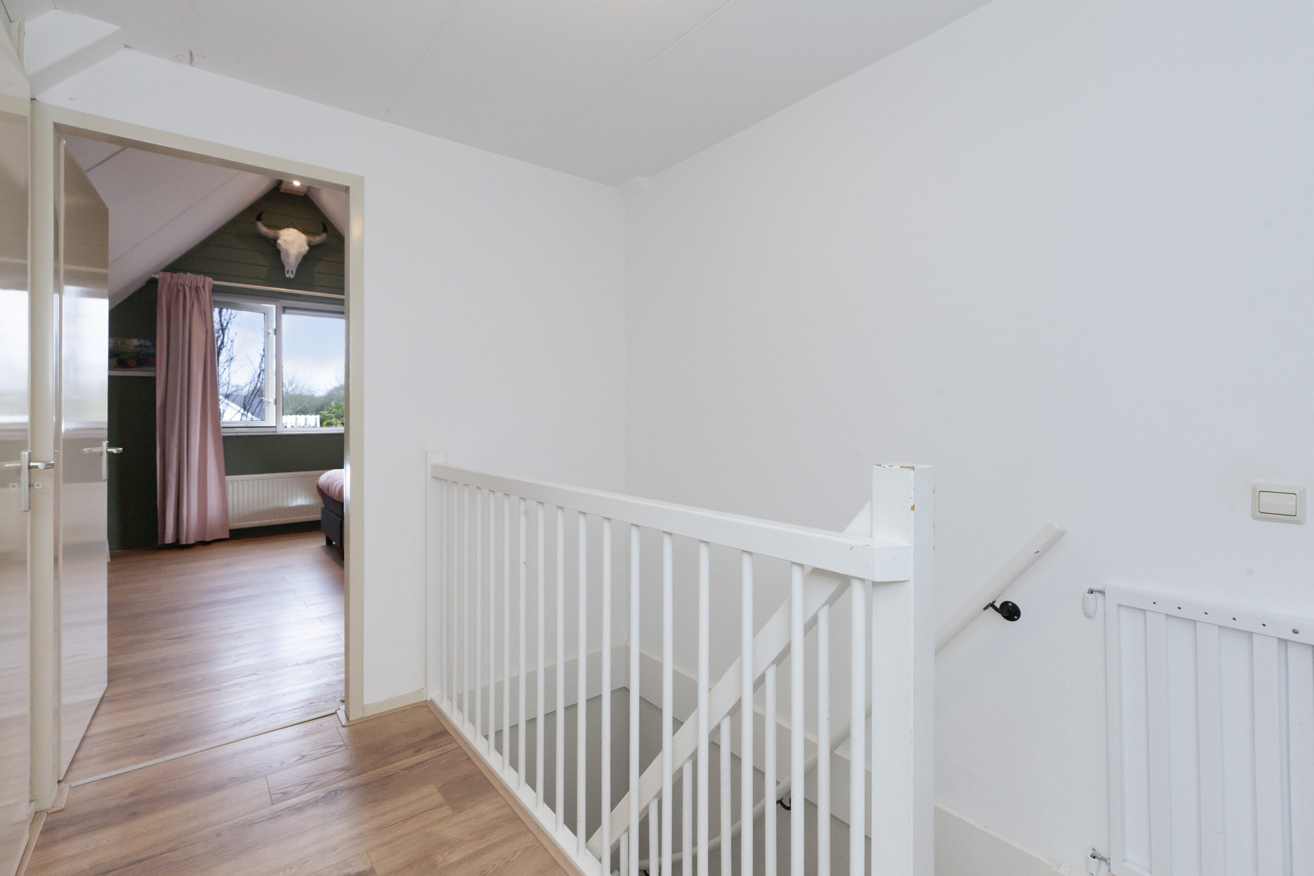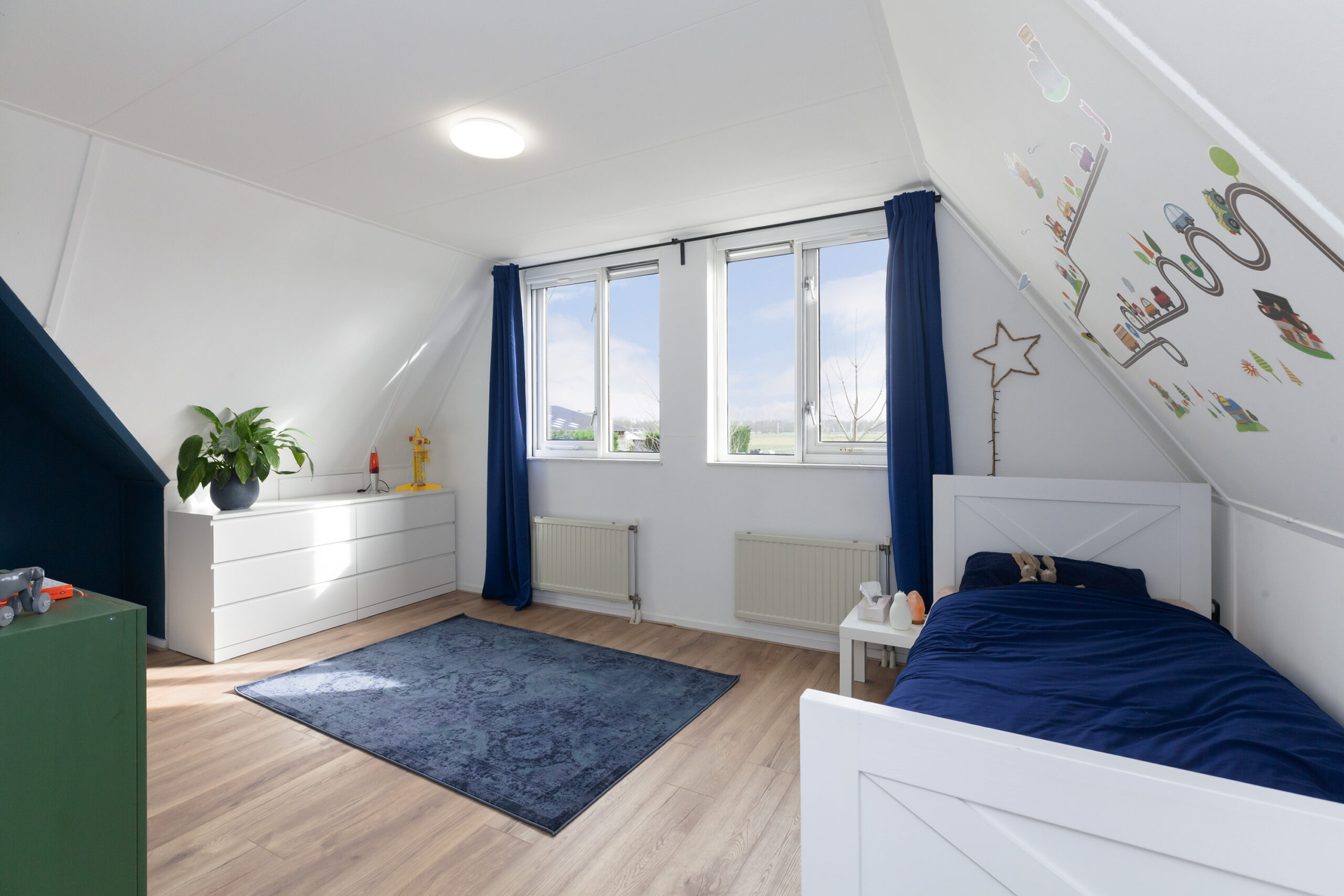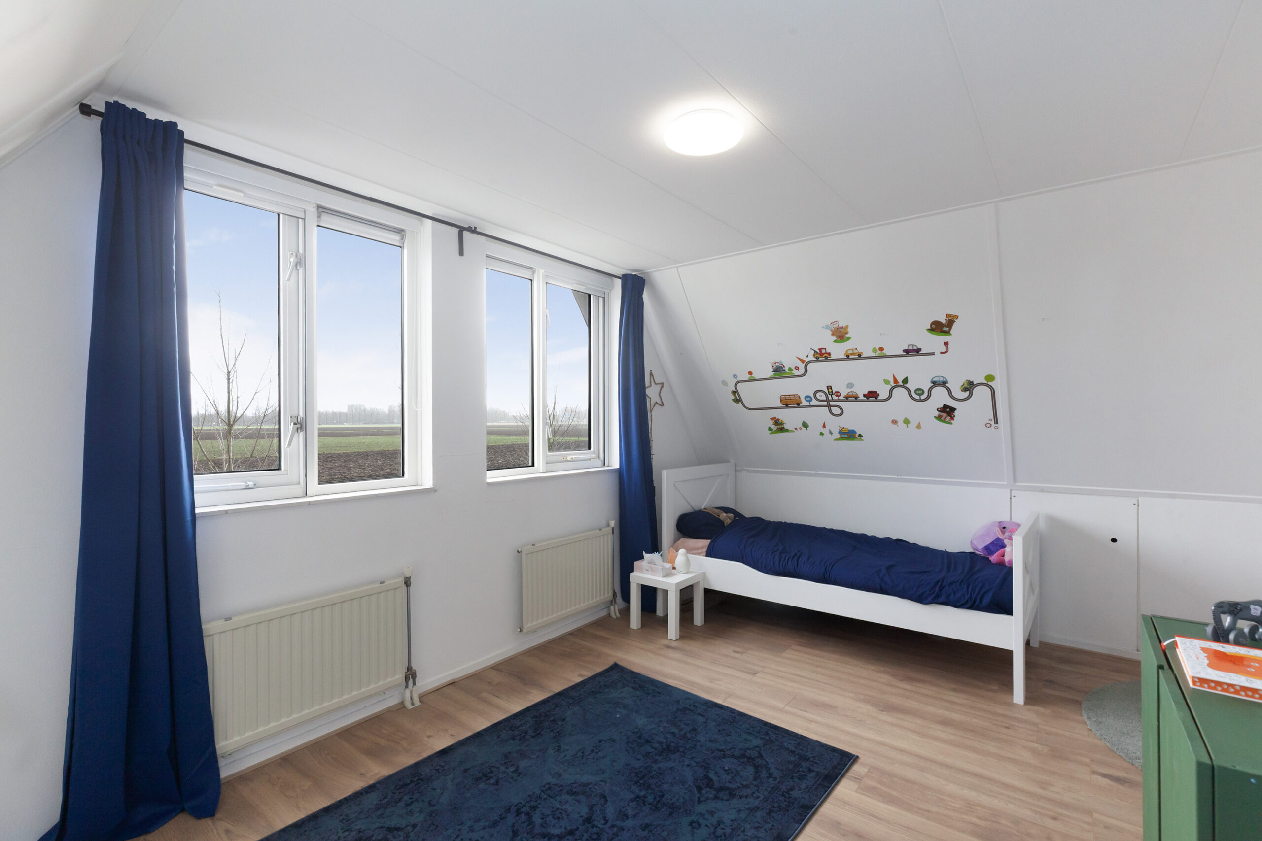Tot slot deze slaapkamer aan de achterzijde. Dit is heerlijk wakker worden toch? De ramen open en u geniet van vrij zicht! Onder het schuine dak is opbergruimte.