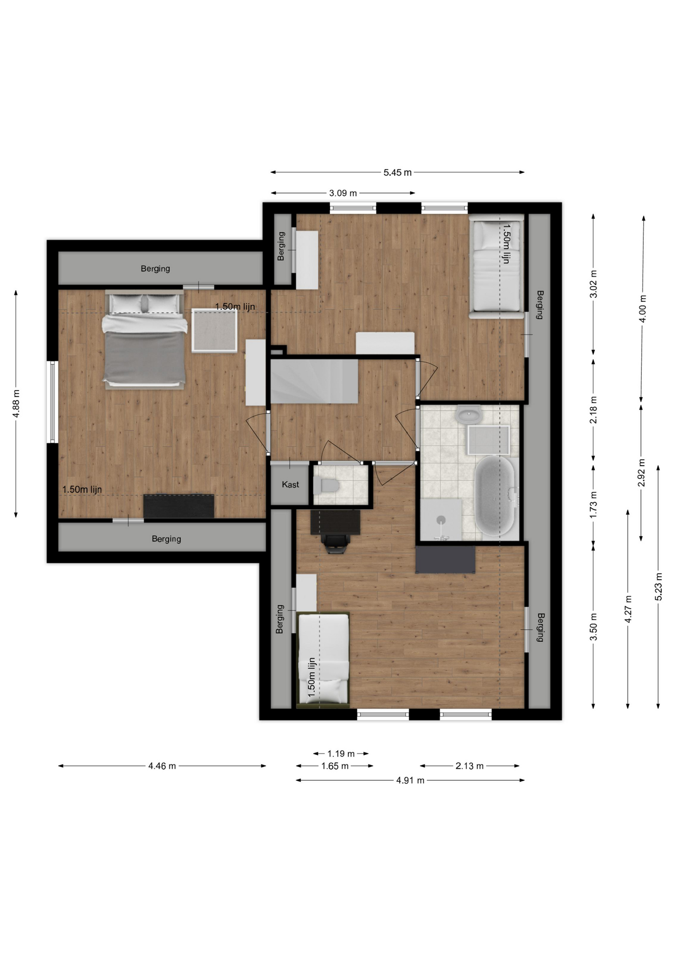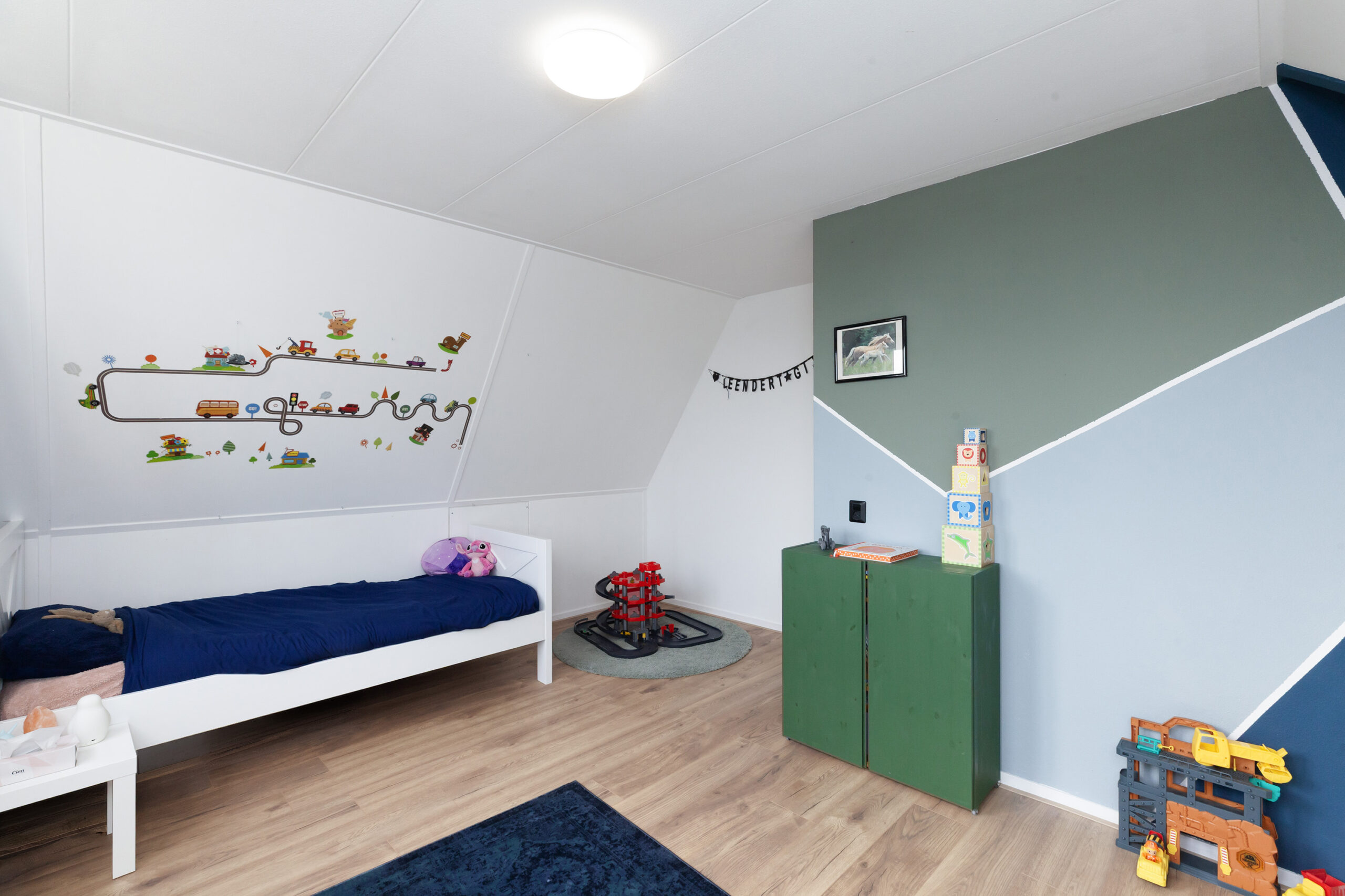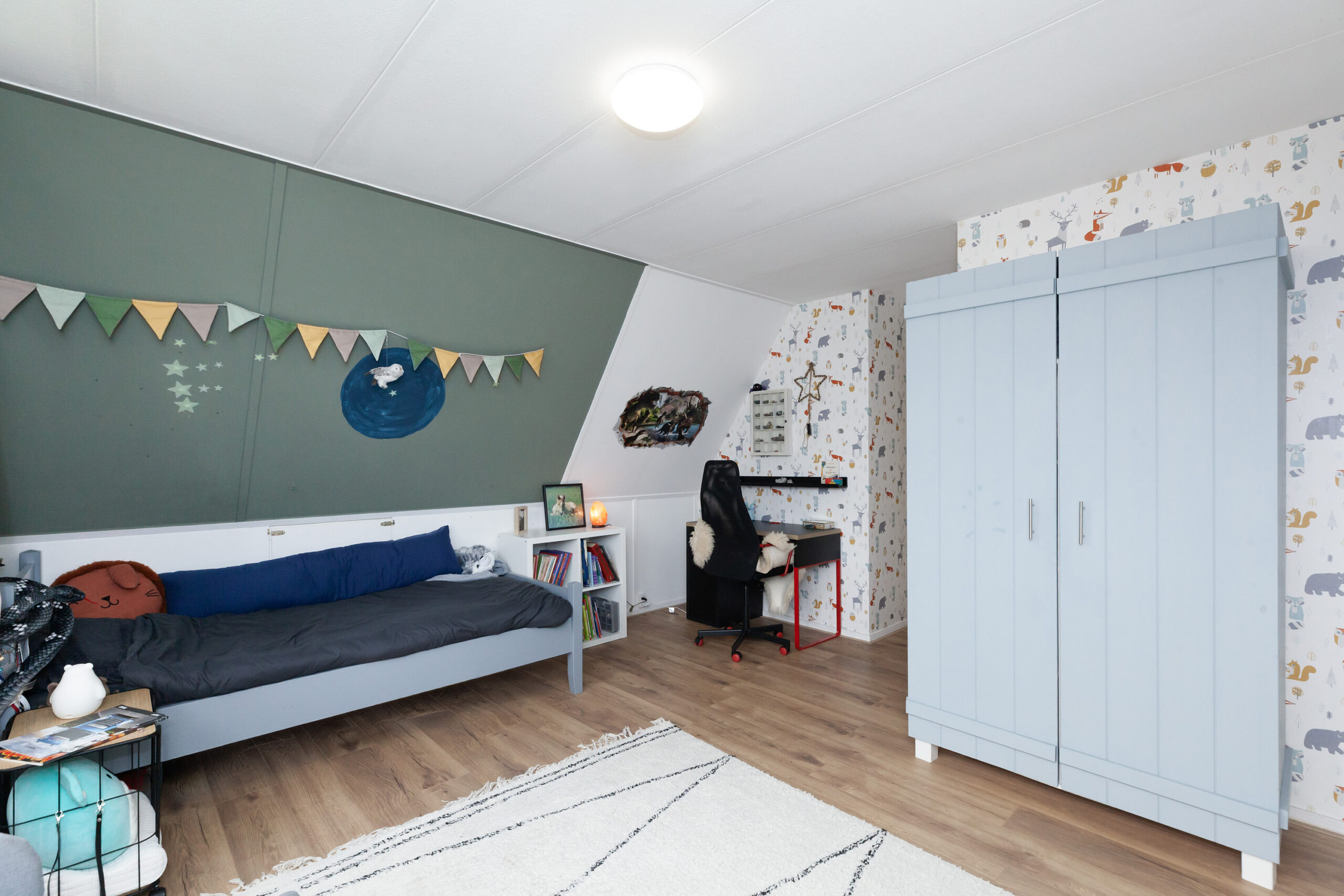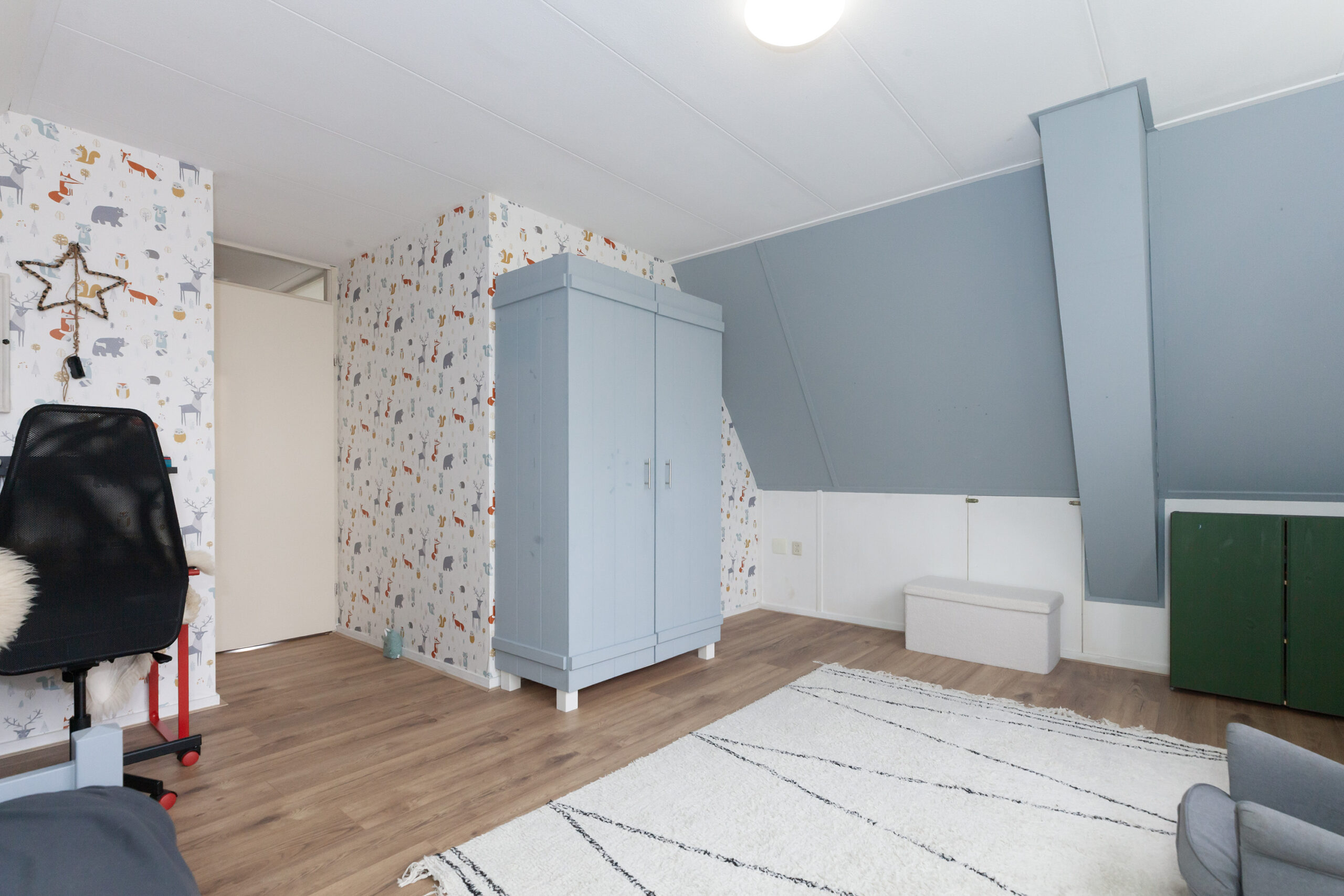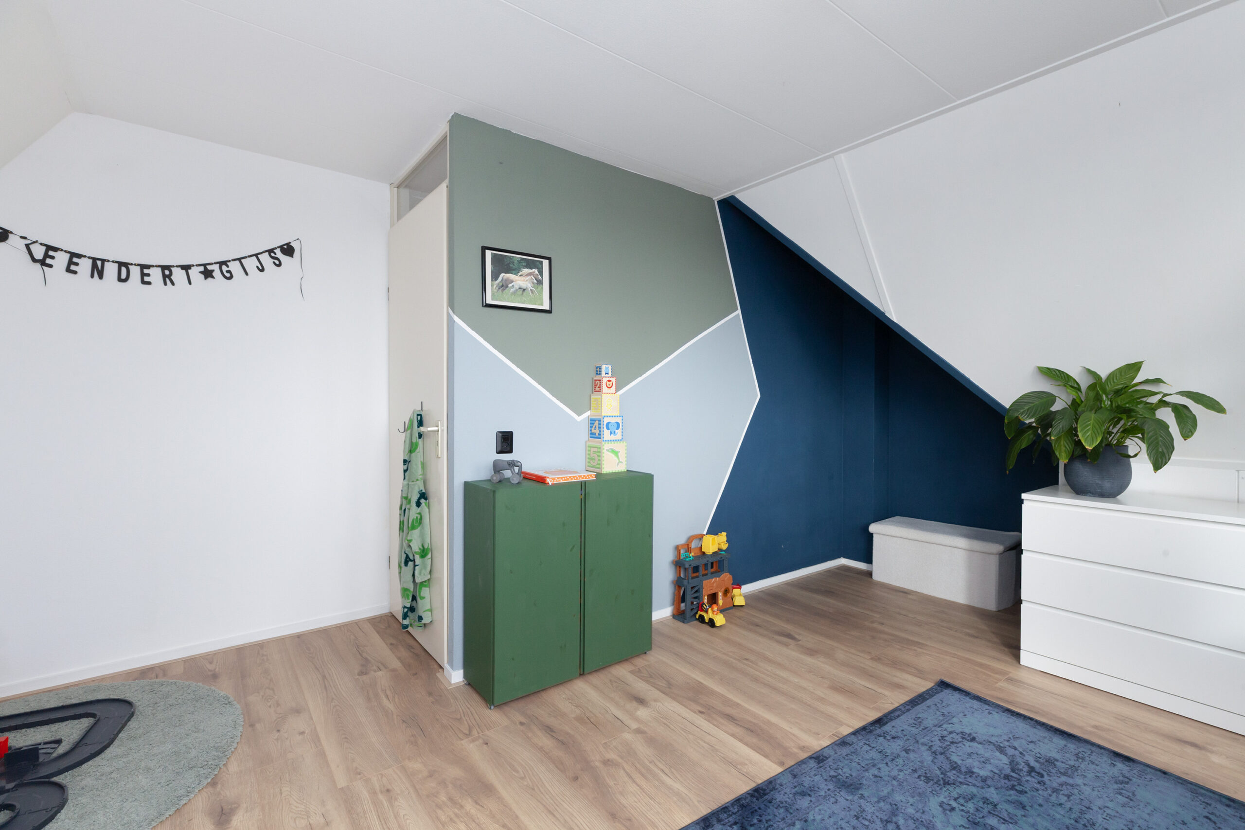 Aan de voorzijde is deze tweede slaapkamer, welke ook over bergruimte beschikt onder het schuine dak.