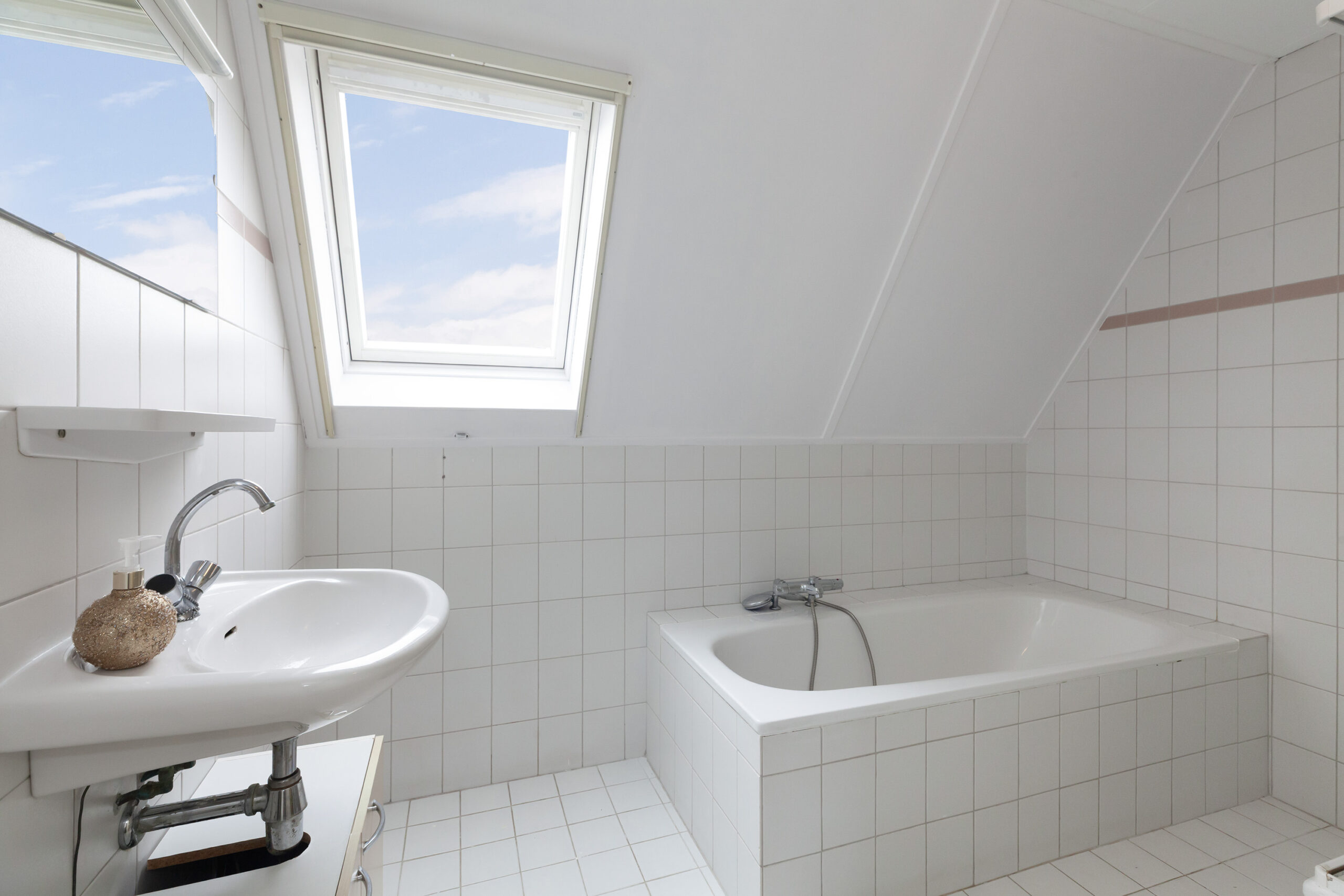 De badkamer is in lichte kleurstellingen uitgevoerd en voorzien van een bad, douchecabine en een wastafel met meubel. Tevens is er een tuimelraam.