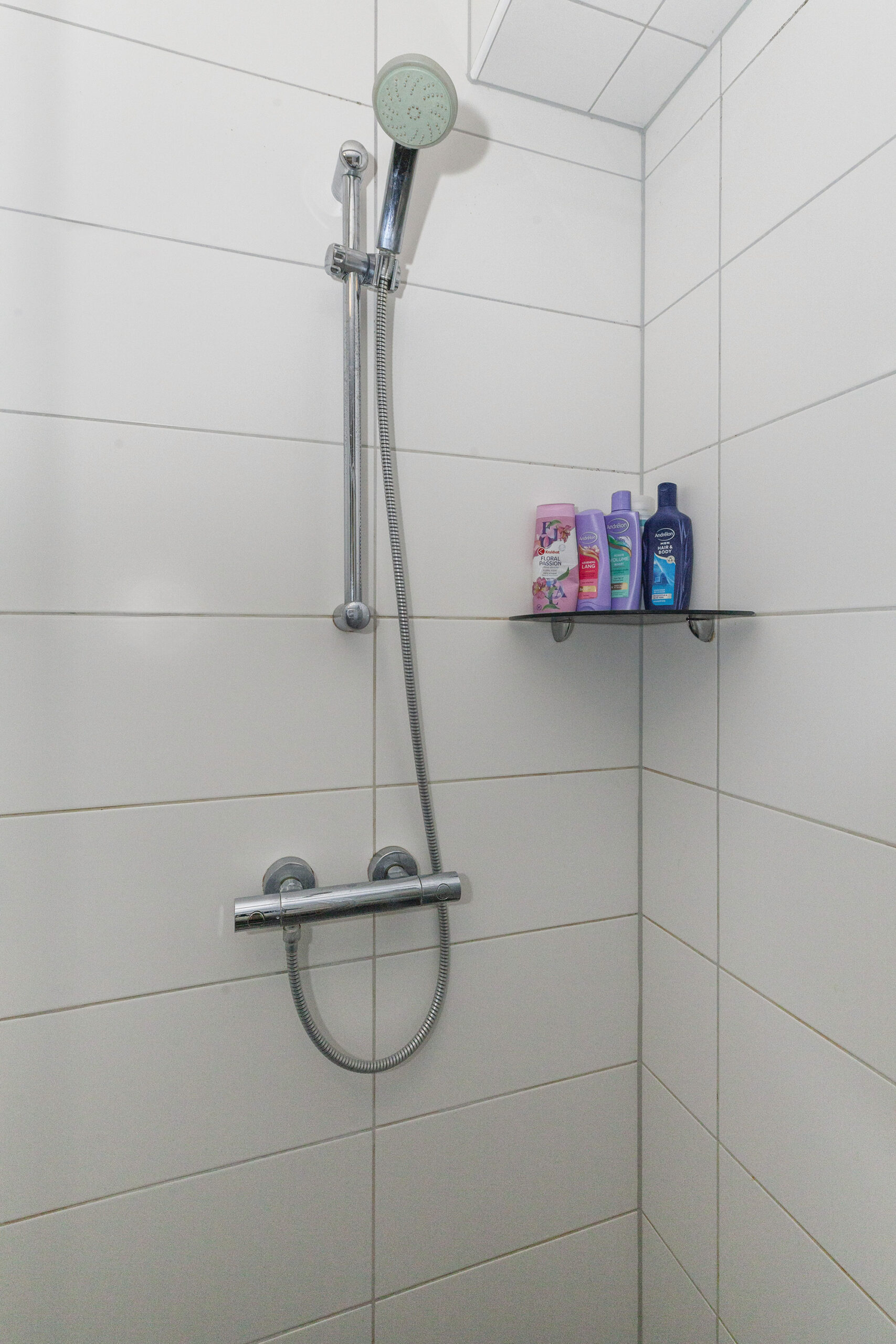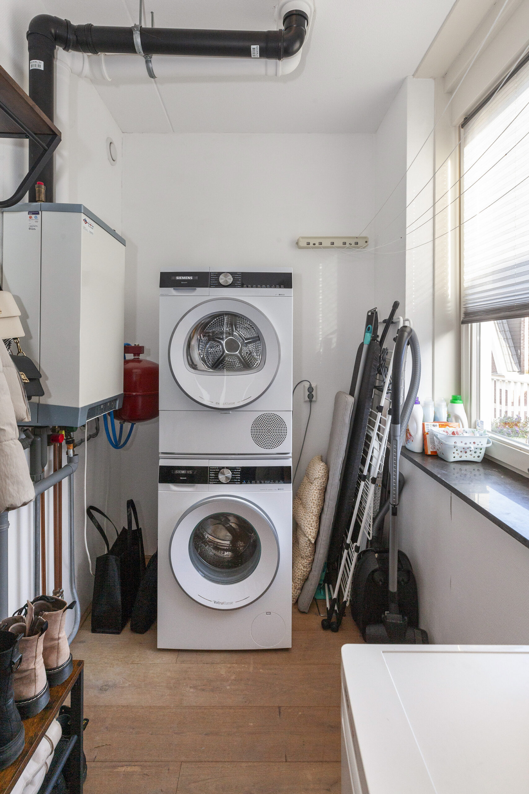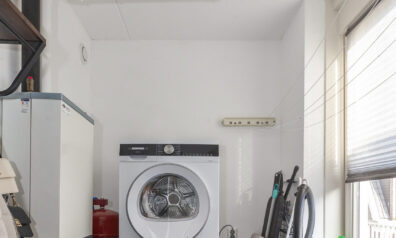 Aan de voorzijde is deze kamer in gebruik als wasruimte doordat hier de aansluitingen zijn voor de wasmachine en de droger. Daarbij hangt hier ook de C.V.-ketel.