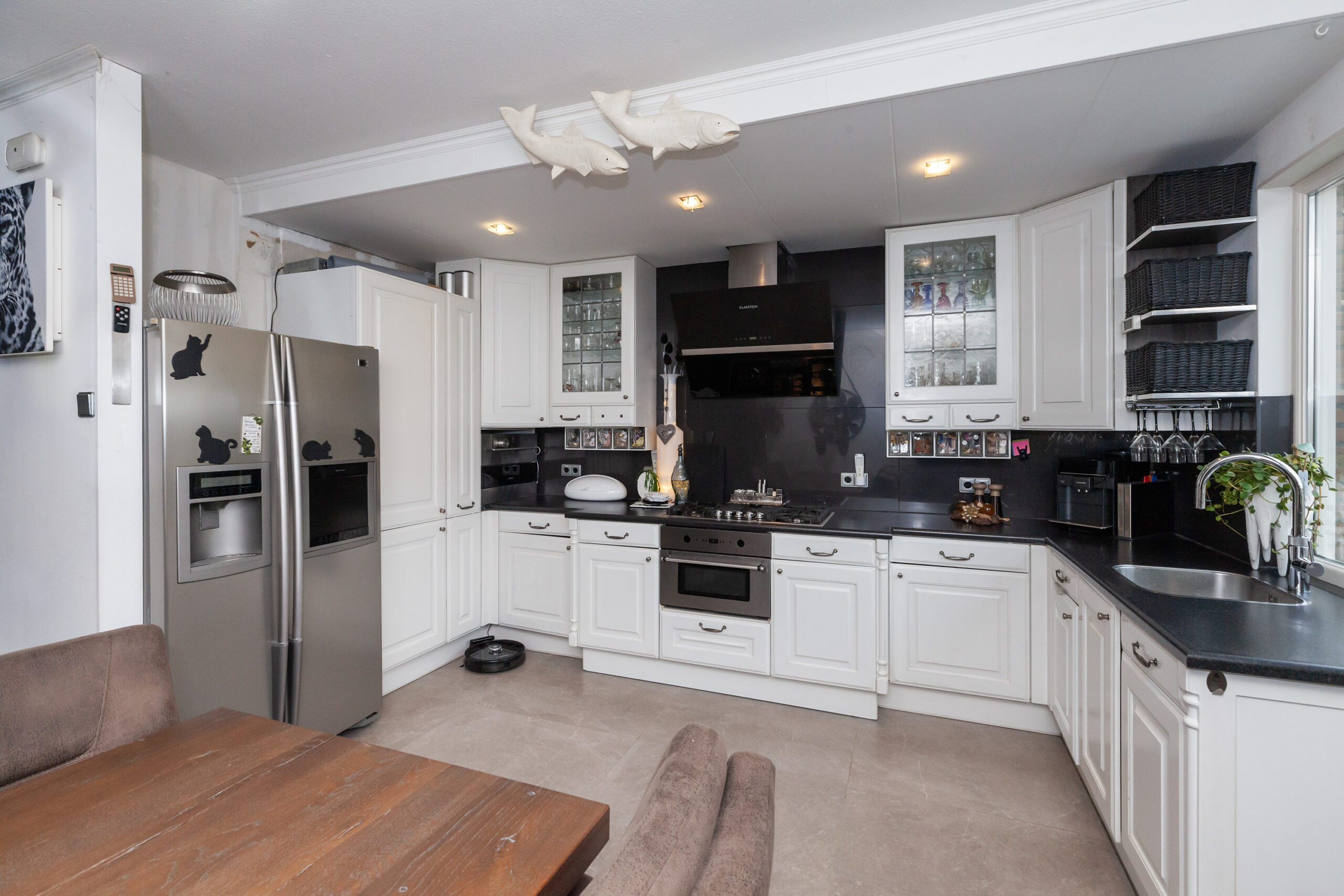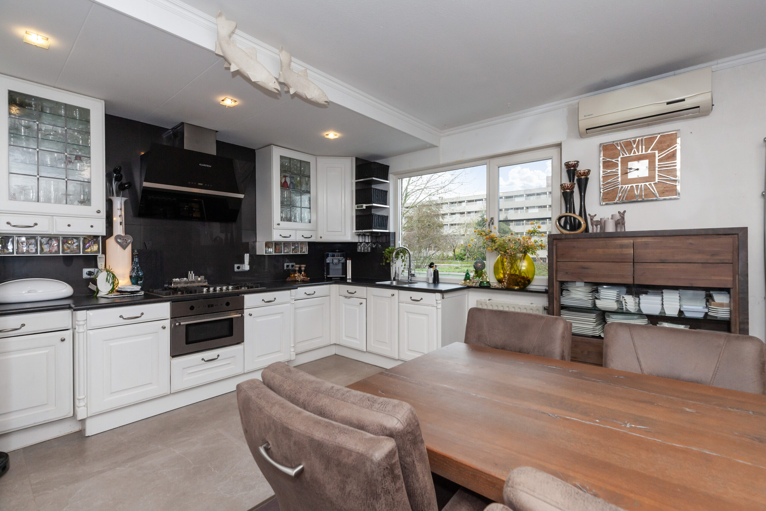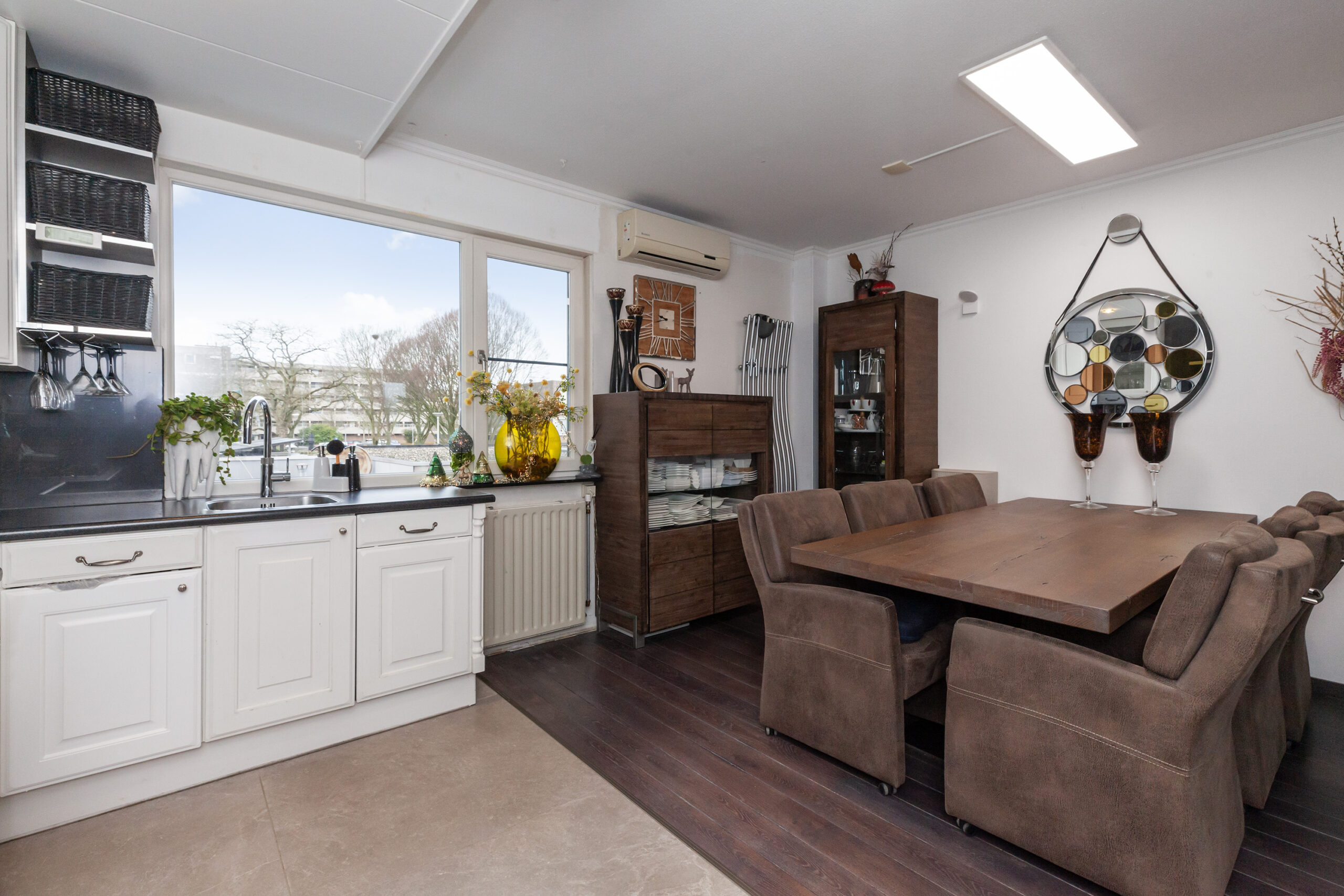 Aan de achterzijde is deze ruim opgezette woonkeuken. Tevens hangt hier ook een airco. De keuken is voorzien van allerlei inbouwapparatuur zoals een 5-pits gaskookplaat, afzuigkap, combimagnetron, vaatwasser en een Quooker. Tevens is er een koel-/vriescombinatie (ter overname). Naast de keuken kunt u een gezellige eethoek creëren.