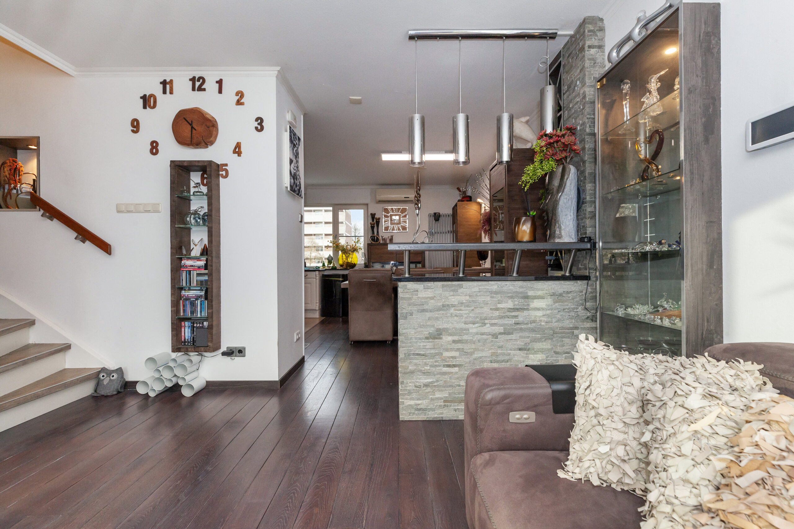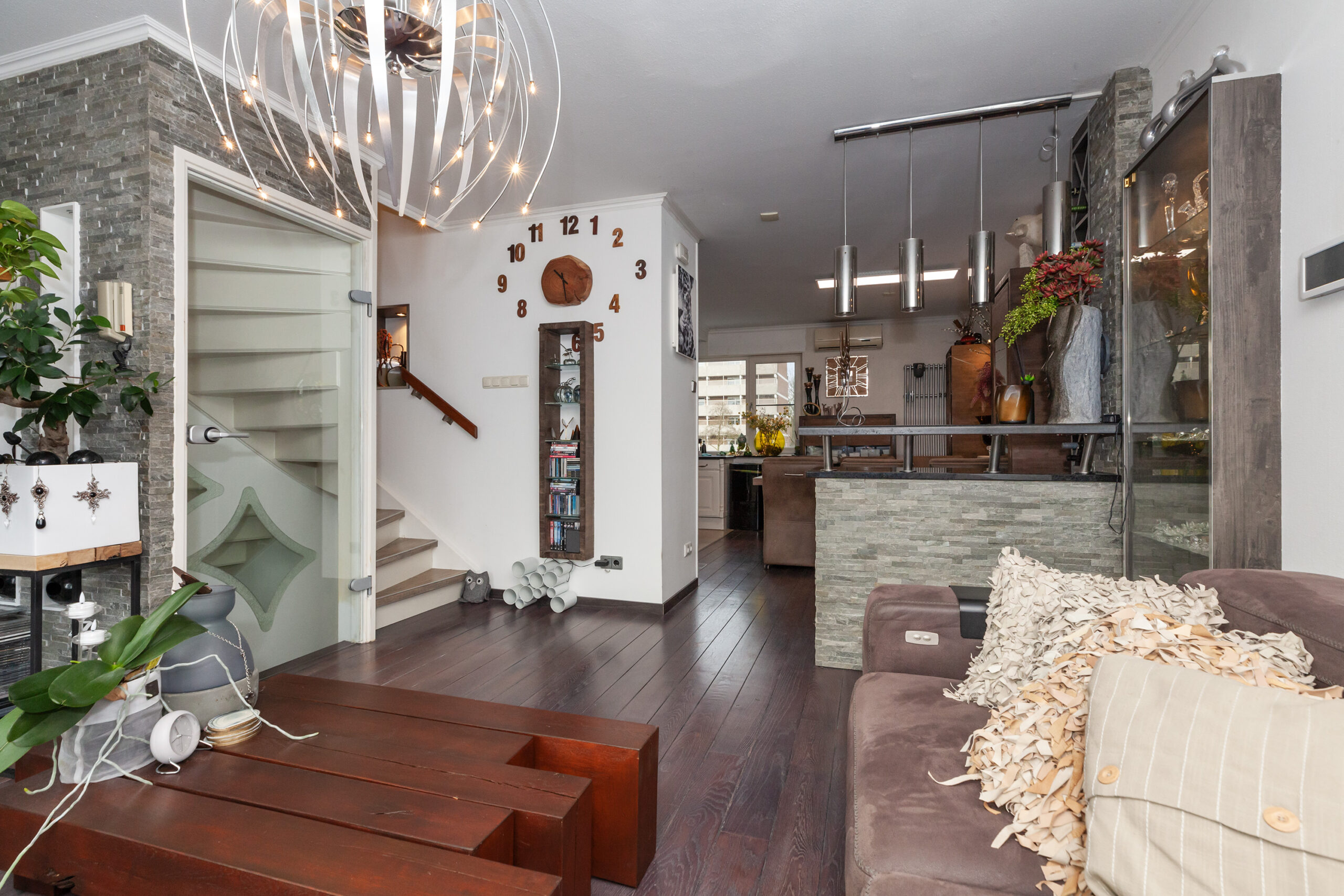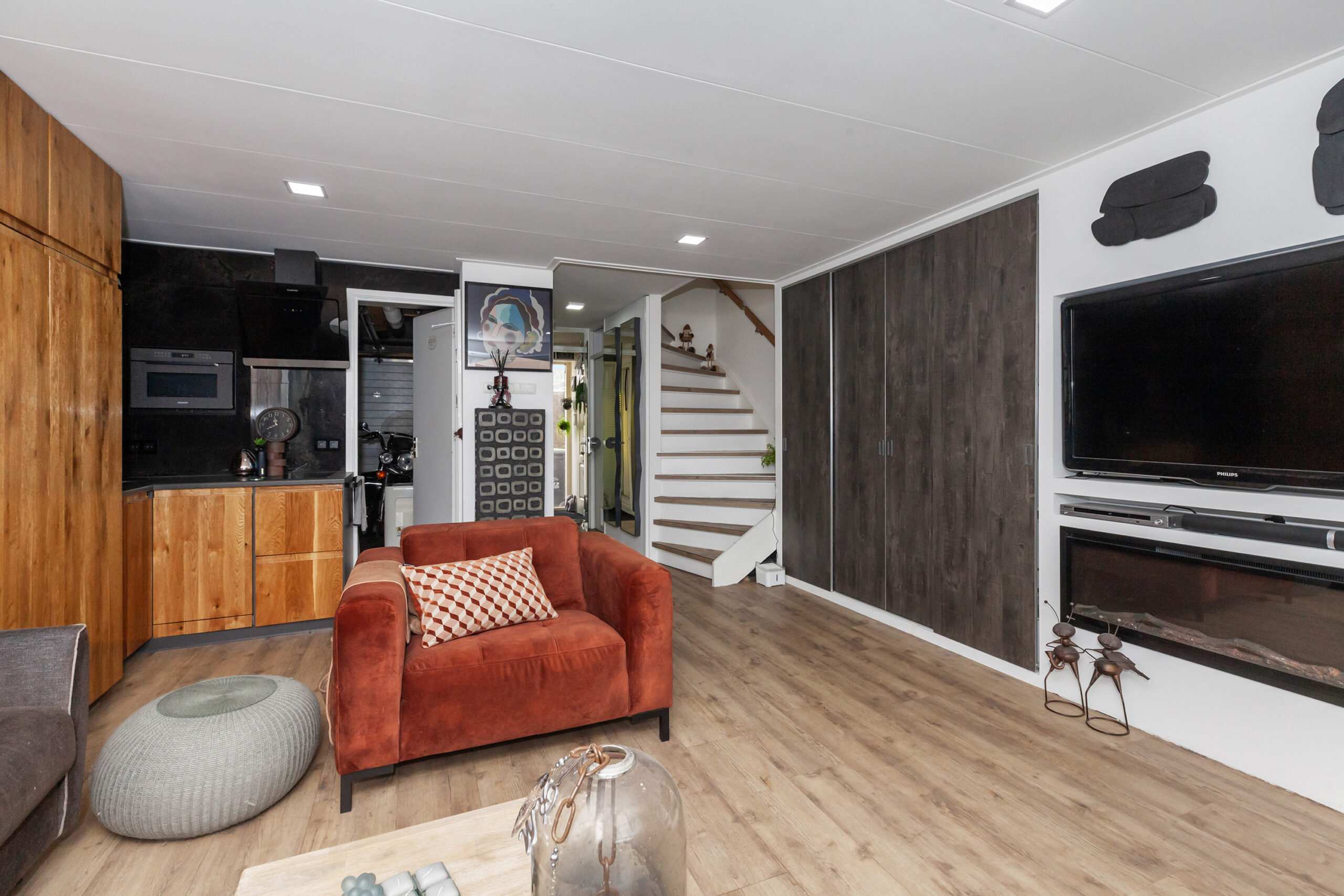 Zodra u vanuit de hal de glazen deur neemt, heeft u aan beide zijden vaste kasten met in één van de kasten ook de meterkast. Loopt u voorbij de trapopgang naar de verdieping, dan komt u in deze gezellige woonkamer met keuken. Ook hier zijn vele inbouwkasten. In de hoek heeft u de keuken welke voorzien is van een inductiekookplaat, koelkast en in de kast zijn de aansluitingen voor uw wasapparatuur. Daarnaast is er toegang tot de garage. Via de grote schuifpui komt u in de serre.
