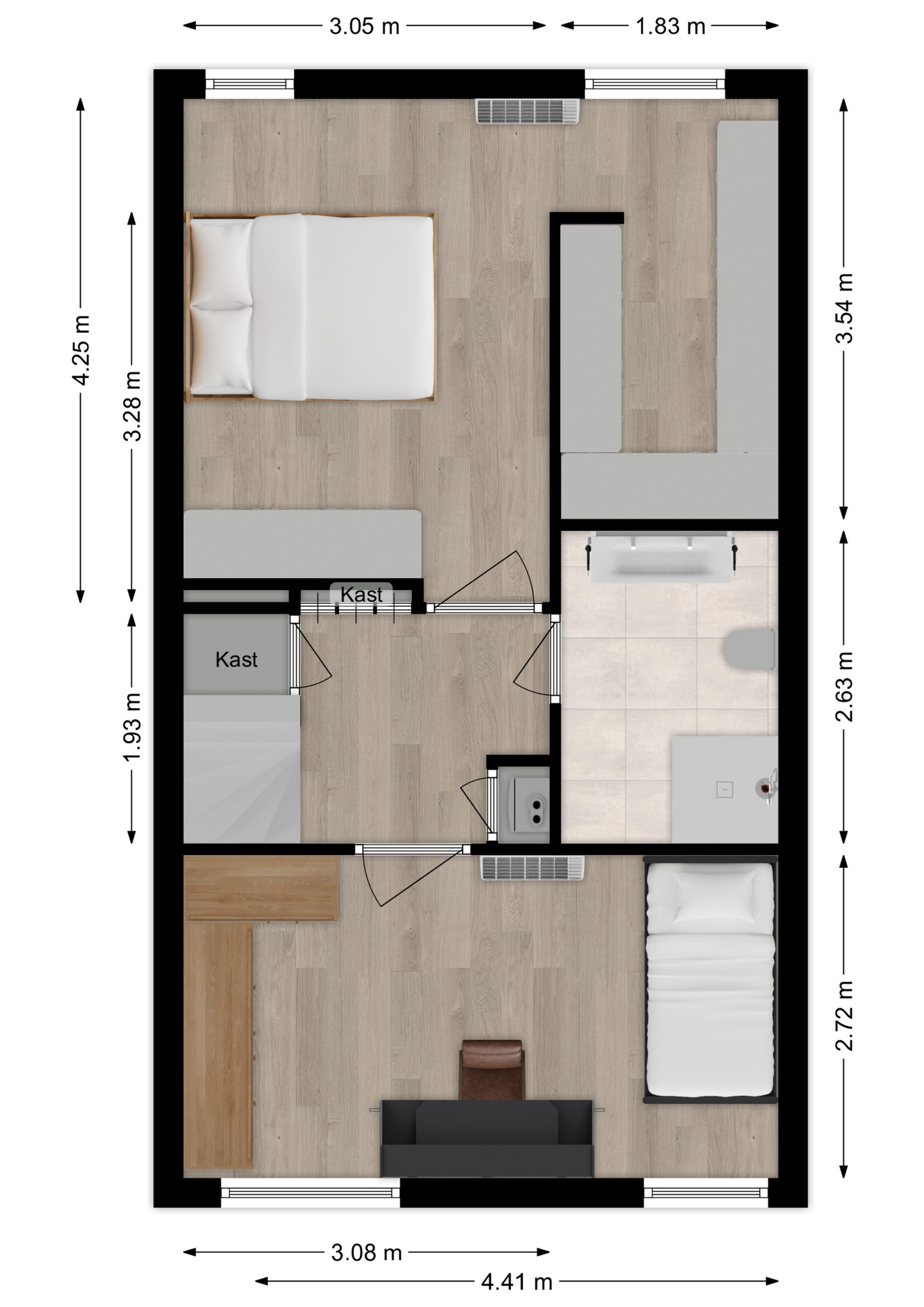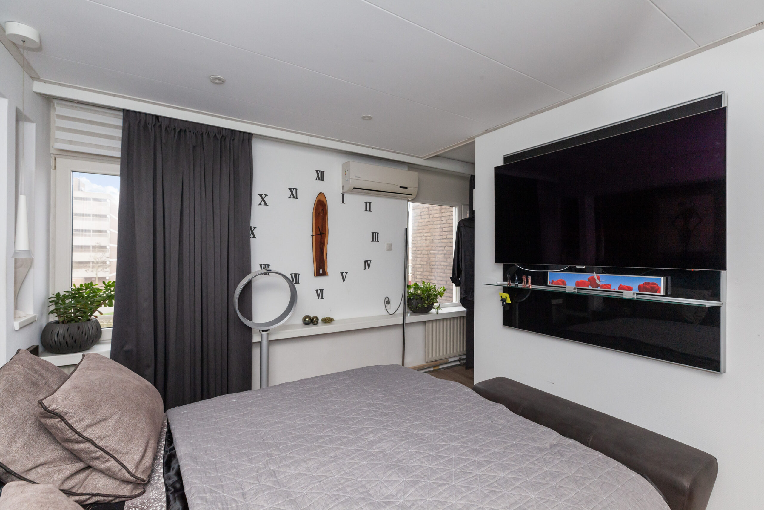 Deze slaapkamer treft u aan de voorzijde en eveneens voorzien van een airco.