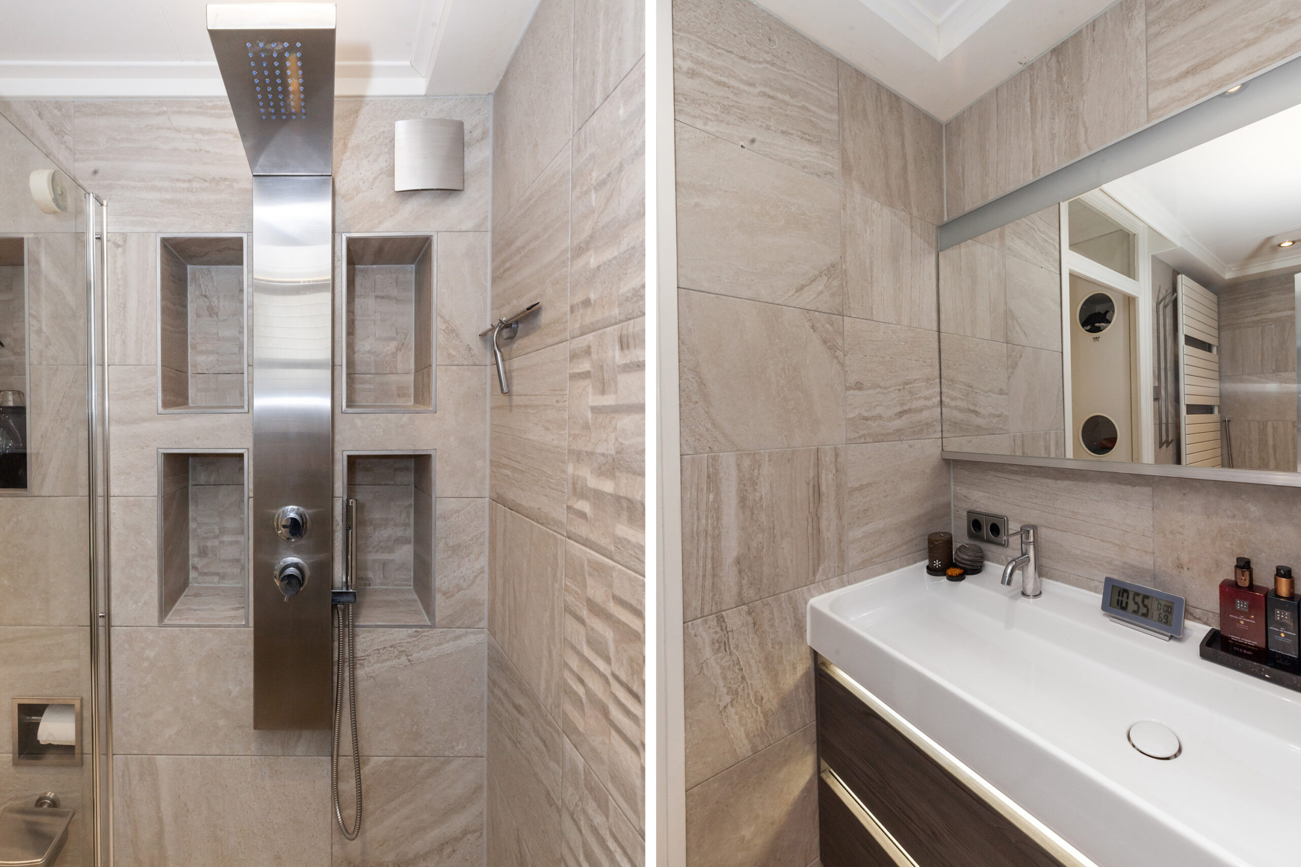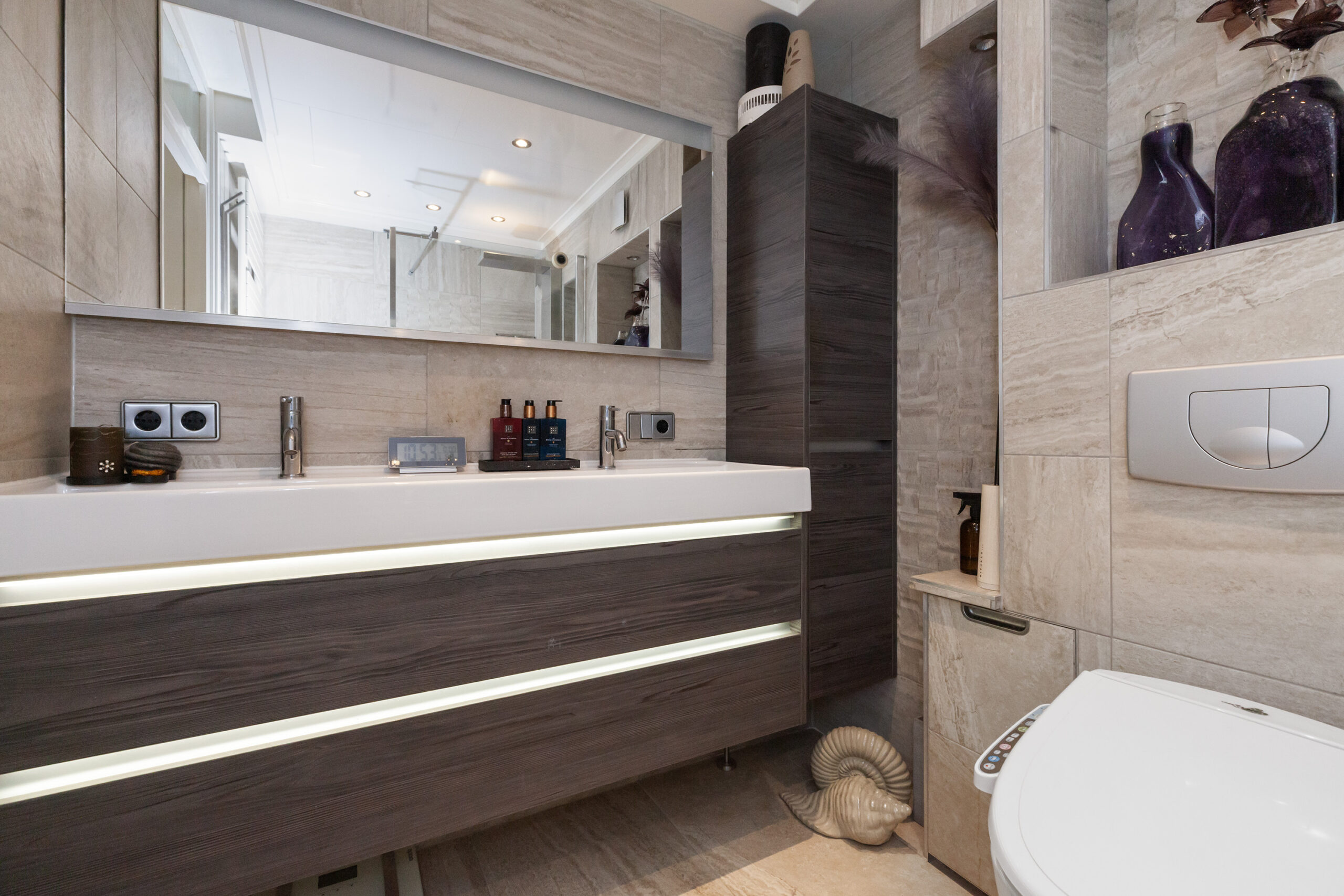 De badkamer is voorzien met een inloopdouche, dubbel wastafelmeubel, toilet en een designradiator. Overigens is deze badkamer nog maar 5 jaar geleden nieuw geplaatst.