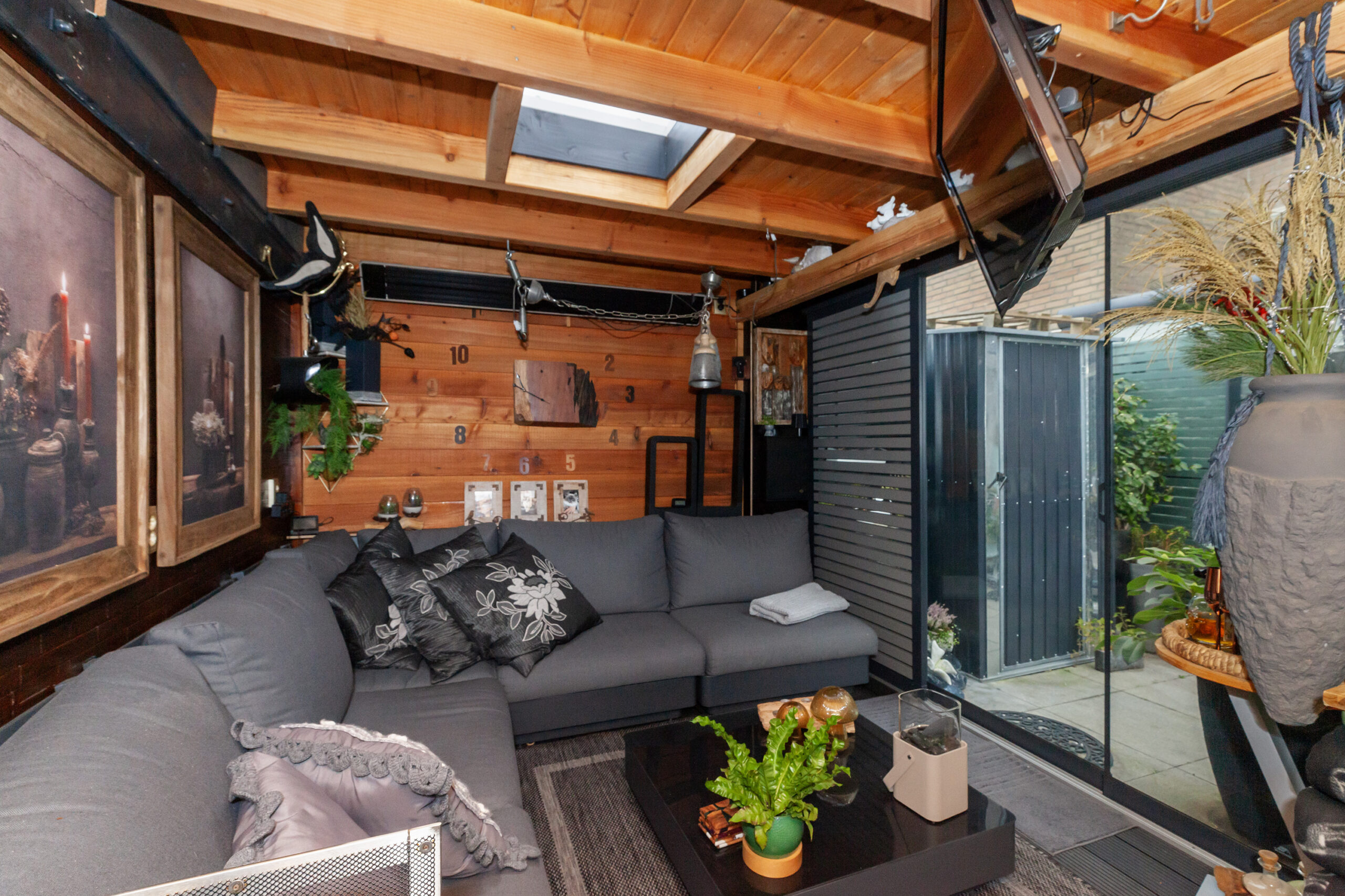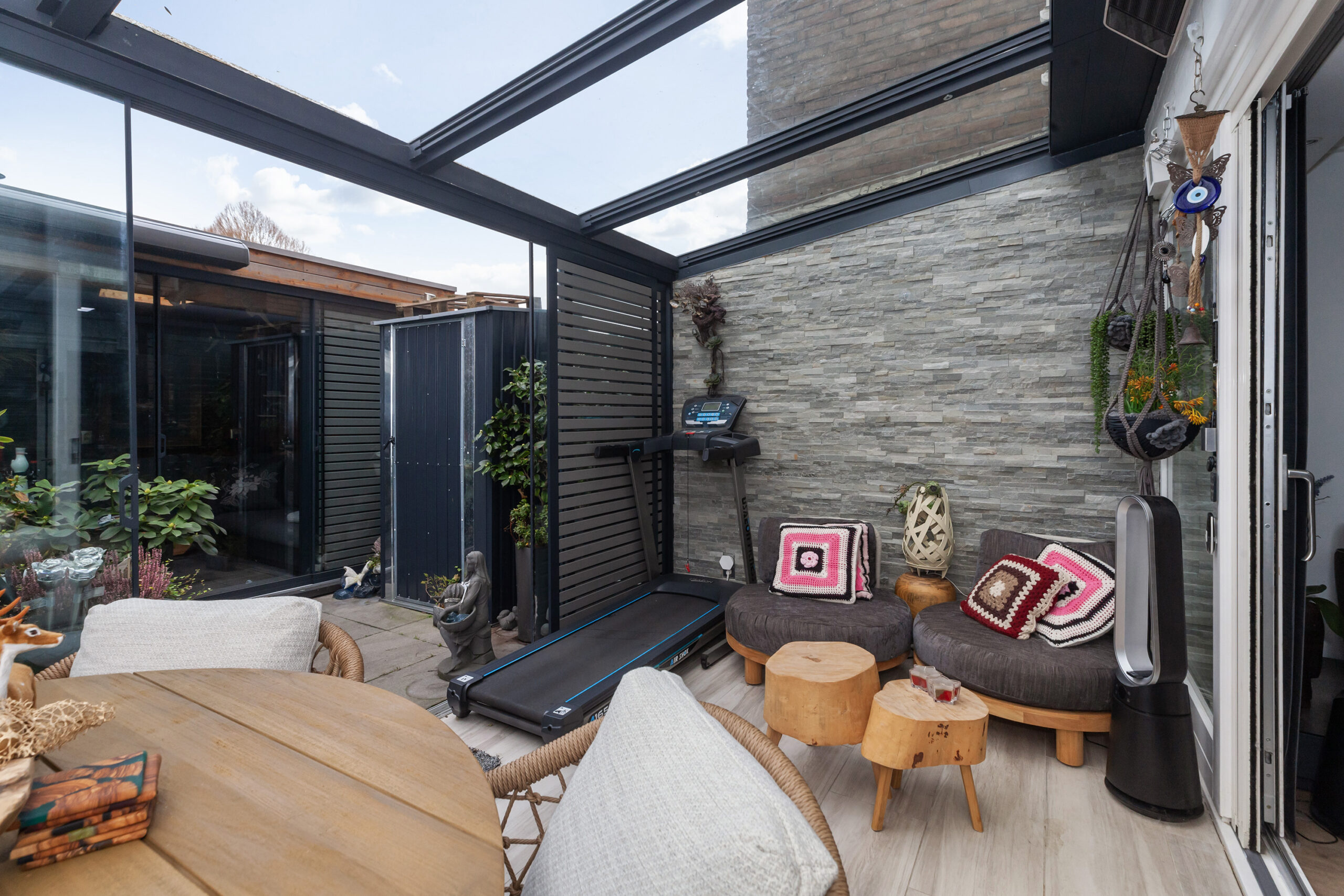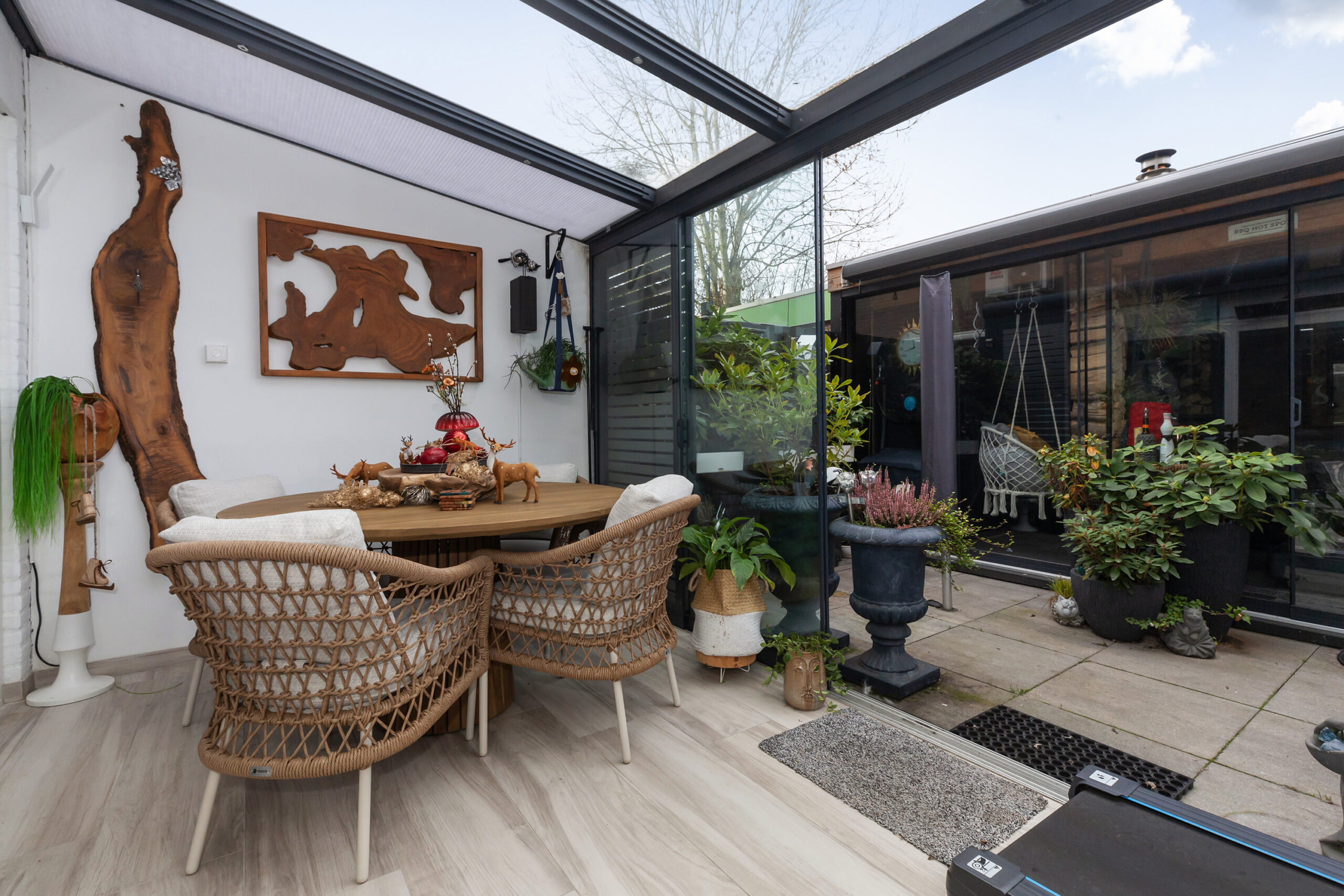 De serre vormt een ware toevoeging en heeft u in elk seizoen plezier van. Doordat deze volledig af te sluiten is met glazen deuren en er vloerverwarming is, is het al snel goed vertoeven hier. Schuift u de deuren helemaal open dan betrekt u het heerlijk bij de tuin.