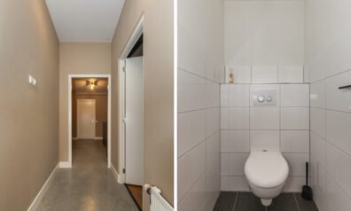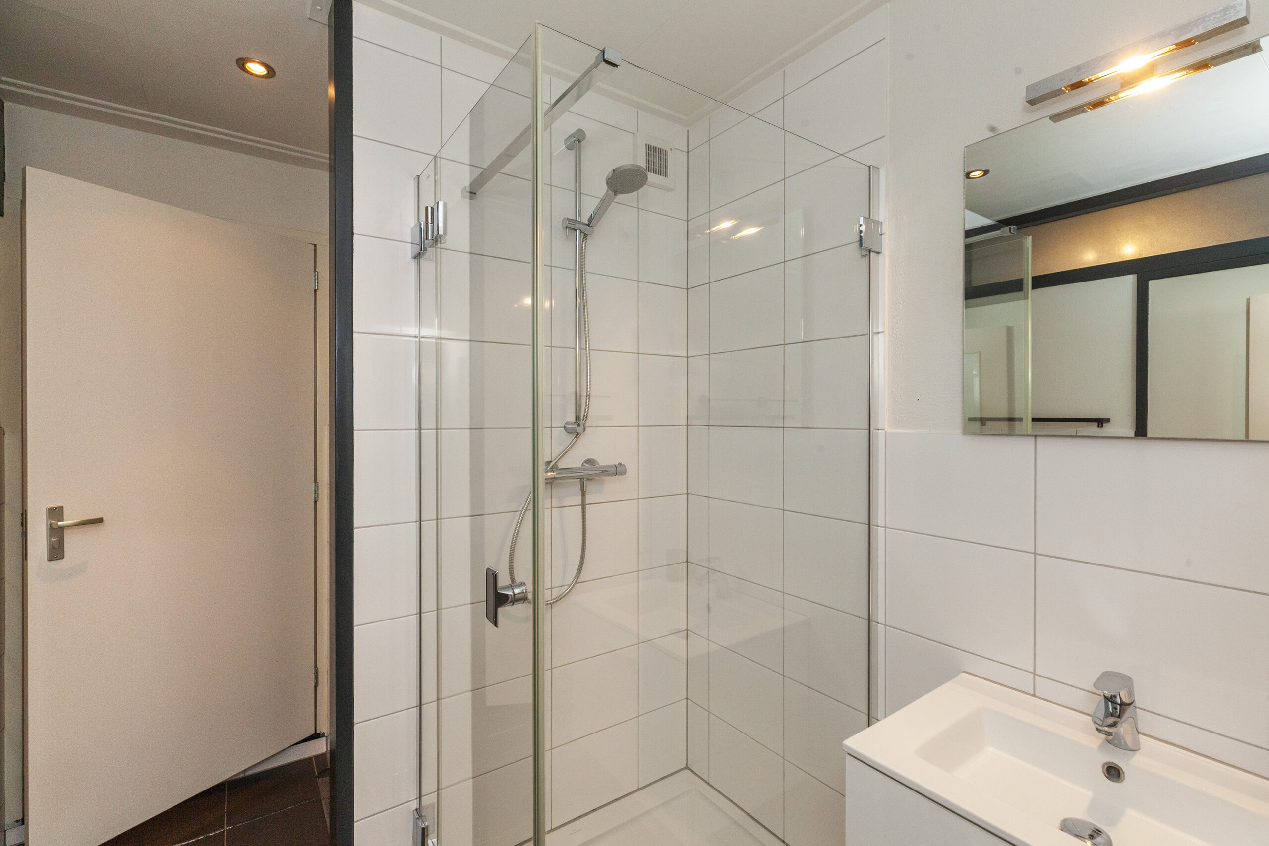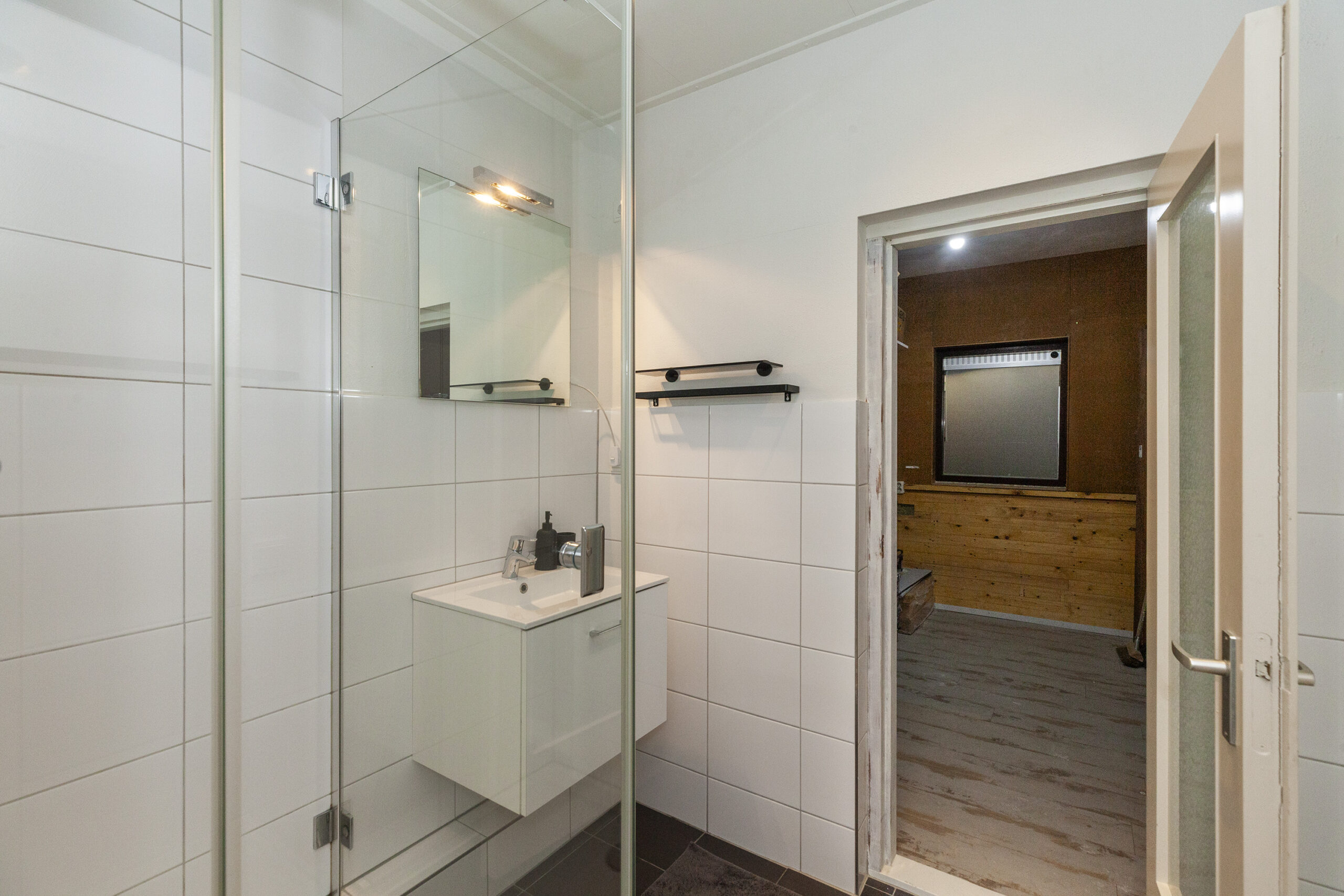 Ook de badkamer verkeert in een nette onderhoudsstaat. Er is een toilet, douche en een wastafelmeubel. Loop je verder dan kom je in de inpandige berging.