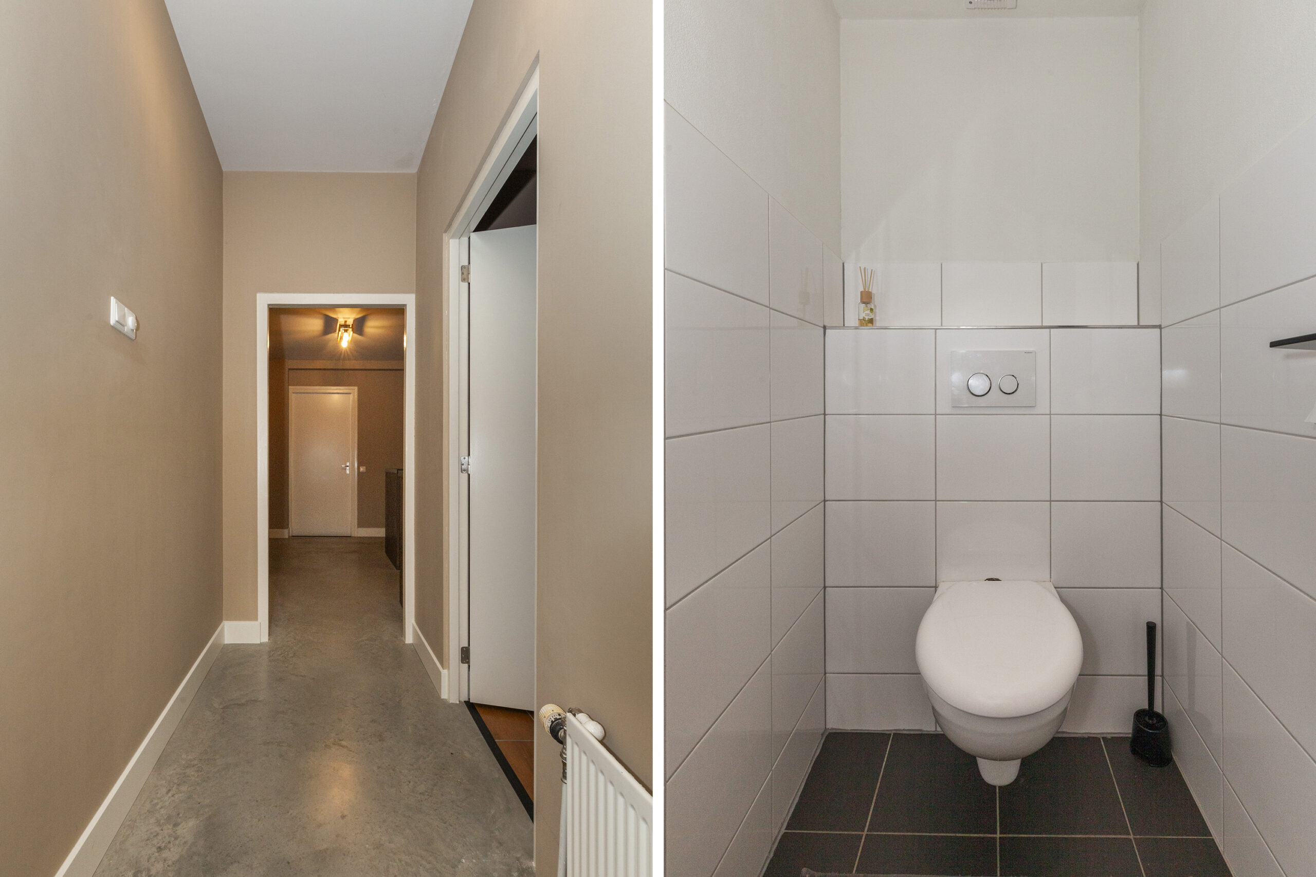 Vanuit de lange hal is er toegang tot de woonkamer en deze mondt uit in de woonkeuken.