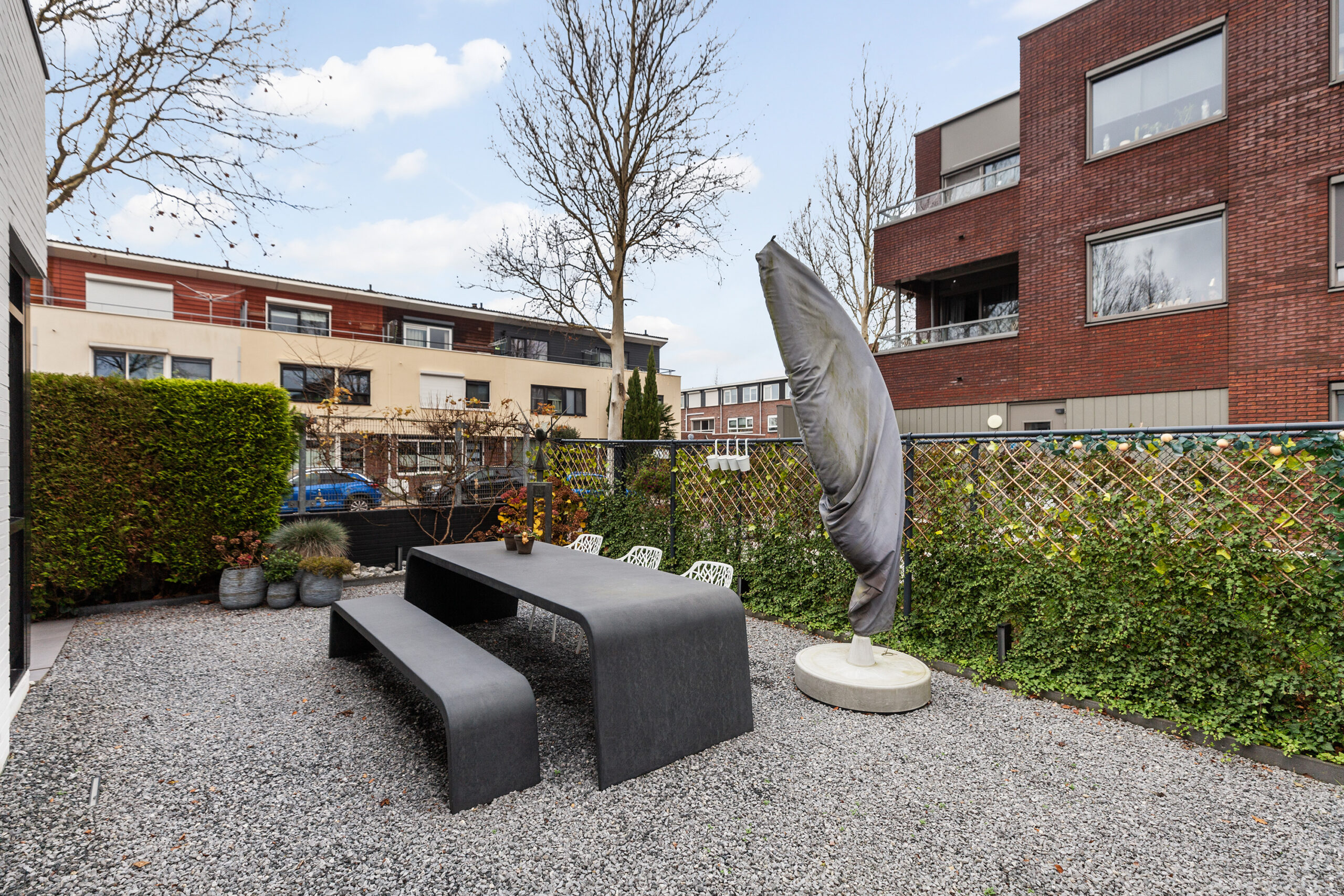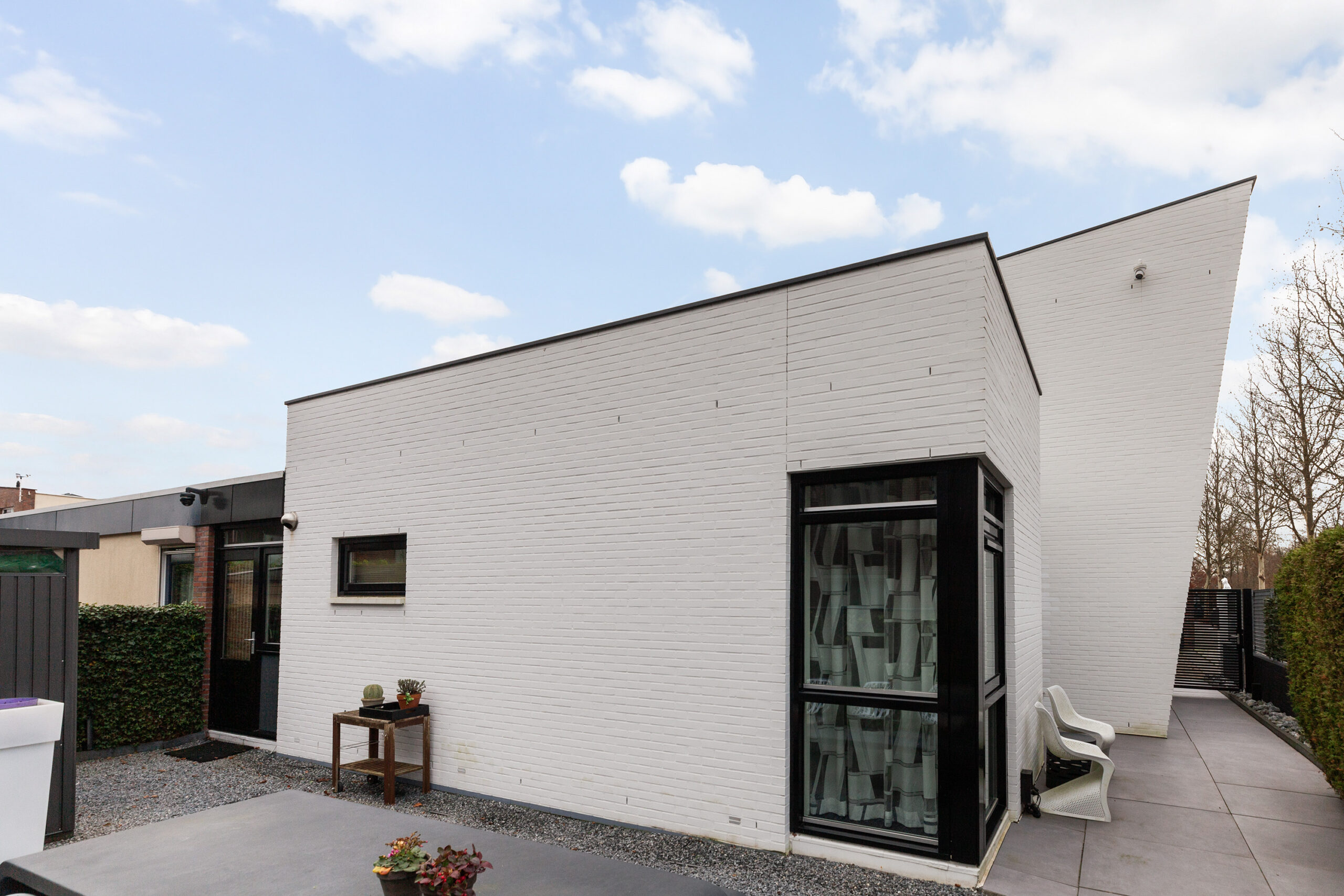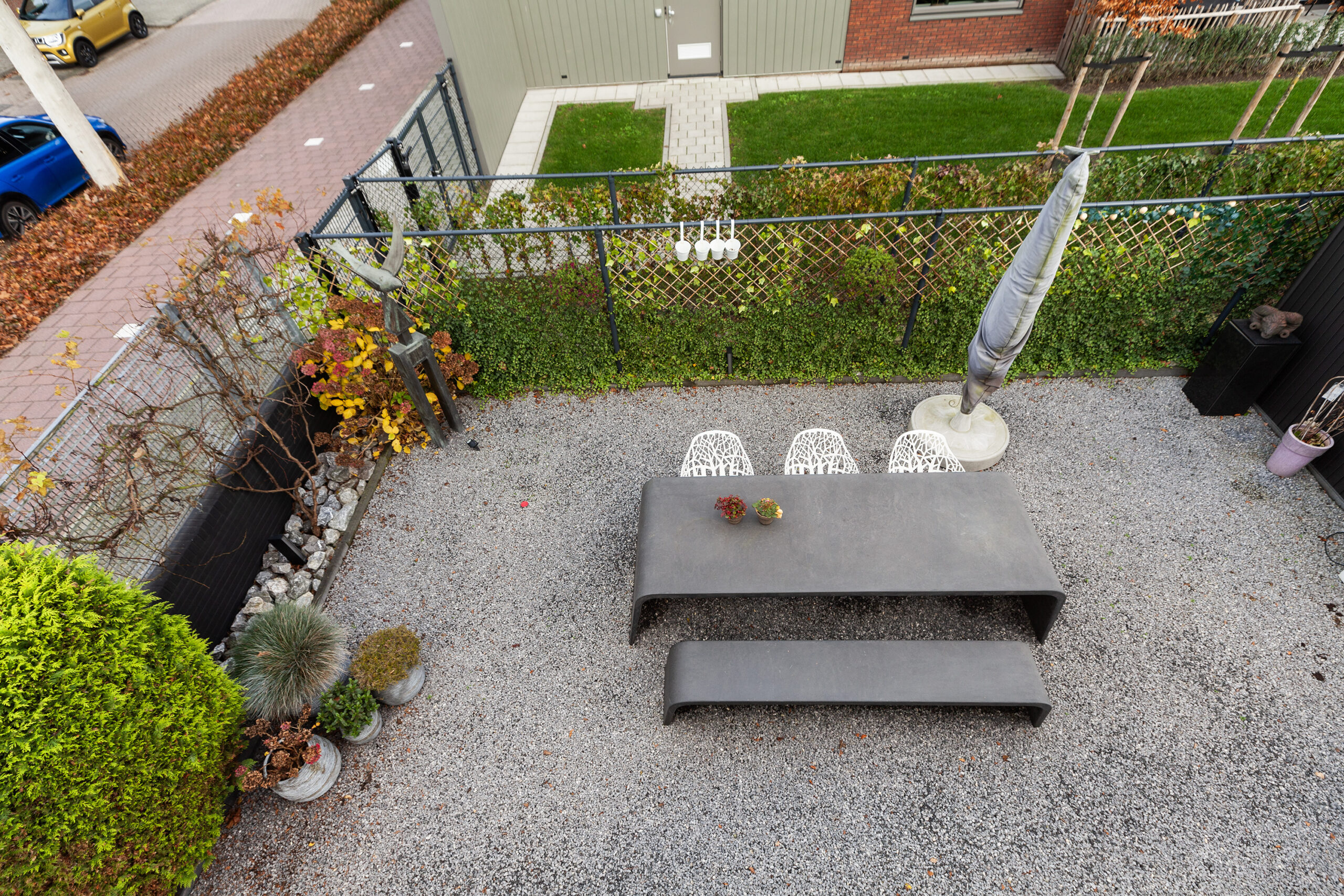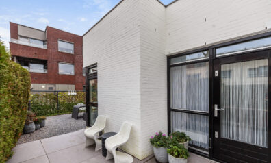Parkeren doet u direct, gemakkelijk op uw eigen oprit. Ook de voortuin is net als de woning strak aangelegd en loopt door via de zijtuin naar achteren.