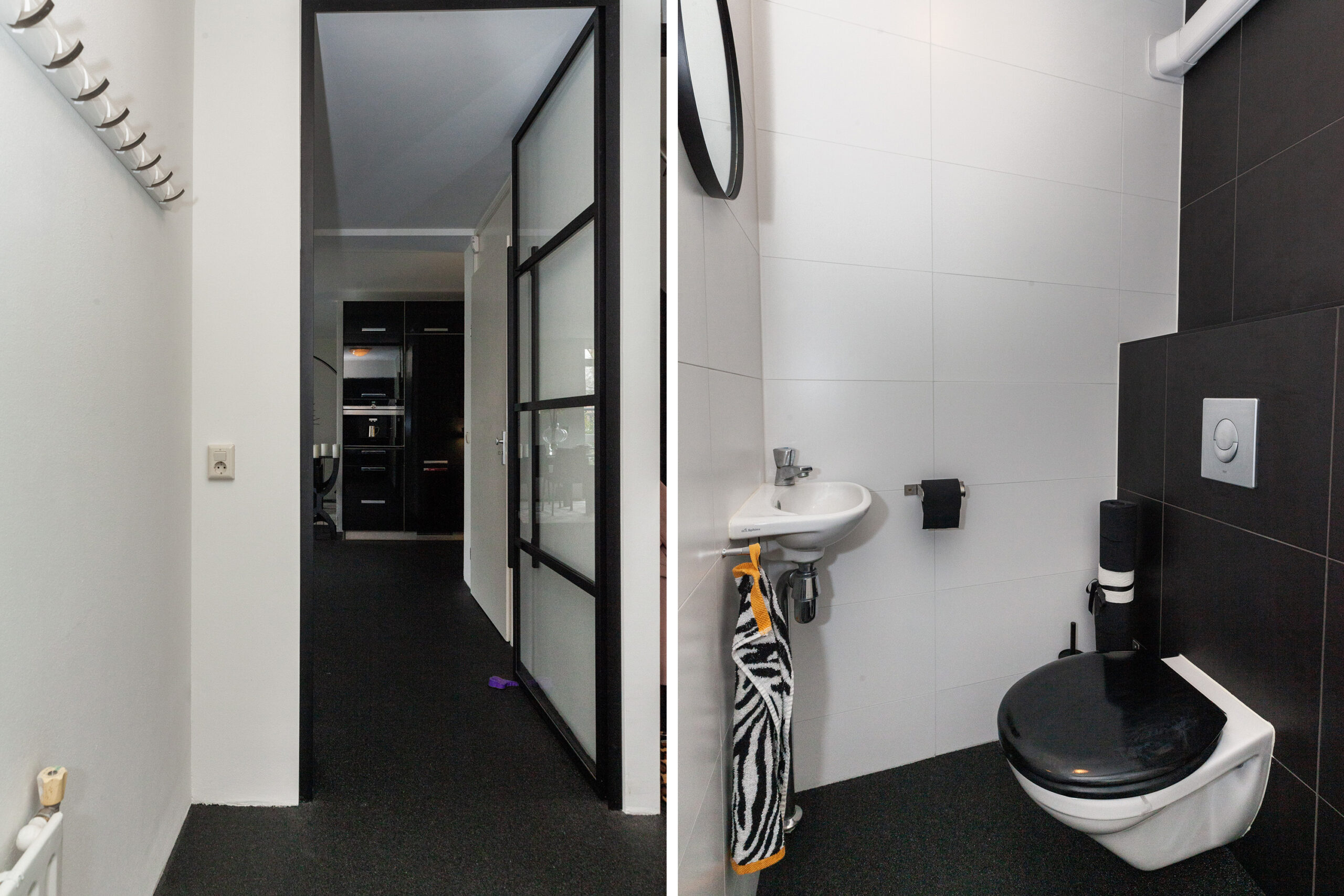 Strakke toiletruimte voorzien van vrijhangend closet en een handwasfonteintje.