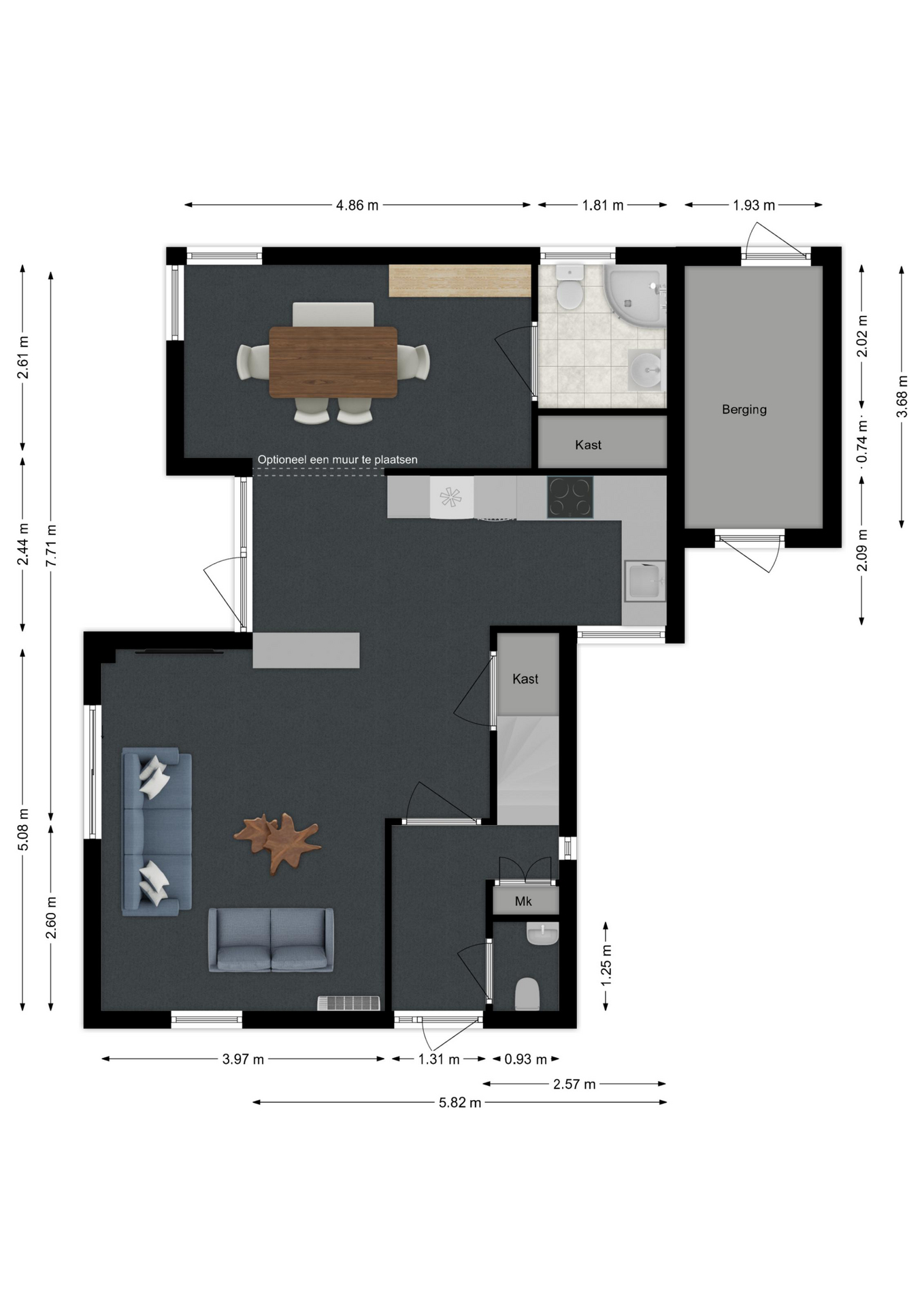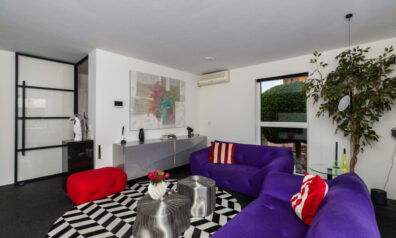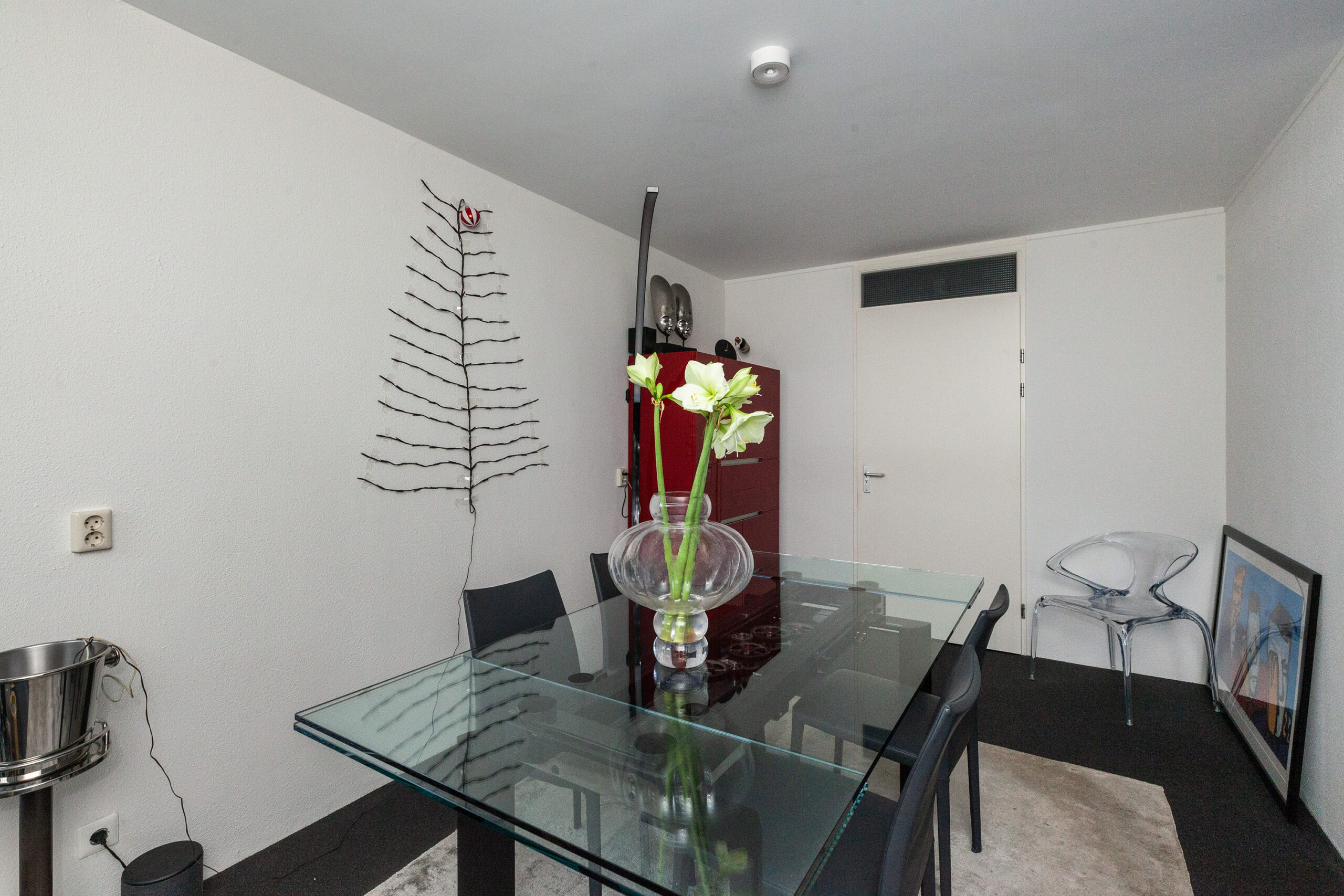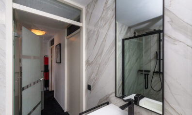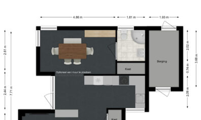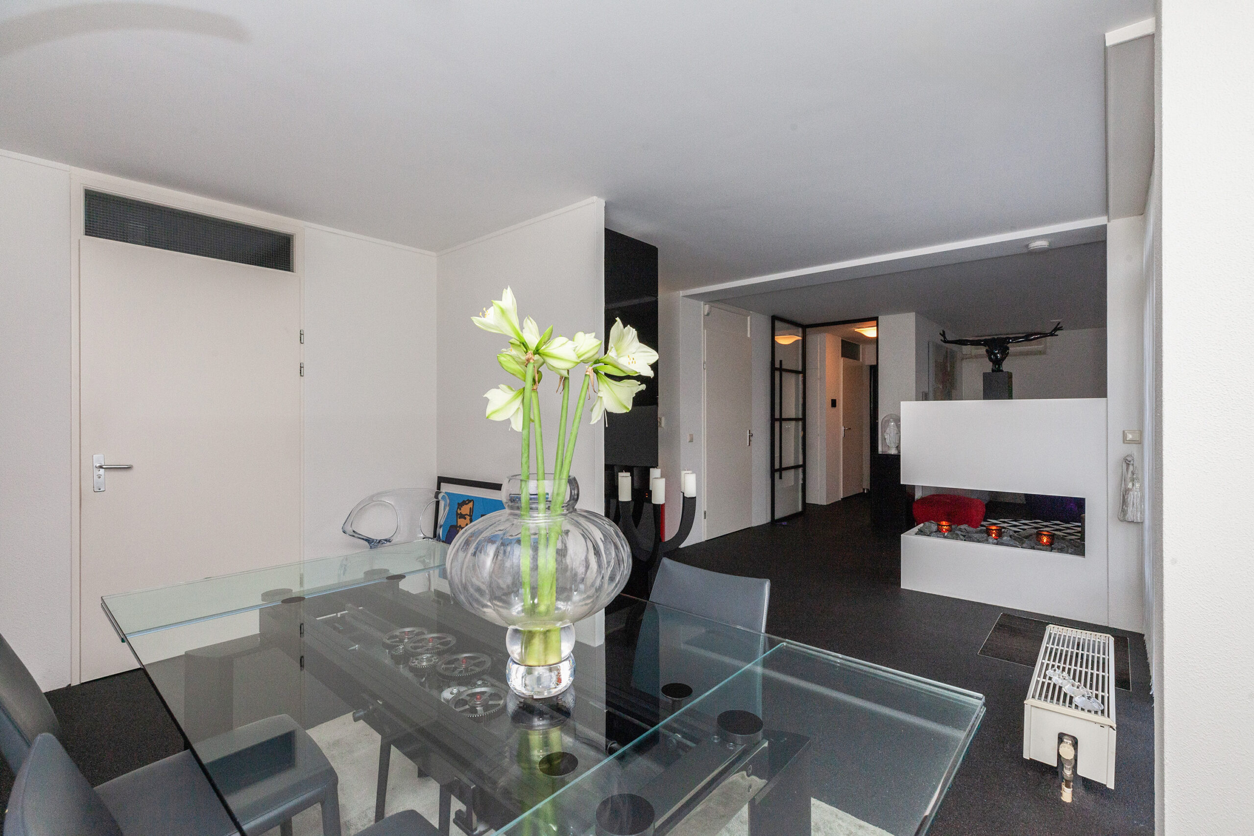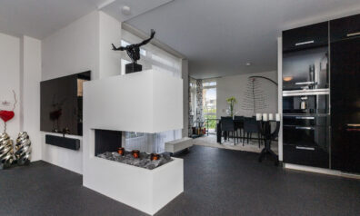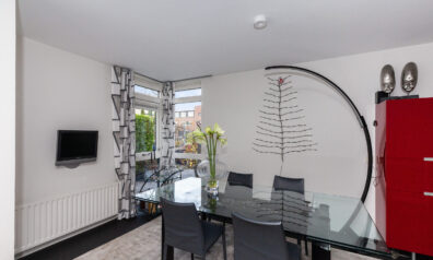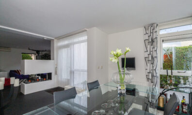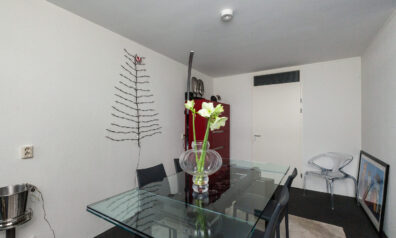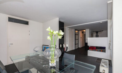 Zodra u binnenkomt verrast de indeling u. Grote raampartijen zorgen voor prettig lichtinval en een directe verbinding naar buiten. De sfeervolle bio ethanol haard creëert een gezellige en luxe ambiance, terwijl de grote trapkast zorgt voor praktische opbergruimte. Daarbij beschikt de kamer ook over een airco. De woonkamer vloeit over naar de luxe keuken met de daarachter gesitueerd eetkamer. Van deze eetkamer kunt u gemakkelijk een slaapkamer maken, door één wand te plaatsen. Ernaast is namelijk de badkamer gelegen.