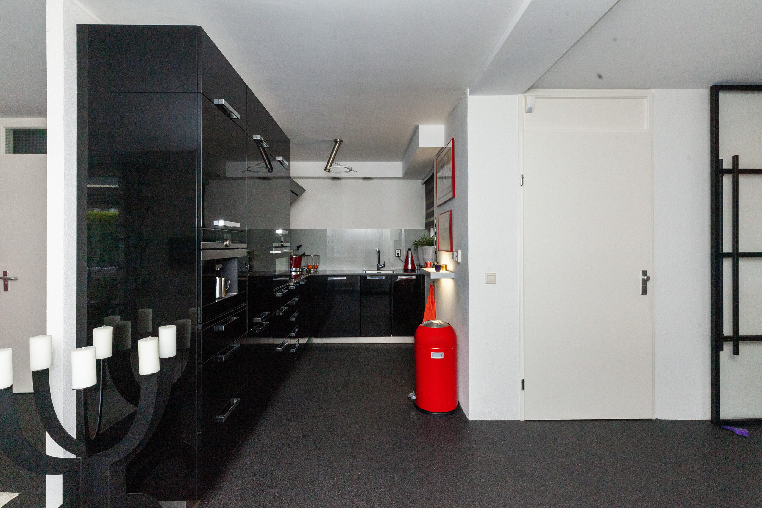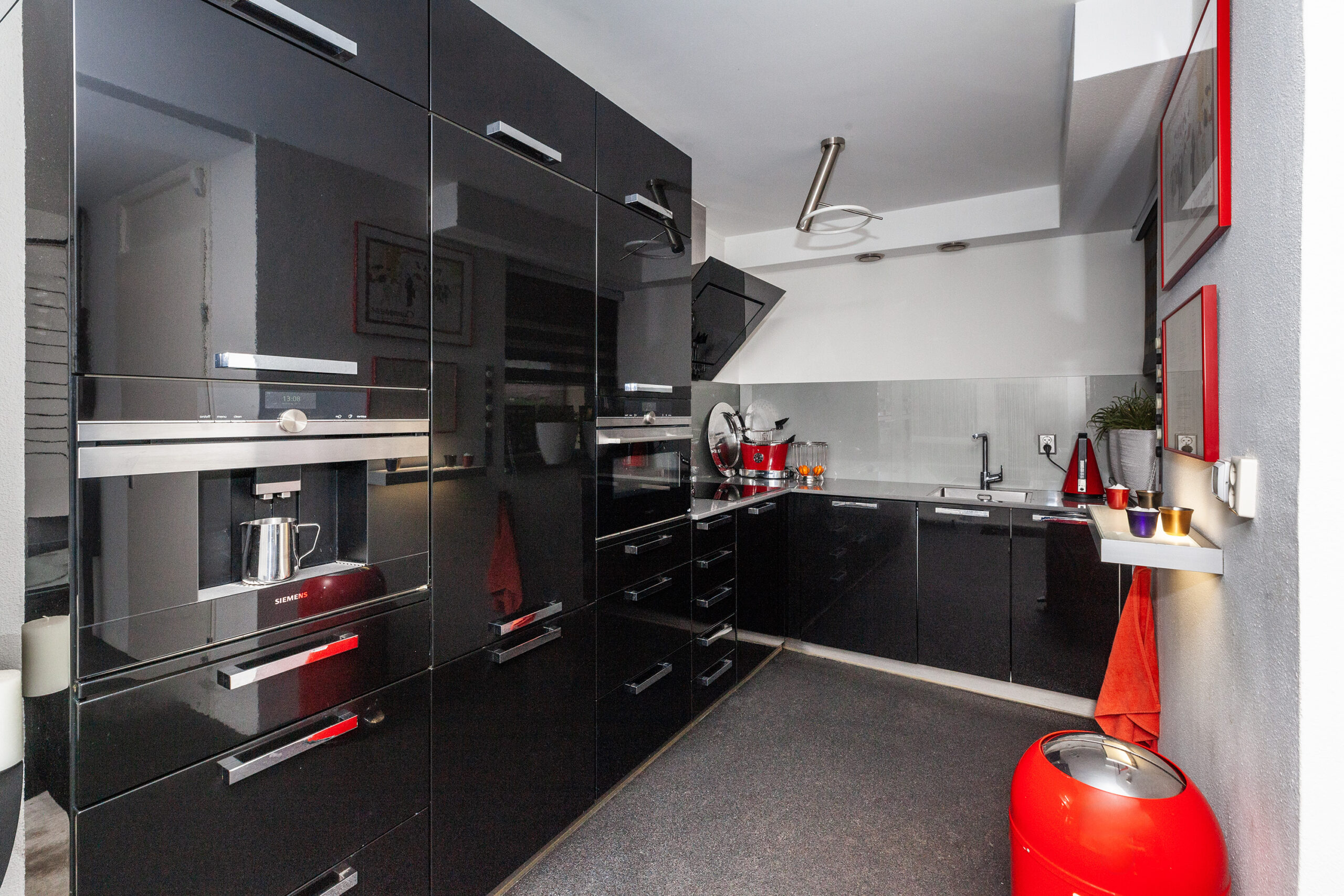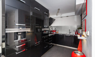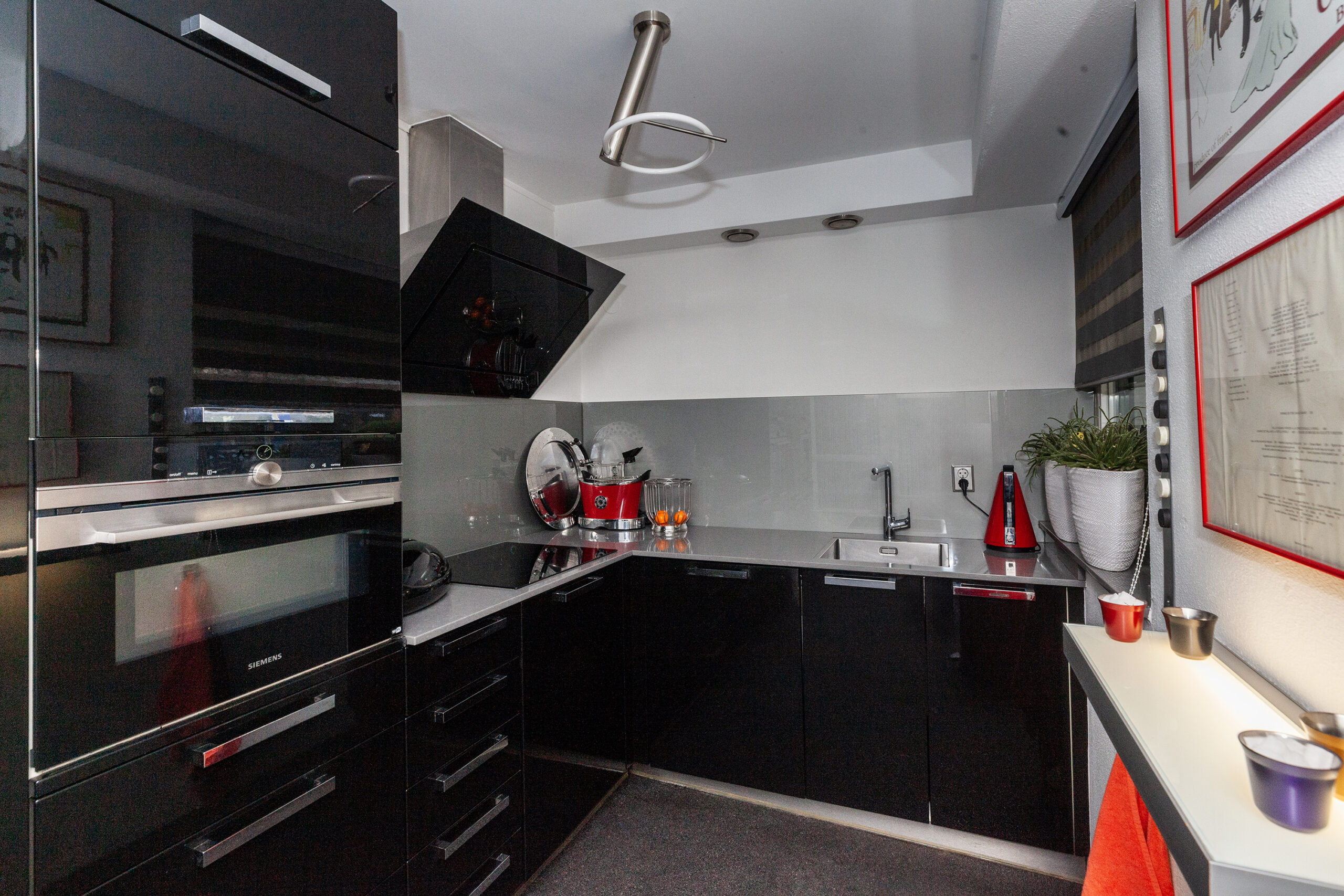 De keuken is afgewerkt met een donkere, hoogglans afwerking. Naast de vele keukenkastjes/-lades heeft u aan inbouwapparatuur de beschikking over een inductiekookplaat, afzuigkap, vaatwasser, koel-/vriescombinatie, combi-oven en een koffiezetapparaat. In de afgelopen jaren is al het inbouwapparatuur vervangen.