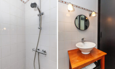 Hoe fijn is het om een badkamer op de begane grond te hebben. Deze badkamer heeft u een inloopdouche, toilet en een meubel met waskom. Daarnaast is er een kast met een tweetal schuifdeuren, hier is het mogelijk om een ligbad te plaatsen.