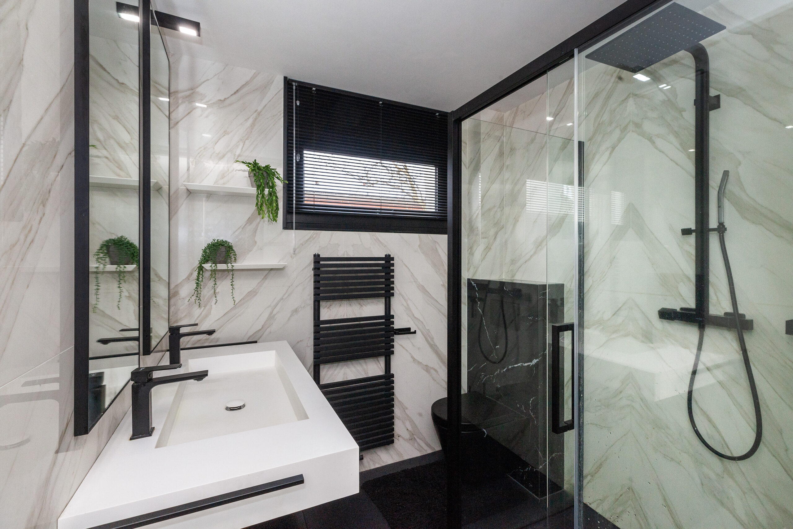 Moderne badkamer voorzien van een ruime inloopdouche, toilet, designradiator en een wastafelmeubel met dubbele kraan.