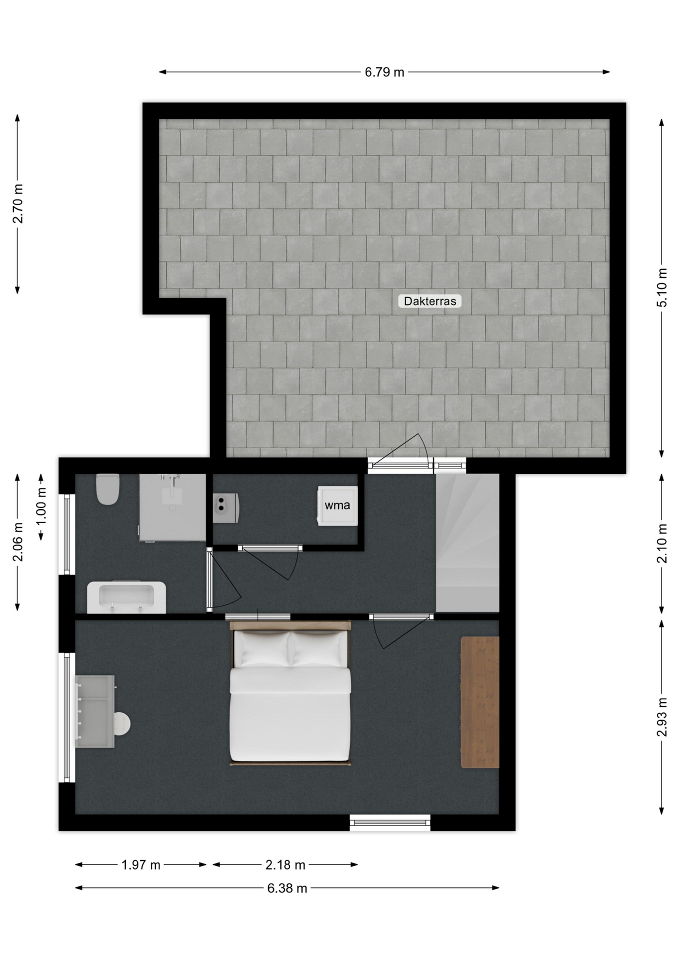 Vanaf de overloop heeft u toegang tot het dakterras, de slaapkamer en de badkamer. Daarnaast is de inloopberging van circa 2.18 x 1.00m toegankelijk.