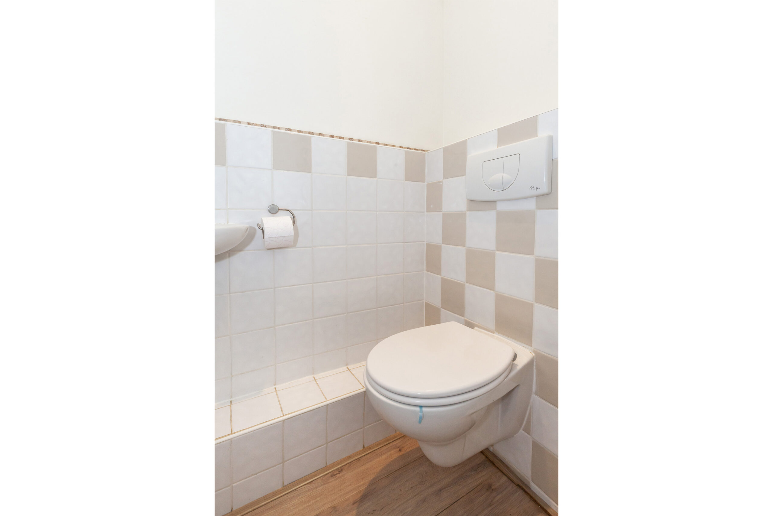 Nette toiletruimte voorzien van een vrijhangend closet en een handwasfonteintje.