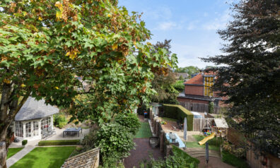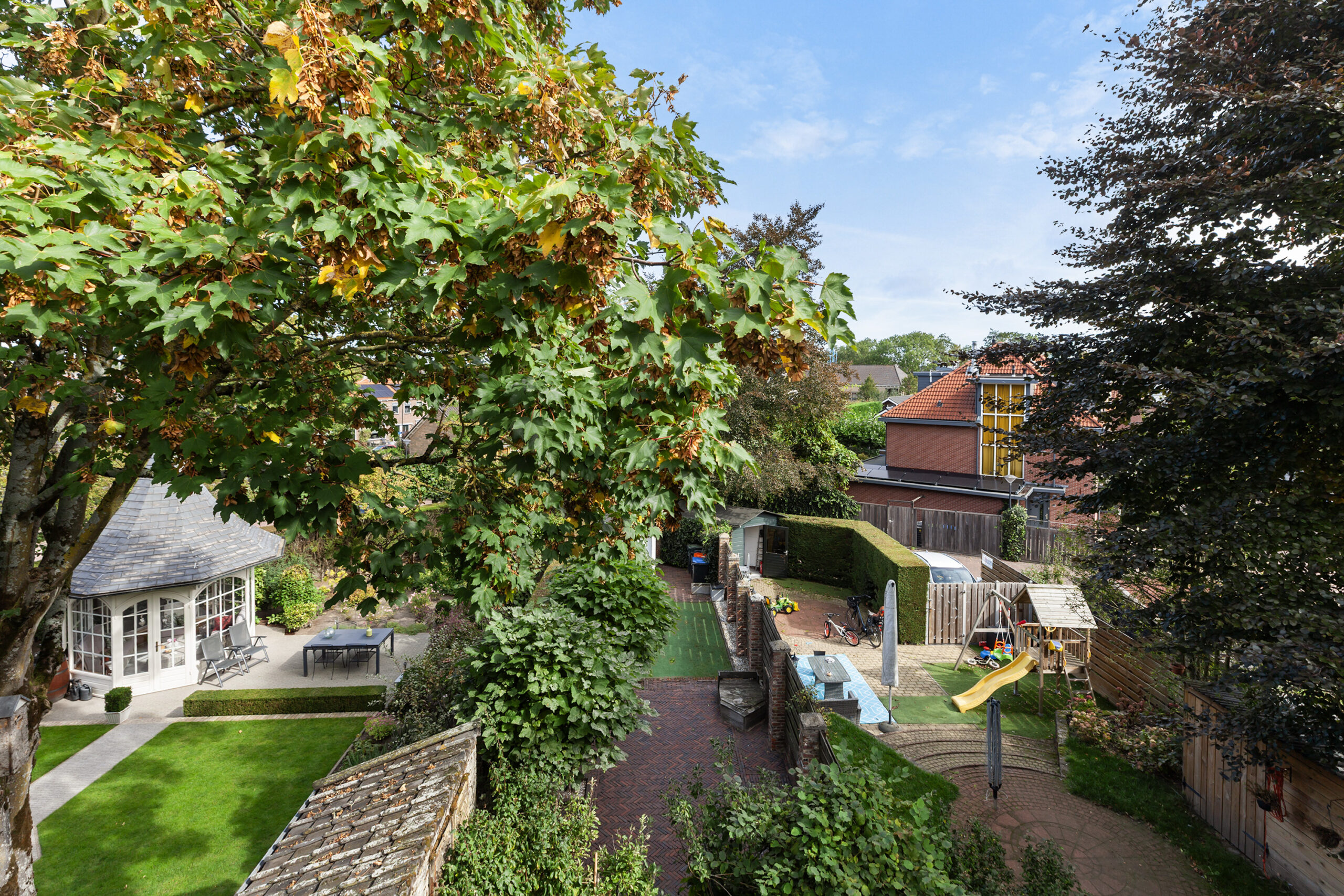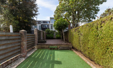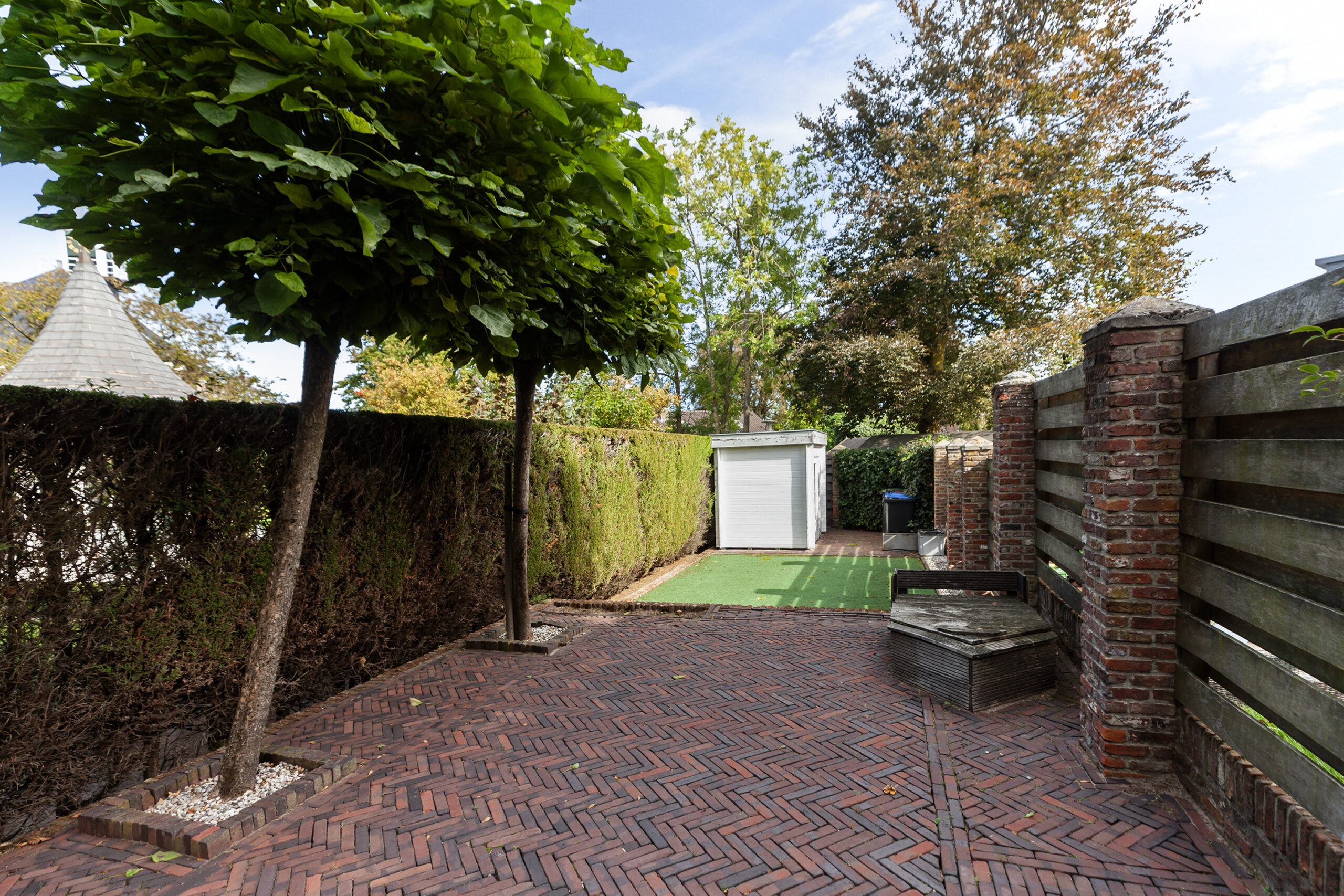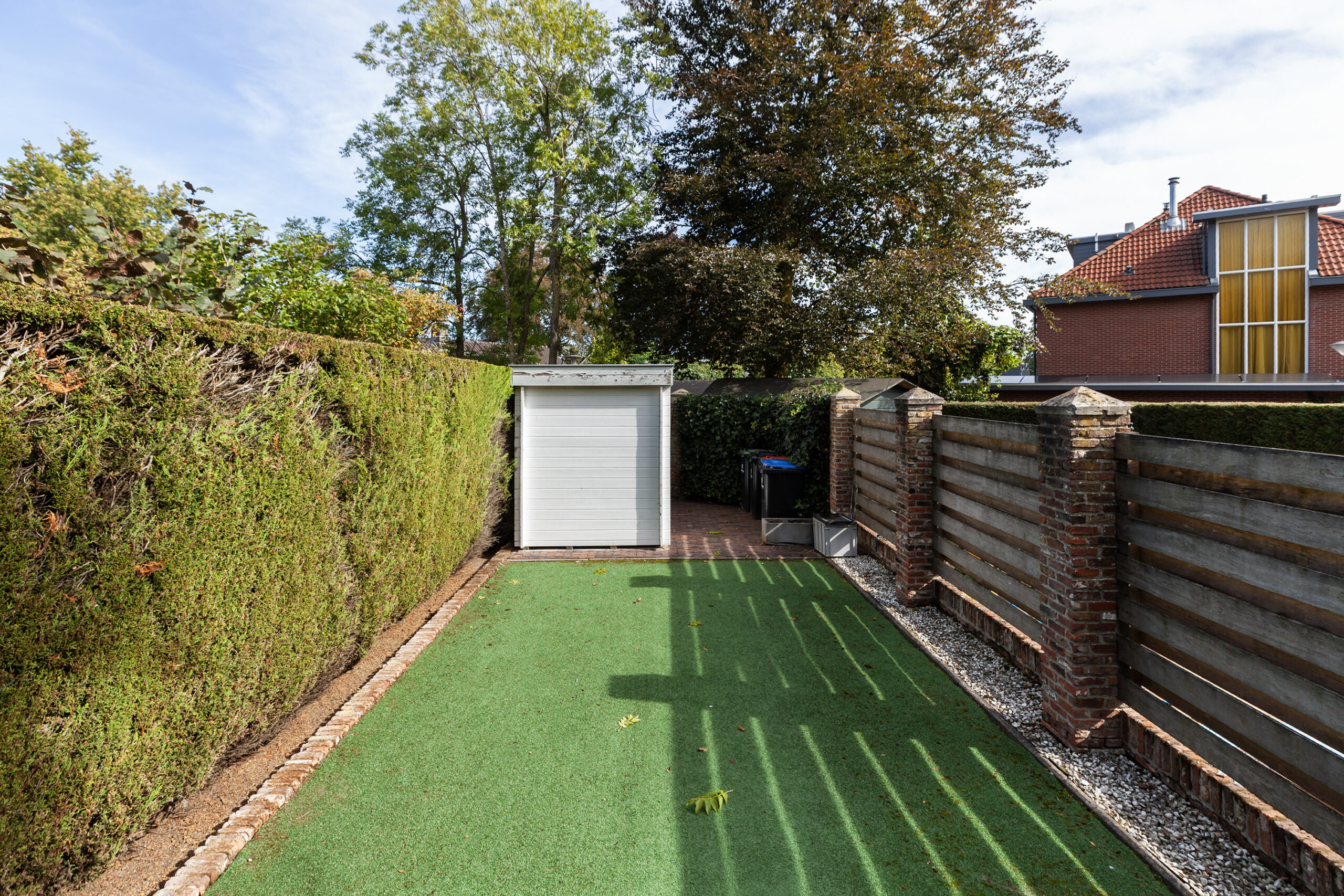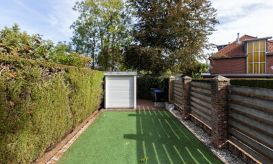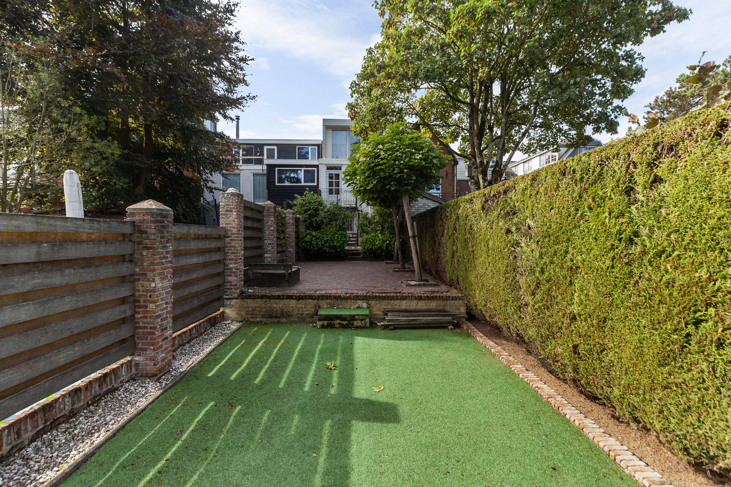 Wat een heerlijke, diepe achtertuin is er aan de achterzijde! Ondanks de ligging op het noordoosten is er altijd wel een plekje in de zon of in de schaduw te vinden. De tuin is grotendeels aangelegd met bestrating, bomen en kunstgras.