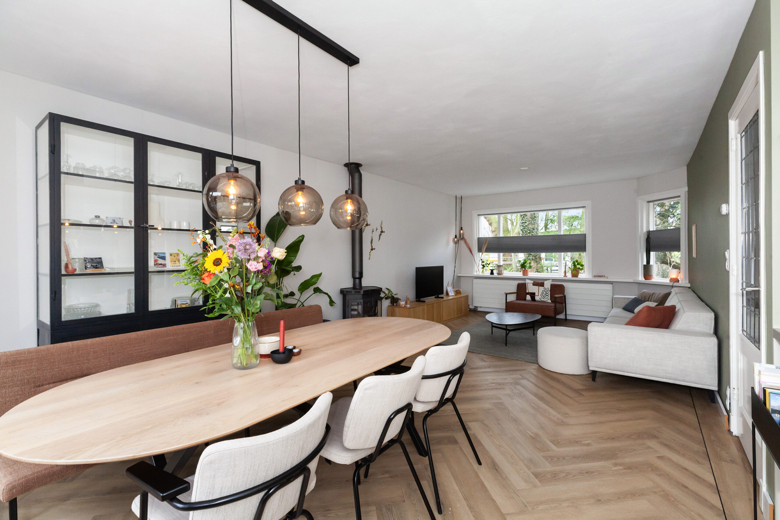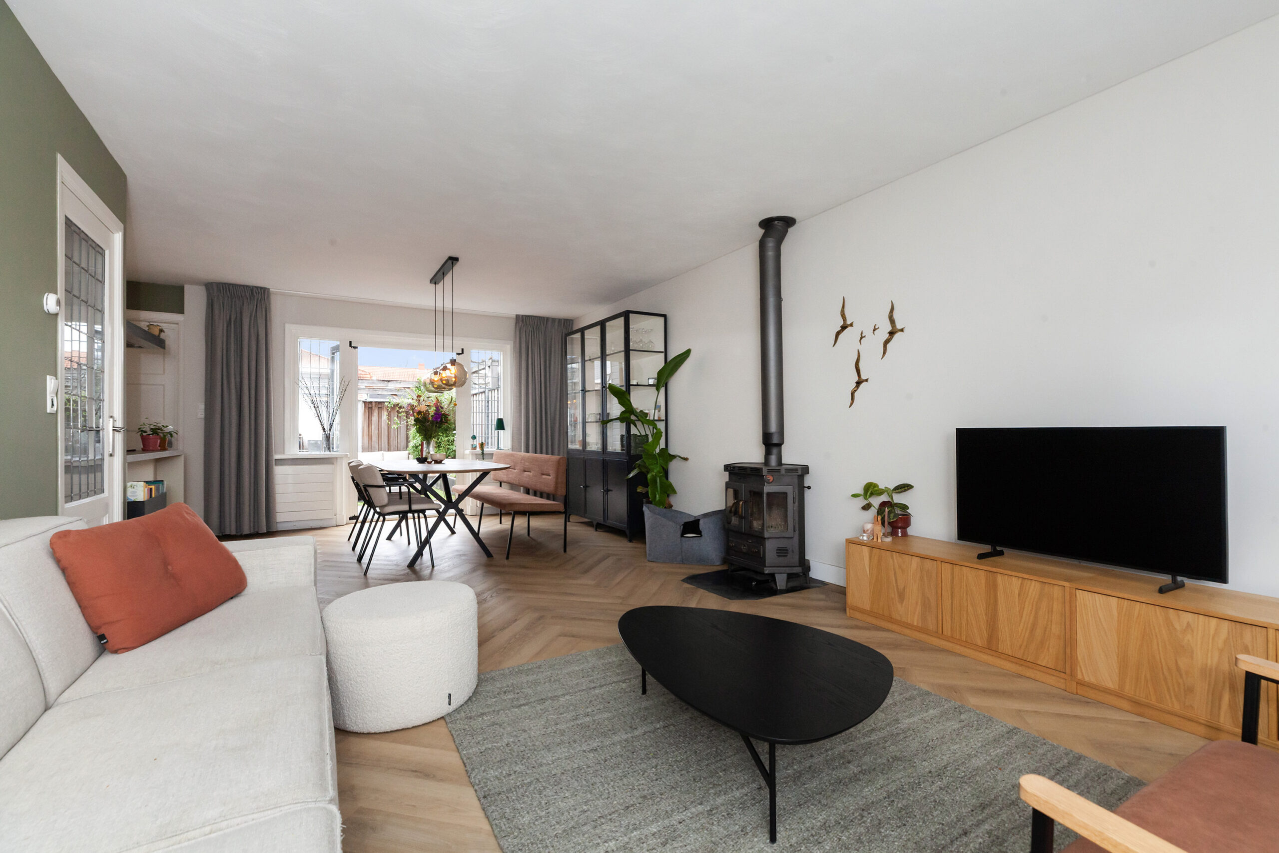 De woonkamer is heerlijk licht en ruim van opzet, mede door de vele ramen aan de voorzijde wat zorgt voor een prettig lichtinval. Eyecatcher is de sfeervolle houtkachel welke een centraal middelpunt vormt tussen het zit- en eetgedeelte. De openslaande deuren naar tuin zorgen ervoor dat u gemakkelijk de tuin betreedt.