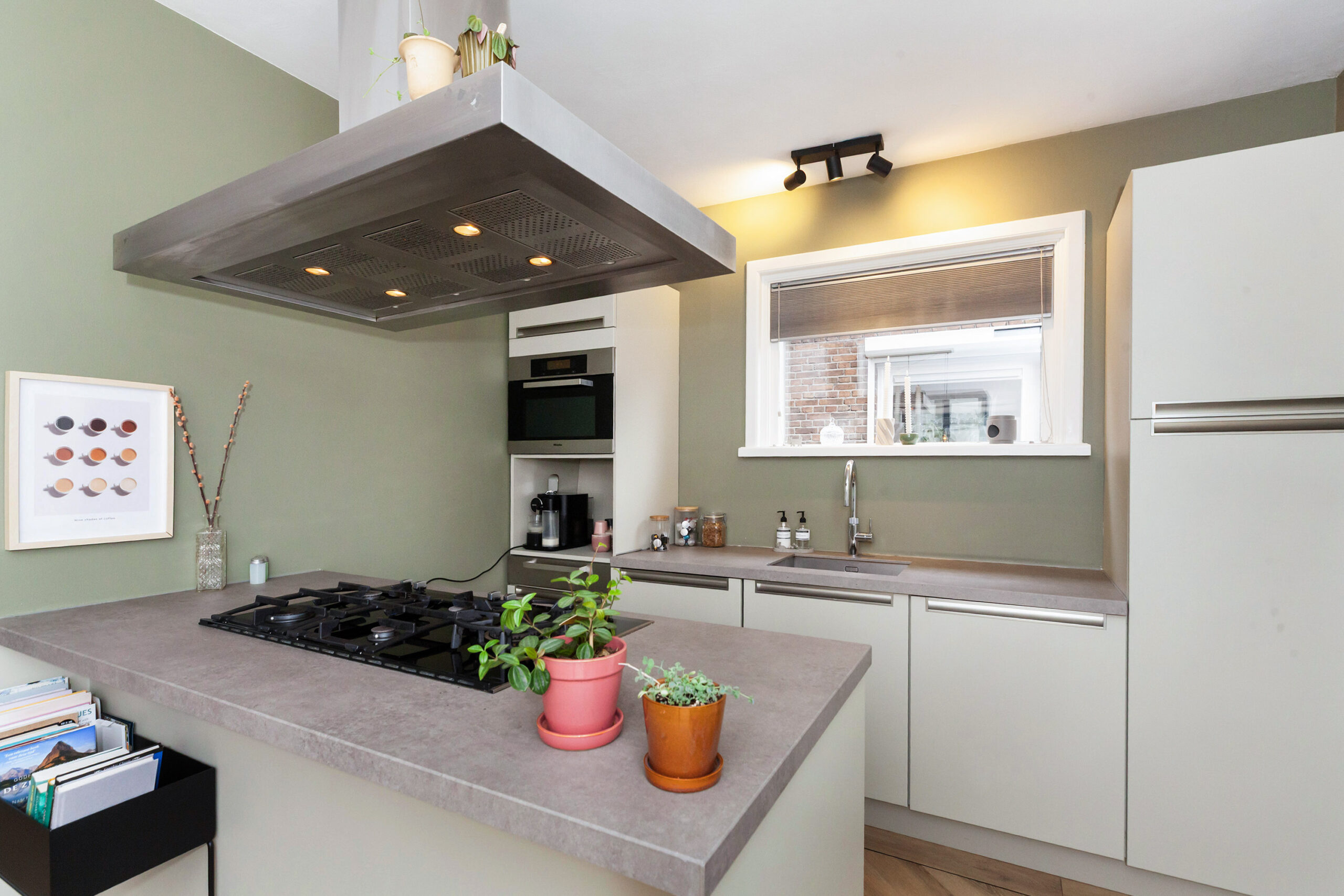 Aan de achterzijde is de keuken gesitueerd. Deze is opgesteld met een rechte opstelling met de Quooker, koelkast, vaatwasser en combimagnetron. Aan het schiereiland heeft u de 5-pits gaskookplaat met afzuigkap en oven. Verder is er toegang tot de bijkeuken.