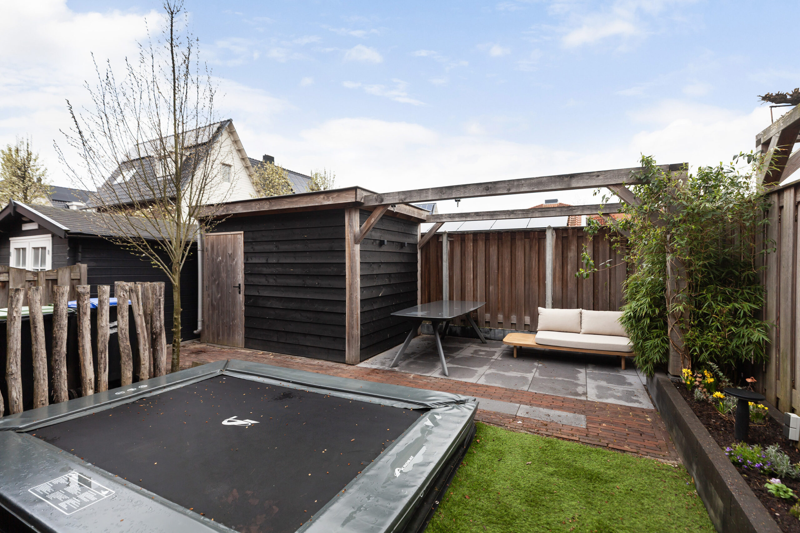 Achter de woning ligt een onderhoudsvriendelijke tuin welke aangelegd is met een terras, gazon, plantenborder en een houten berging van circa 3.35 x 2.27m. Naast de berging heeft u nog een terras waar het goed vertoeven is. Aan de zijzijde is er een pad om achterom te komen, zodat u gemakkelijk met de fiets naar de berging kunt.