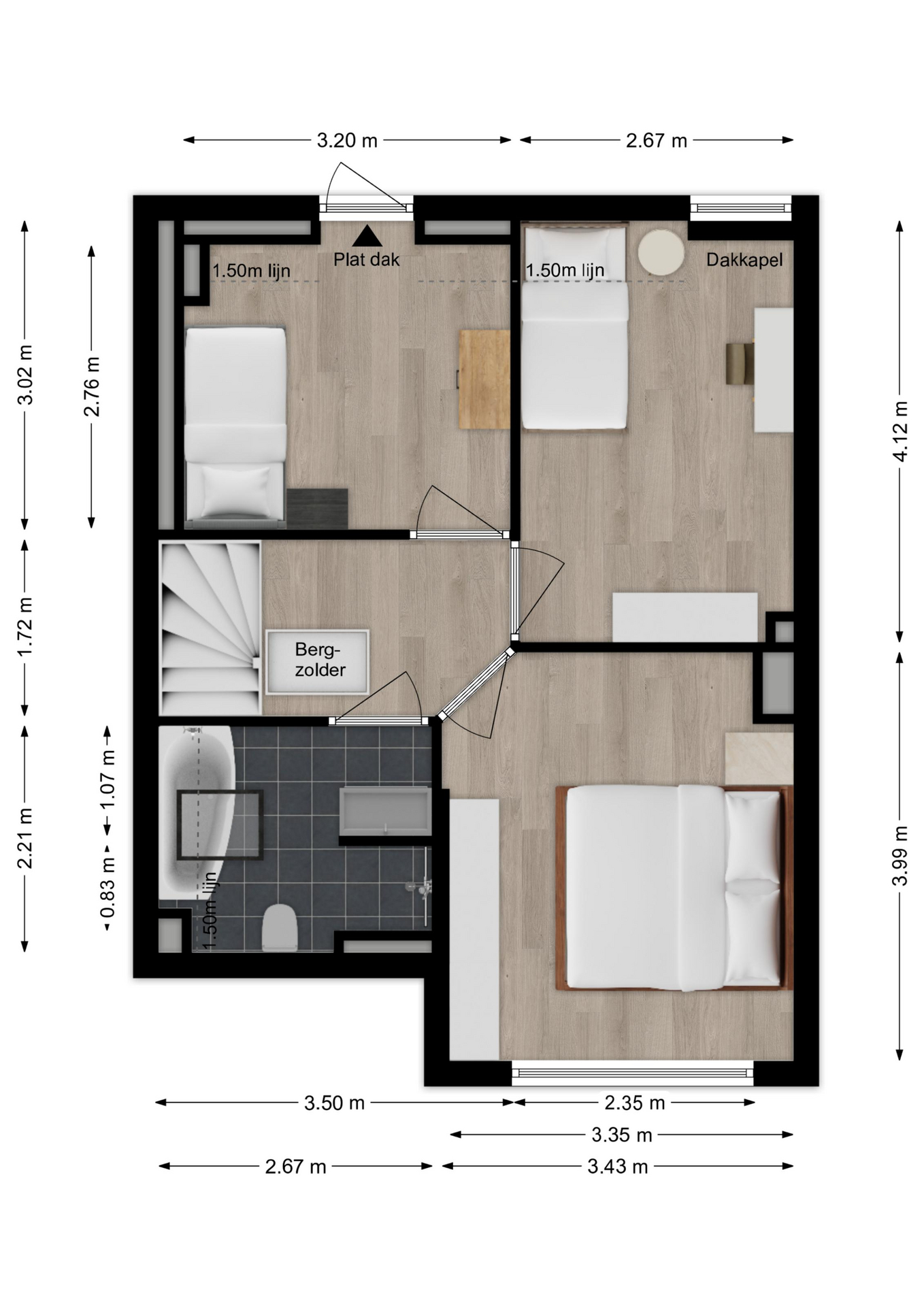 Vanaf de overloop heeft u toegang tot de drie slaapkamers en de badkamer. Via de vlizotrap is de royale bergzolder bereikbaar waar u ook de C.V.-ketel treft.