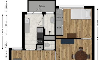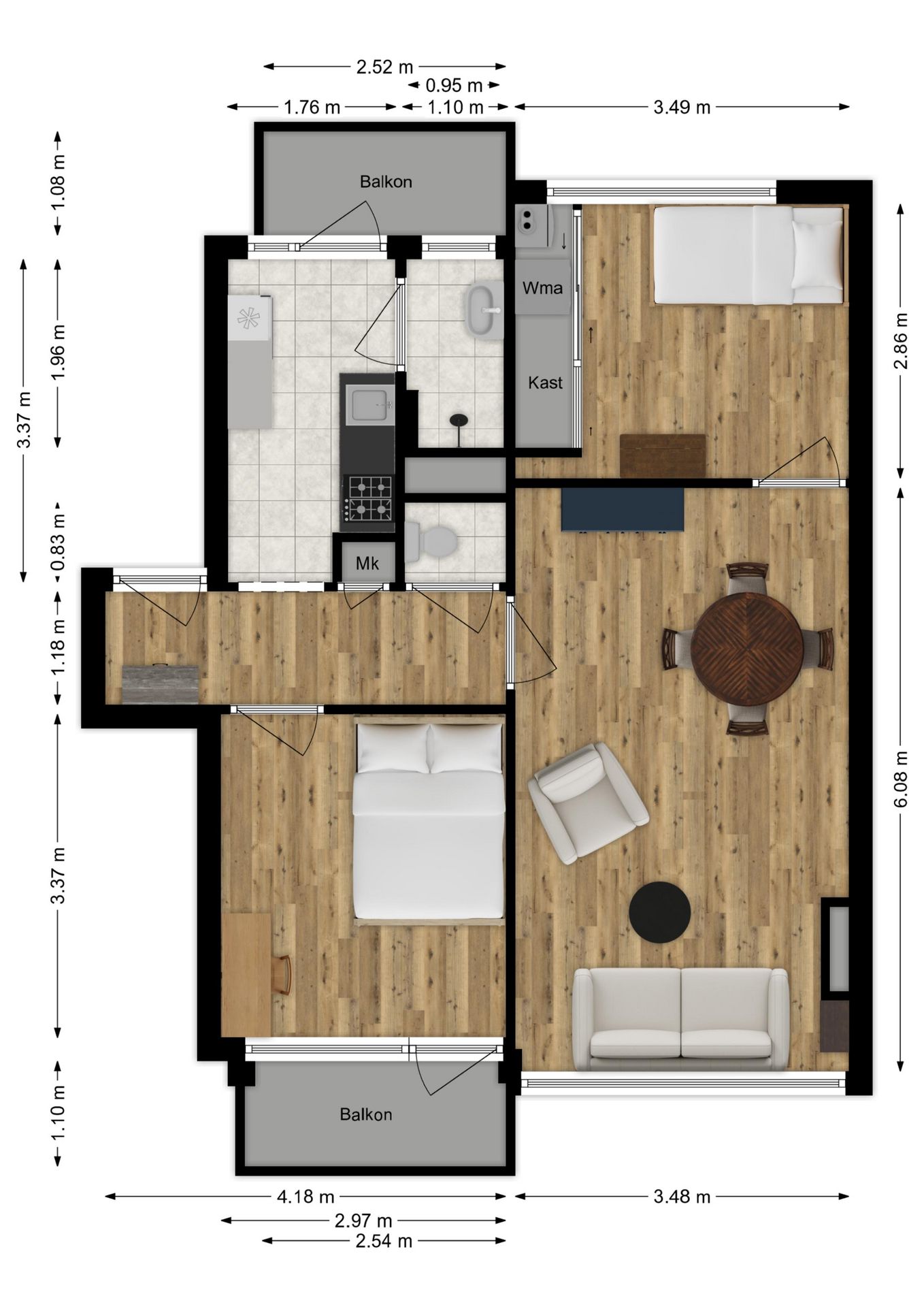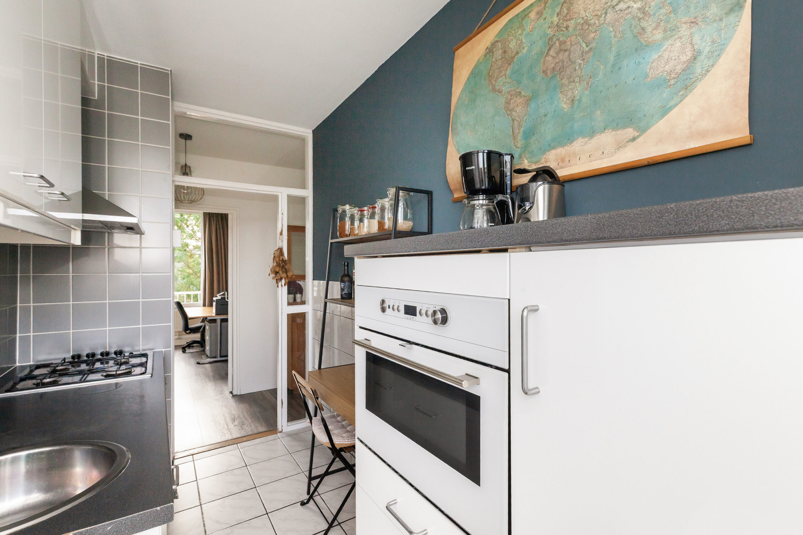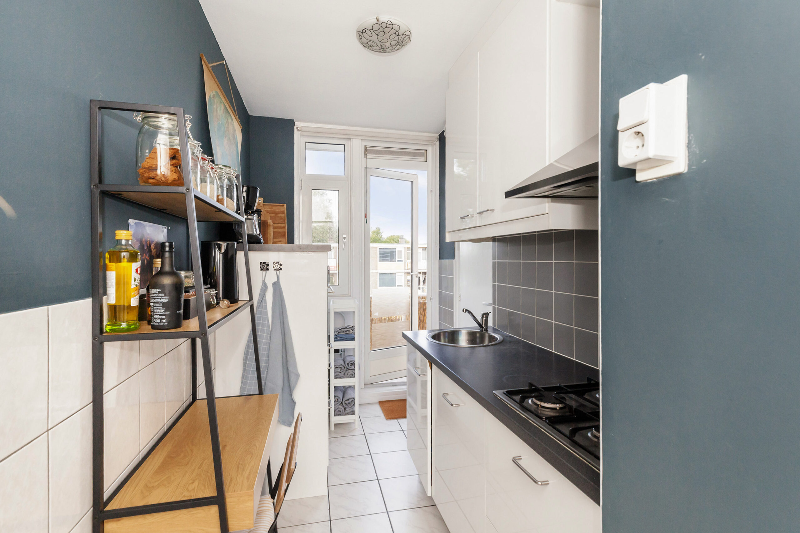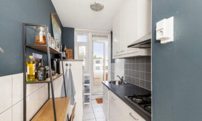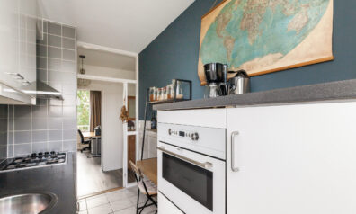 De keuken is aan de achterzijde gesitueerd. Aan de rechte opstelling heeft u de spoelbak, 4-pits gaskookplaat, afzuigkap en vaatwasser. Aan de andere zijde heeft u de koelkast met vriesvak en combimagnetron. Vanuit de keuken kunt u naar de badkamer en het achtergelegen balkon van circa 2.52 x 1.08m.