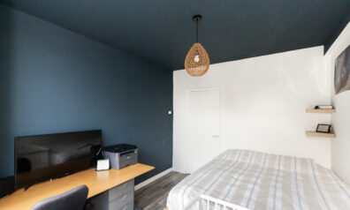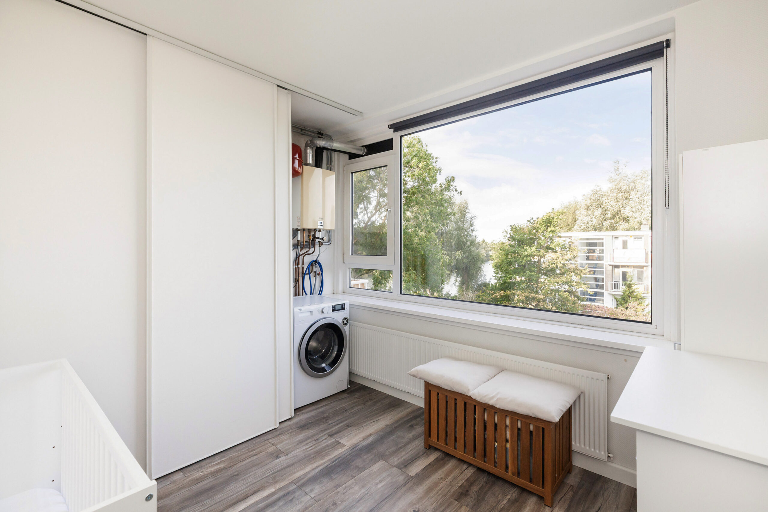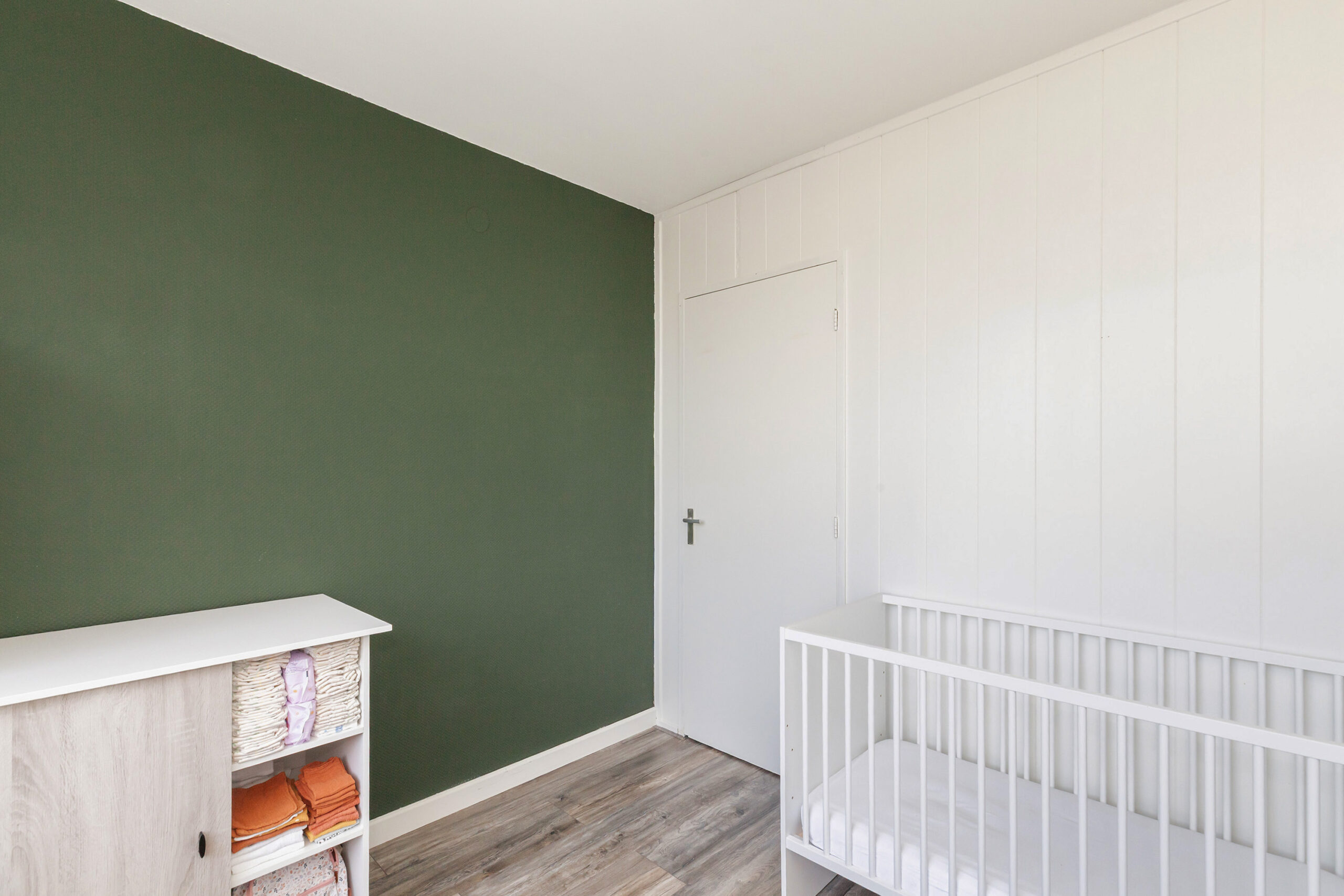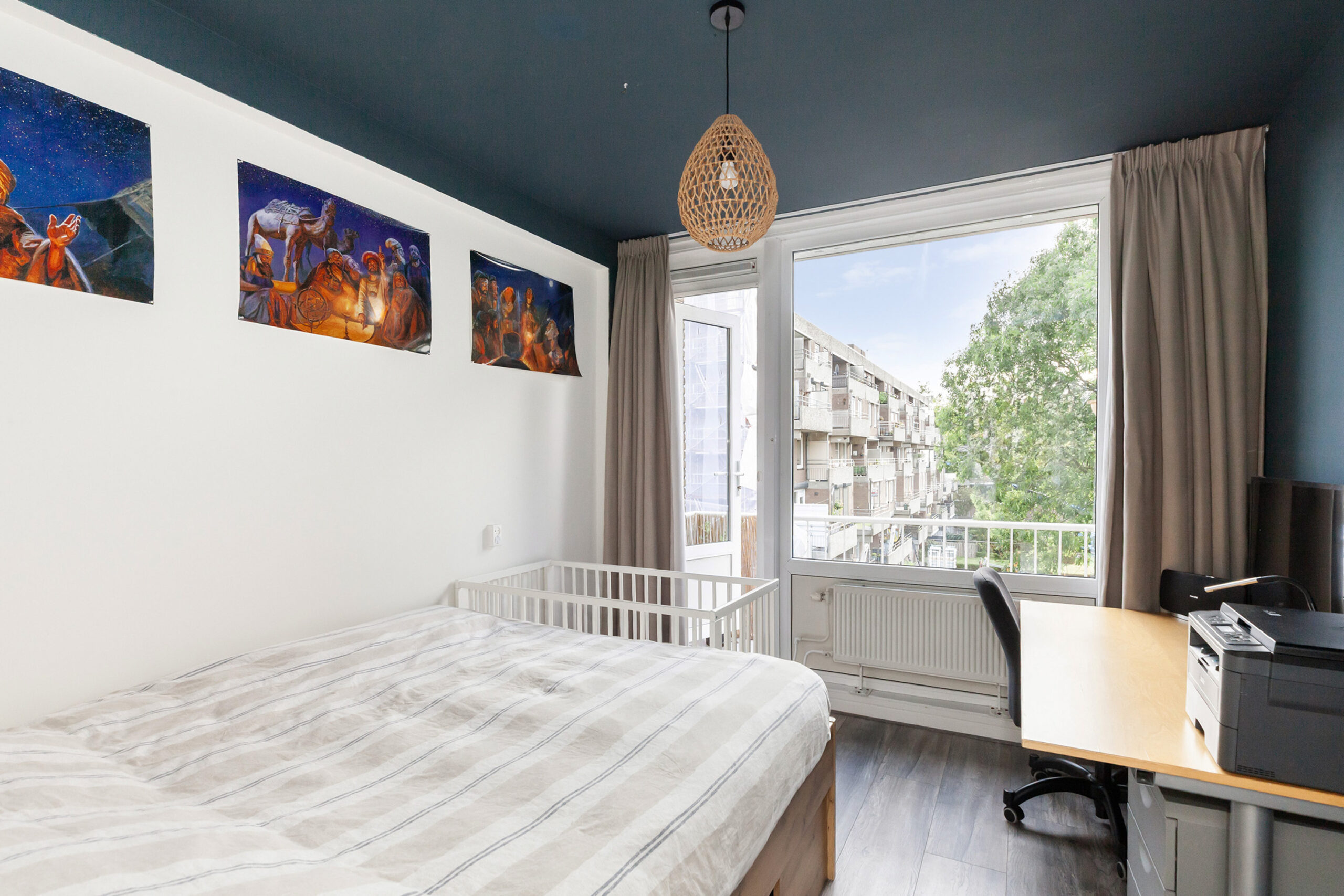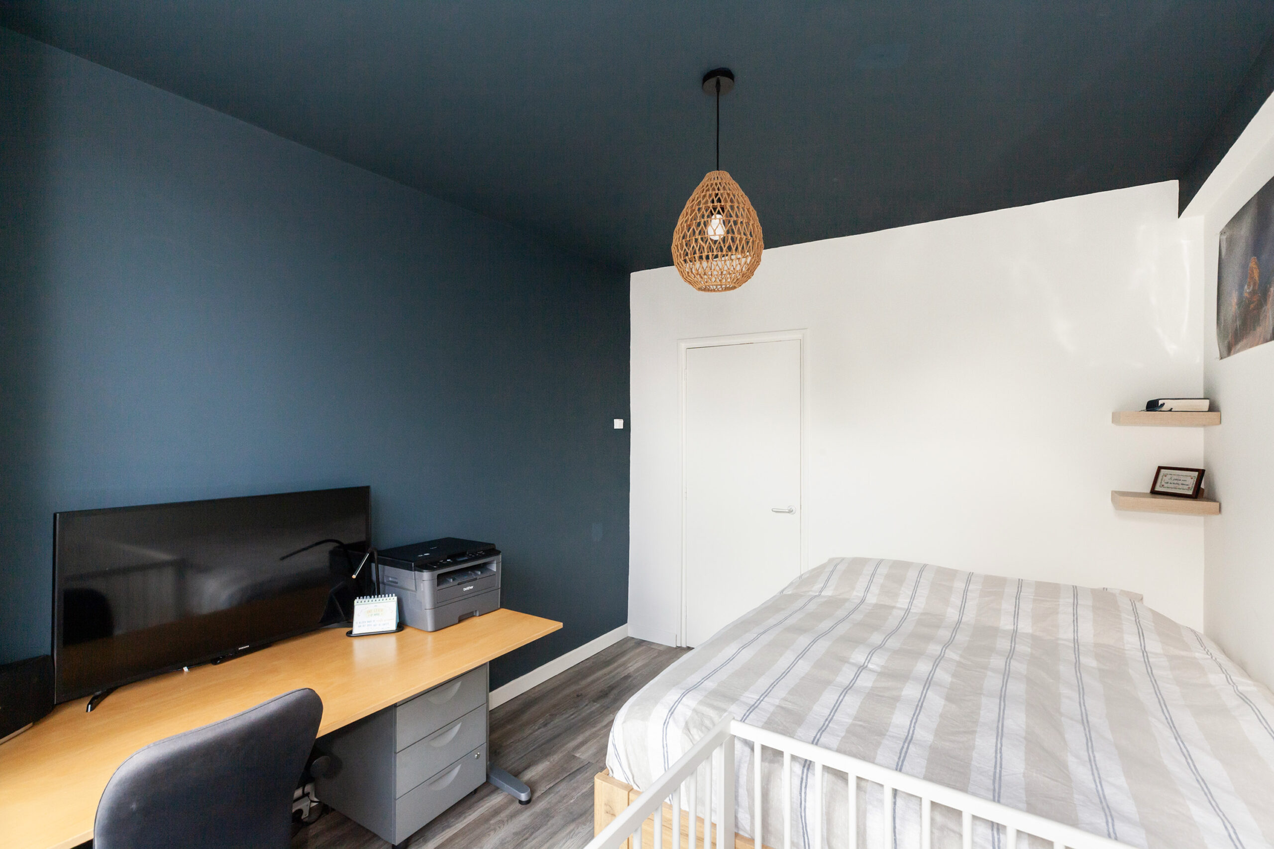 Deze slaapkamer is toegankelijk vanuit de woonkamer. In de grote kast met schuifdeuren heeft u de aansluitingen voor uw wasapparatuur en de opstelling van de C.V.-ketel.
