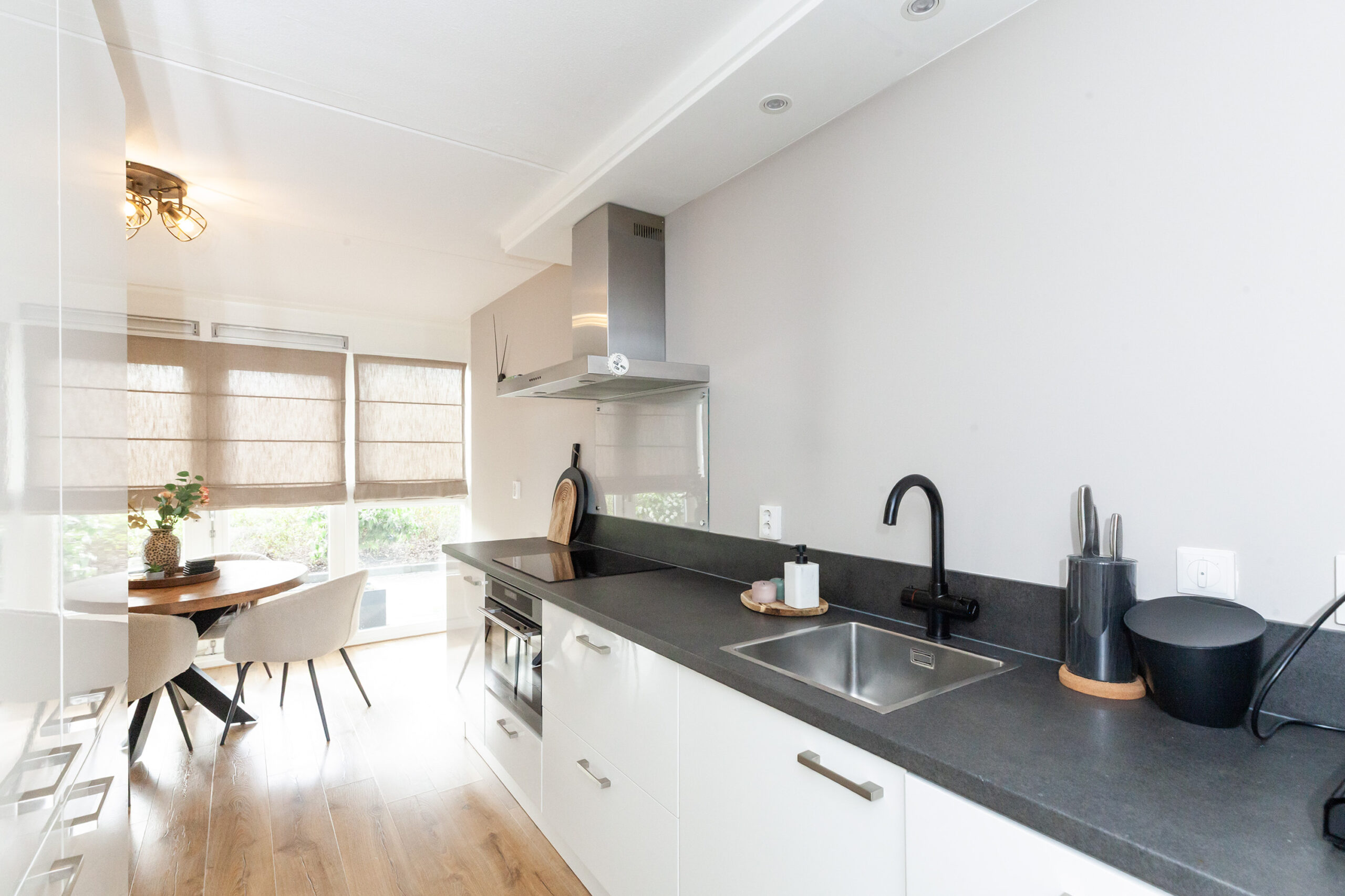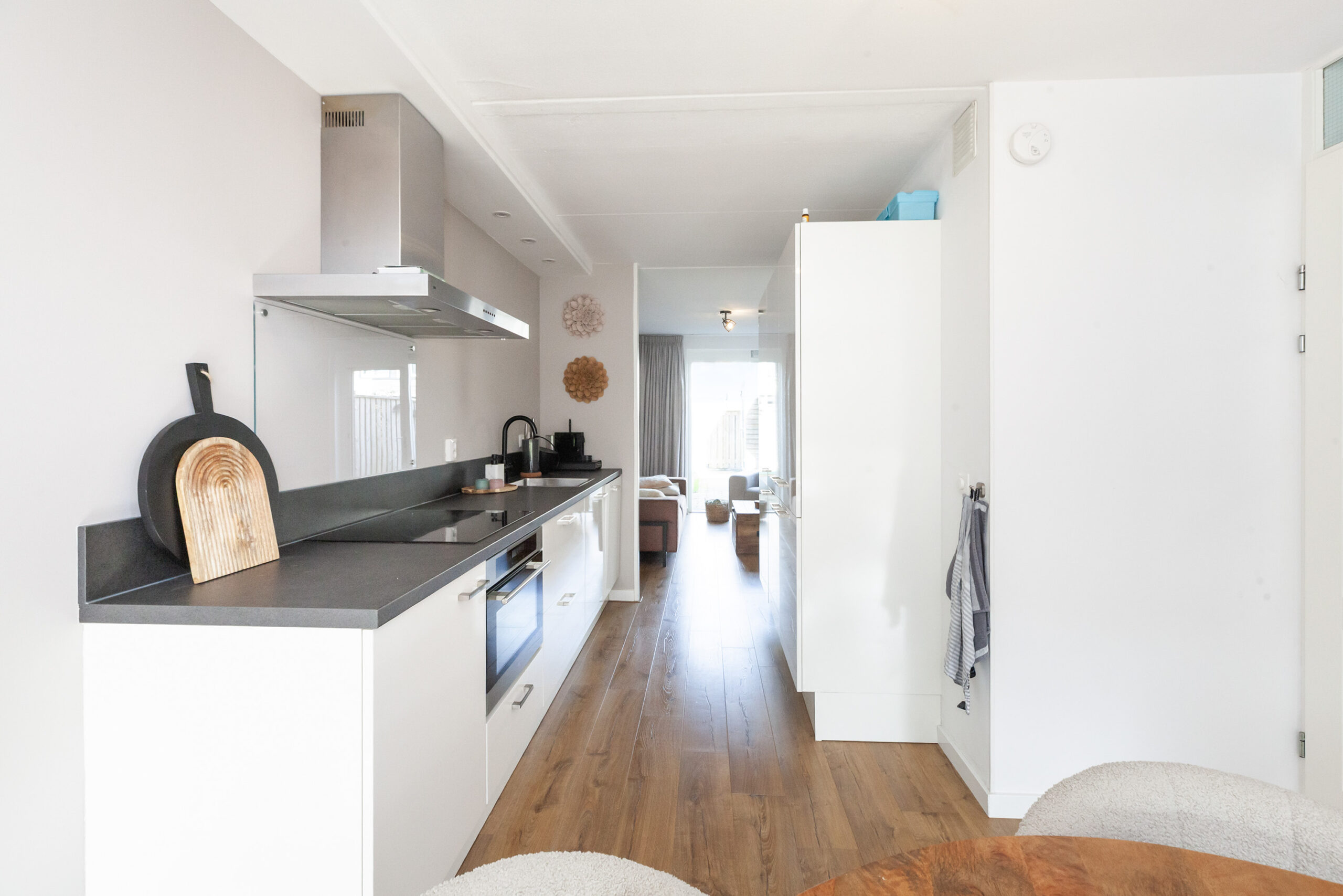Wat een heerlijke woonkeuken! Grote raampartijen, twee openslaande deuren en een strak afgewerkte keuken. Koken en dineren gaan hier samen op. Aan de rechte opstelling heeft u een Howat kokend water kraan, inductiekookplaat, afzuigkap, vaatwasser, combimagnetron. In de kastenwand treft u o.a. de koel-/vriescombinatie. De keuken vloeit over in de woonkamer.
