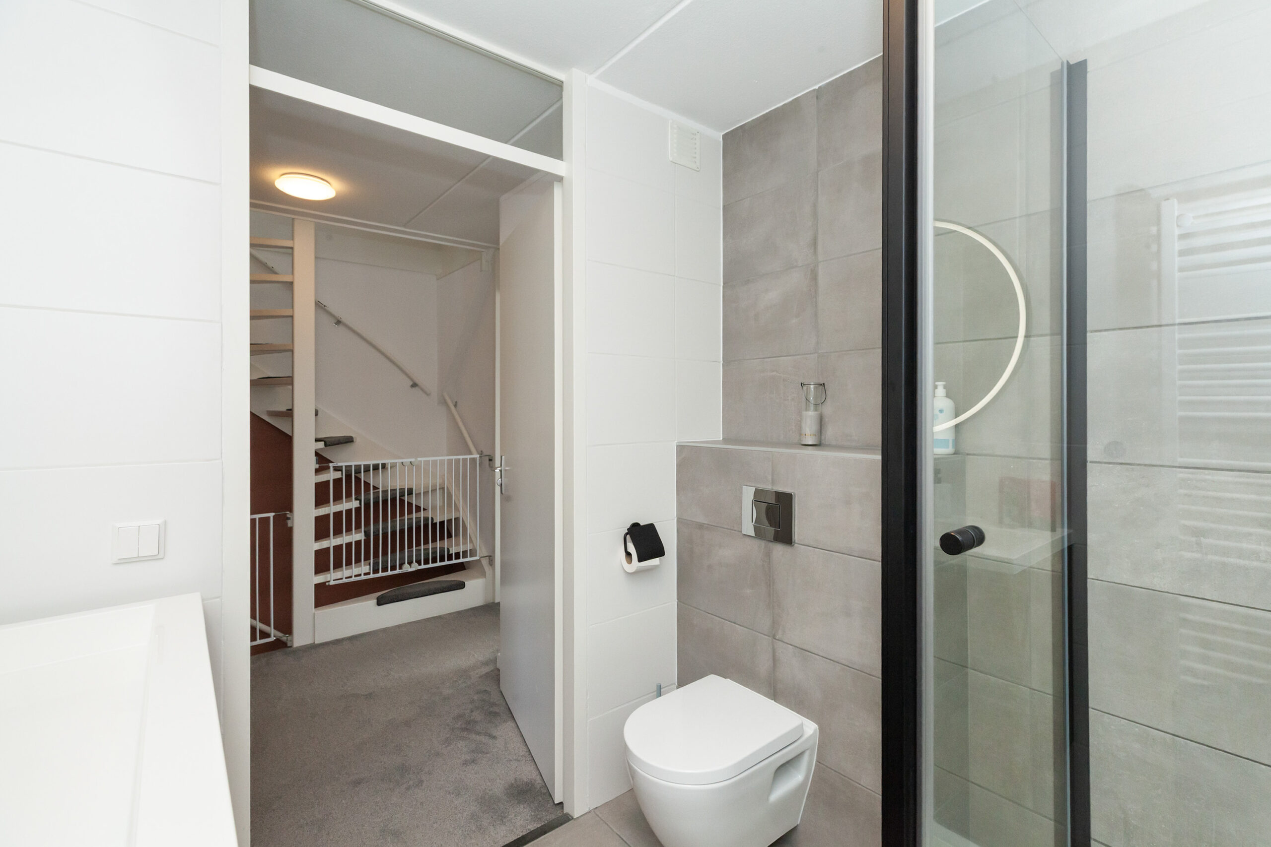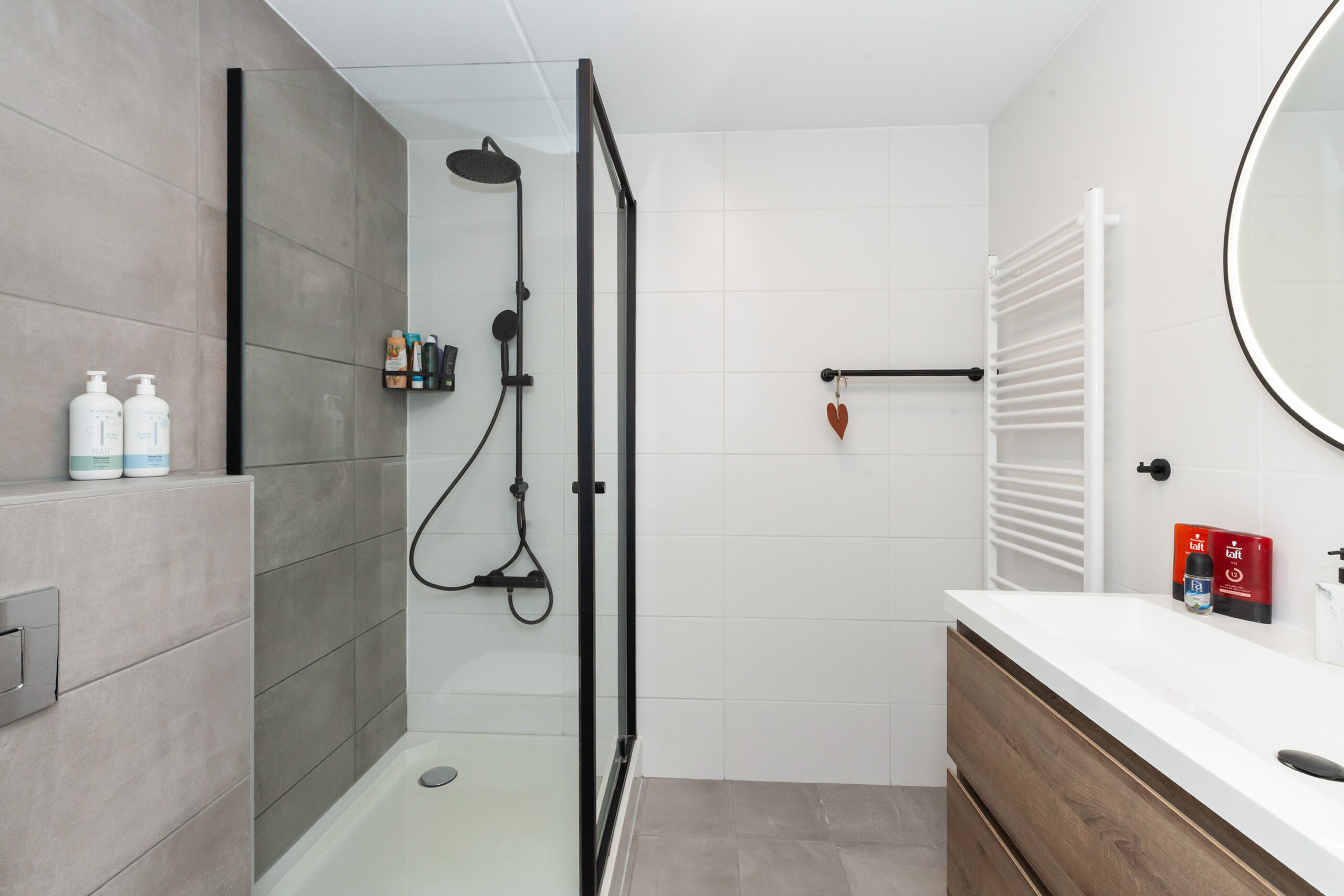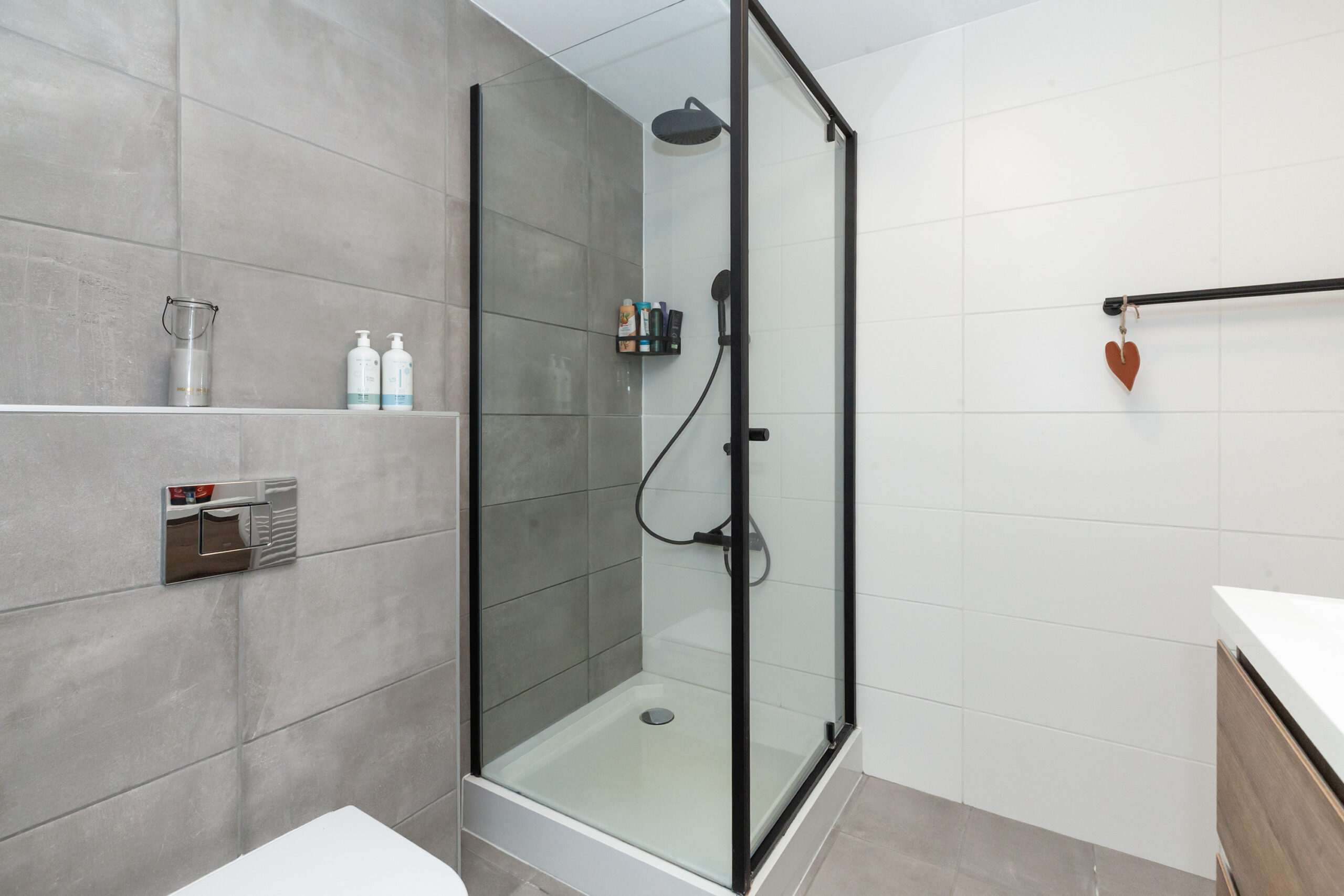 De badkamer is gelijke stijl afgewerkt als de toiletruimte. Deze is voorzien van een douche, wastafelmeubel, toilet en een designradiator.