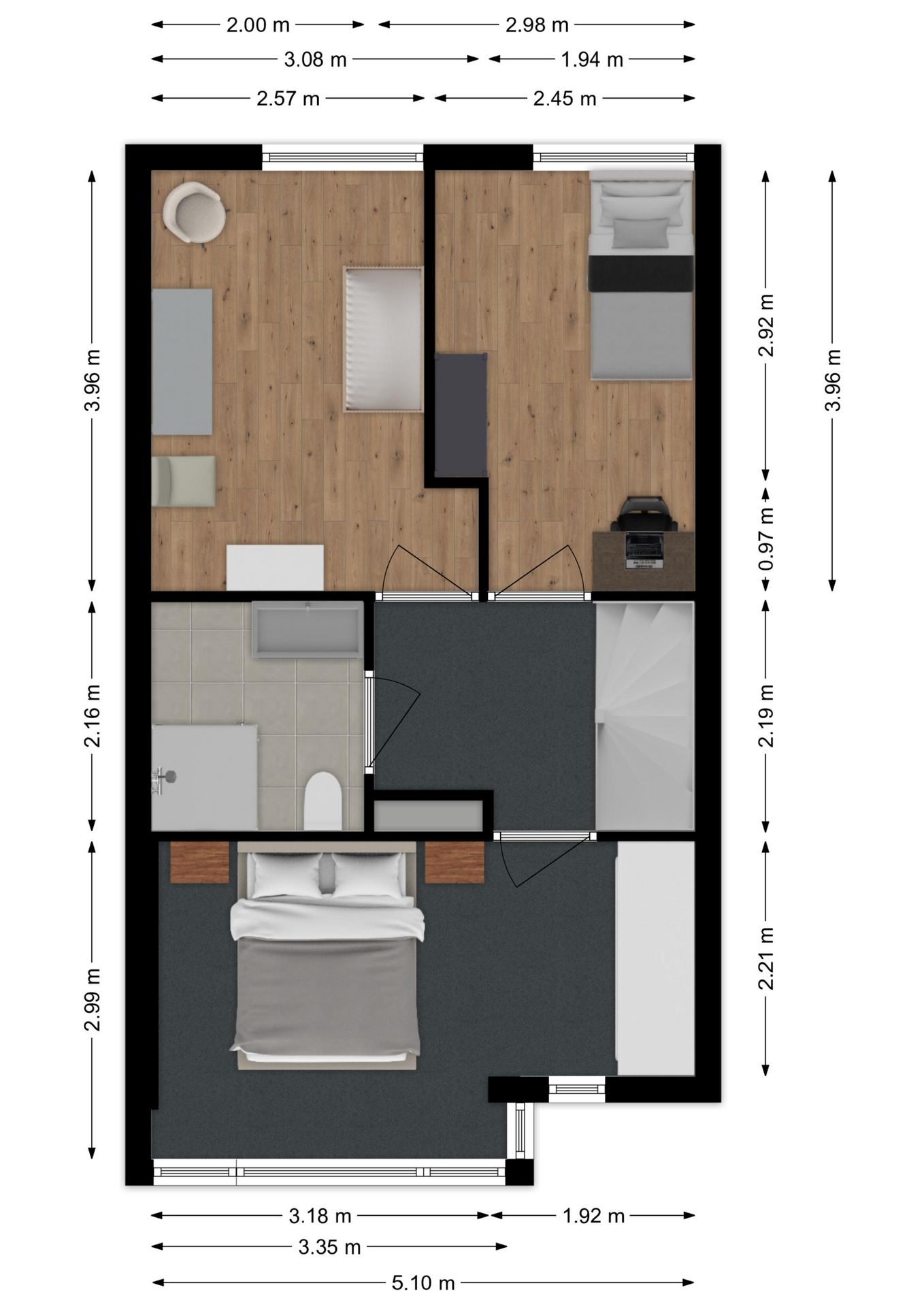 Vanaf de overloop is er toegang tot de drie slaapkamers en de badkamer.