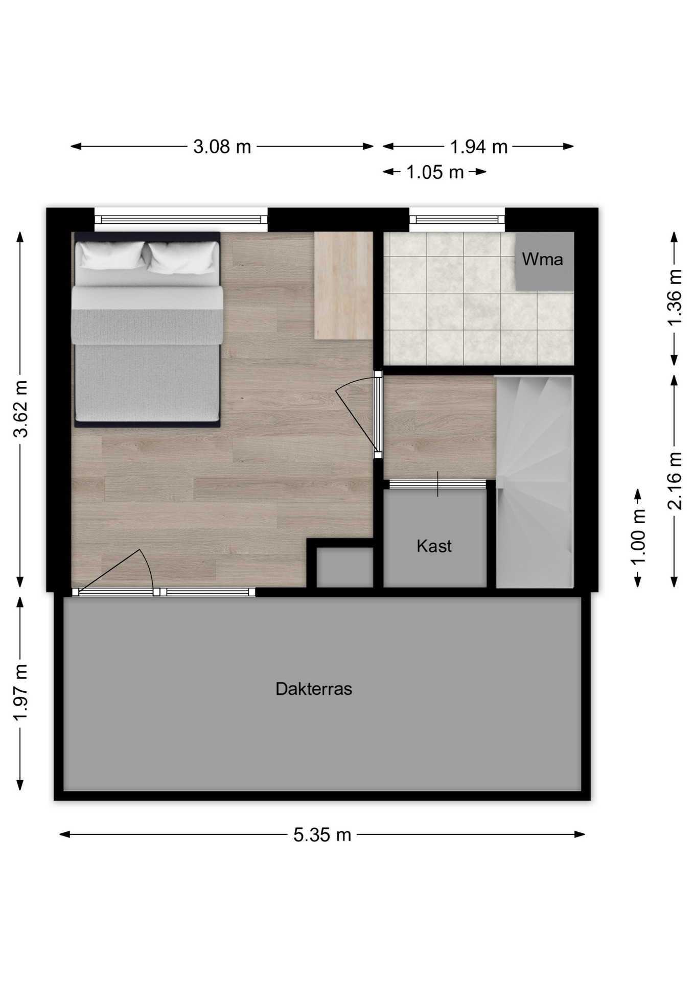 Ruime slaapkamer welke toegang geeft tot het voorgelegen dakterras van circa 5.35 x 1.97m.