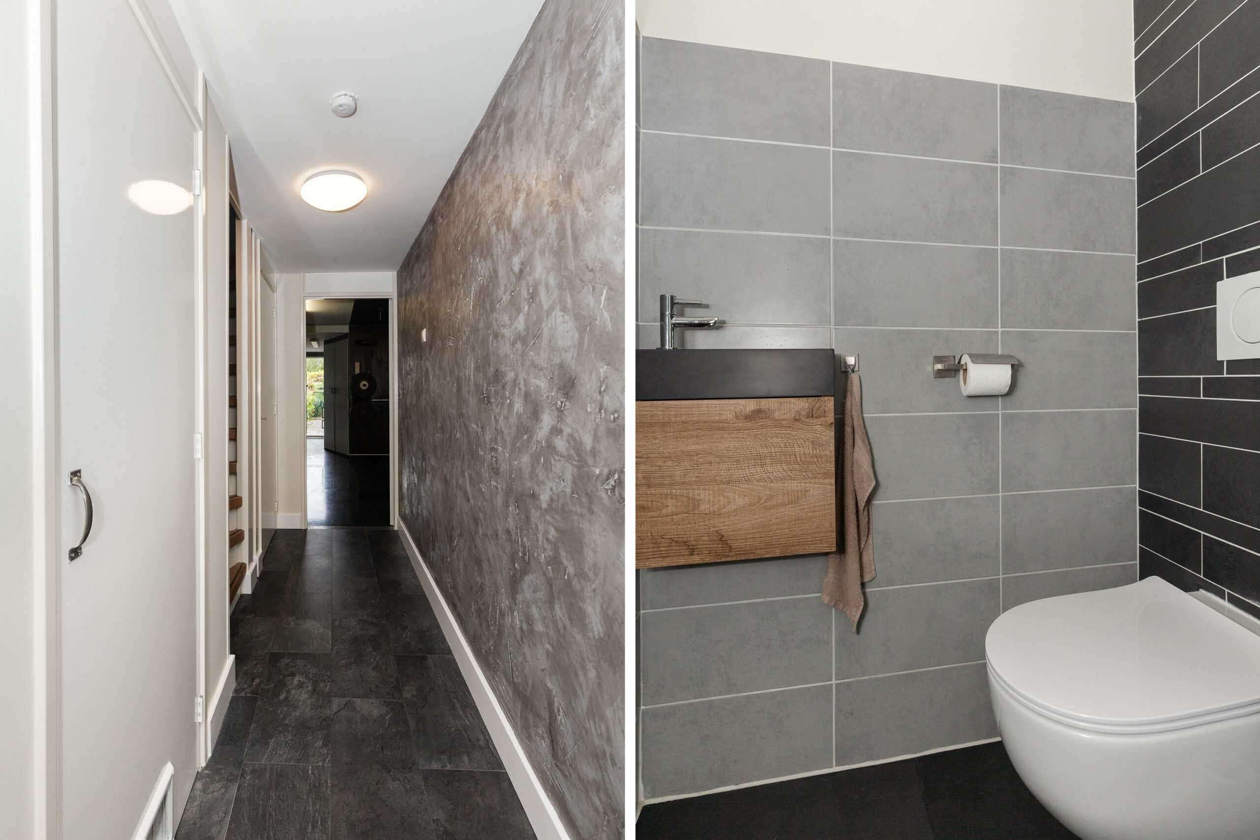 Nette toiletruimte voorzien van een vrijhangend closet en een handwasfonteintje.