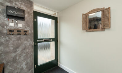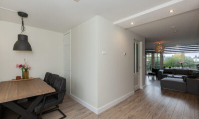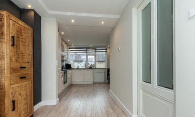 In de lange hal heeft u de meterkast, kast met C.V.-ketel, trapopgang naar de verdieping en een trapkast. Aan het einde van de hal heeft u toegang tot de garage.