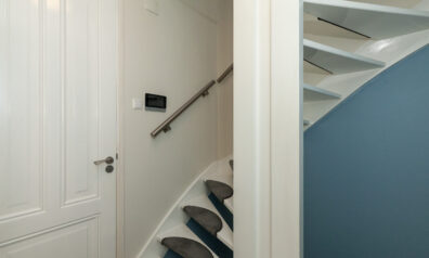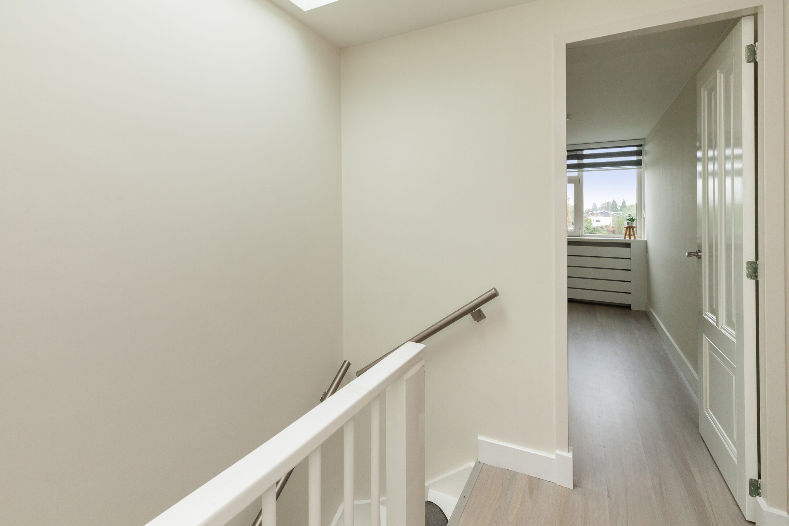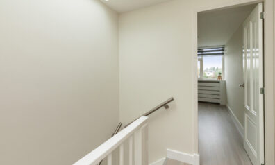 Op deze overloop heeft u de toiletruimte en de trappen naar de begane grond en eerste verdieping. Via de schuifdeur komt u in de woonkamer/keuken.