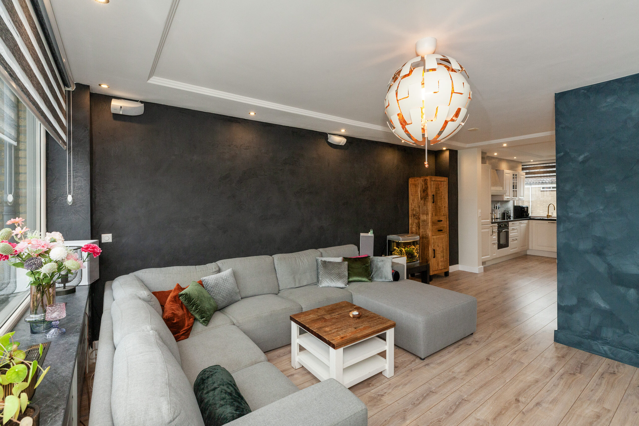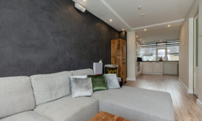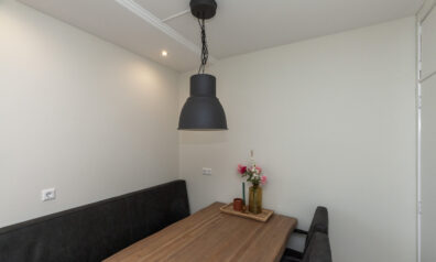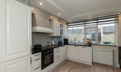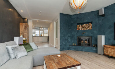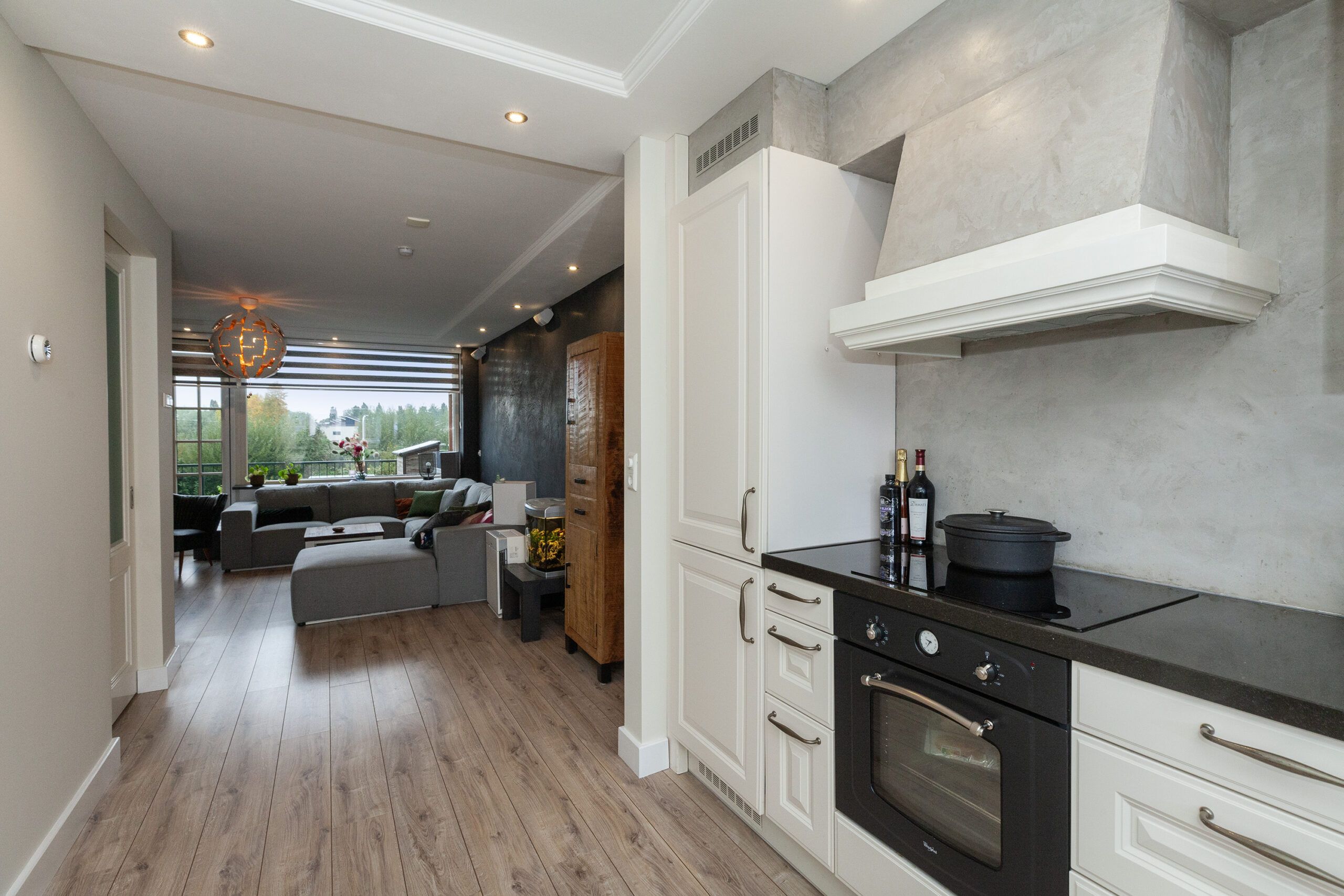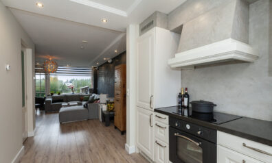 De woonkamer straalt warmte en gezelligheid uit! De sfeervolle houtkachel zorgt niet alleen voor behaaglijke warmte, maar vormt ook het charmante middelpunt in de koude wintermaanden. De spots in het plafond zorgen voor subtiele verlichting en voegen een moderne afwerking toe. Via de openslaande deuren kunt u naar het balkon (circa 4.89 x 3.89m) en aan de voorzijde vloeit de kamer over in de woonkeuken.