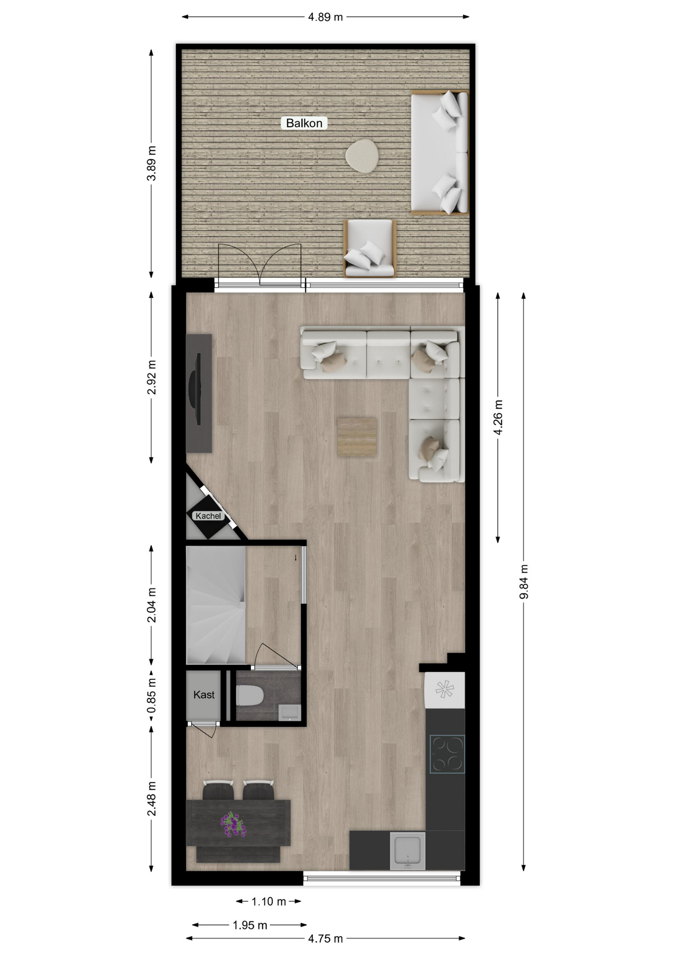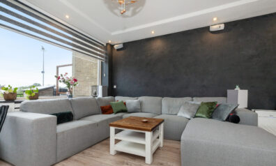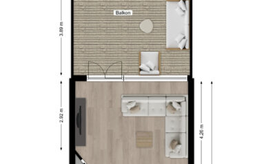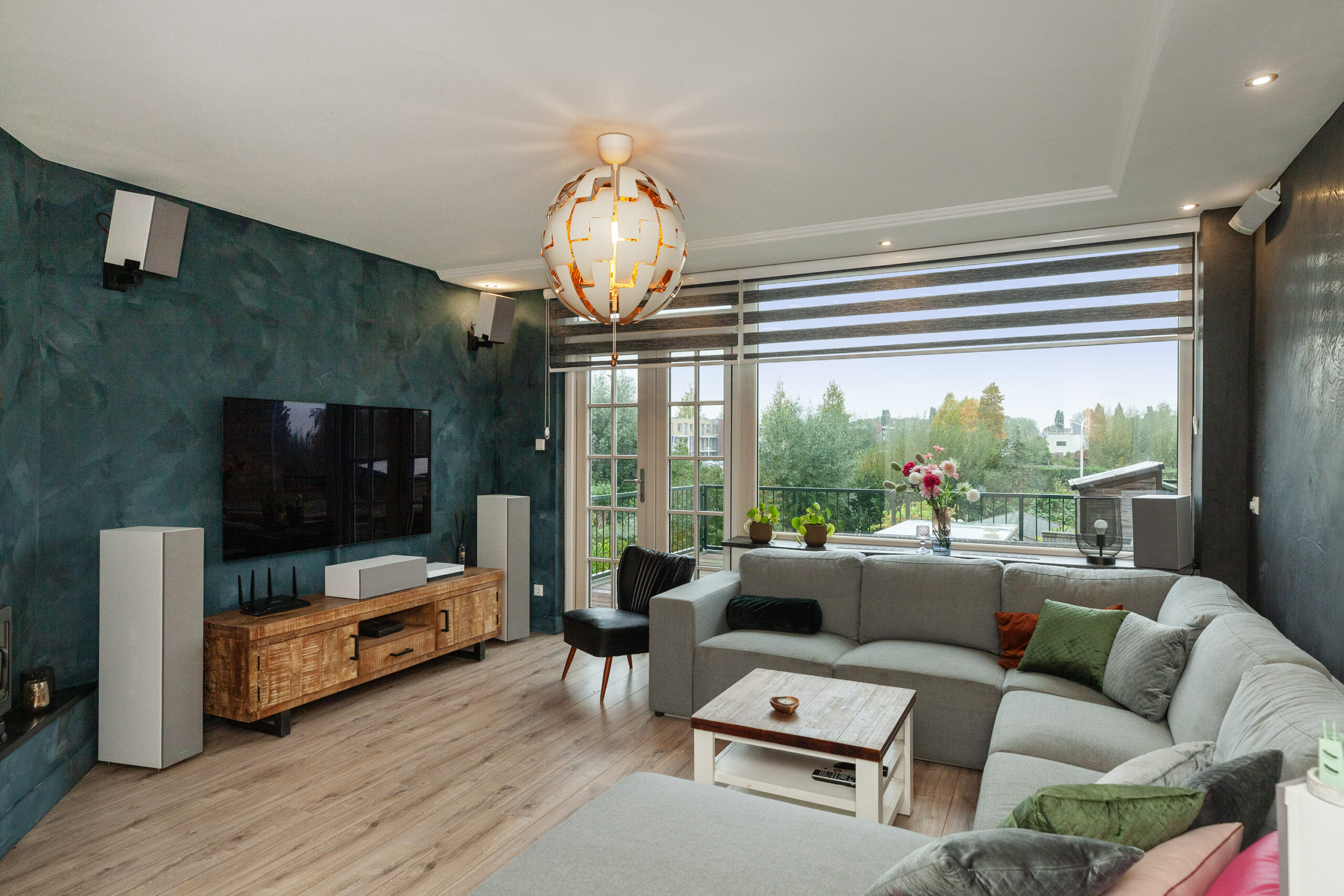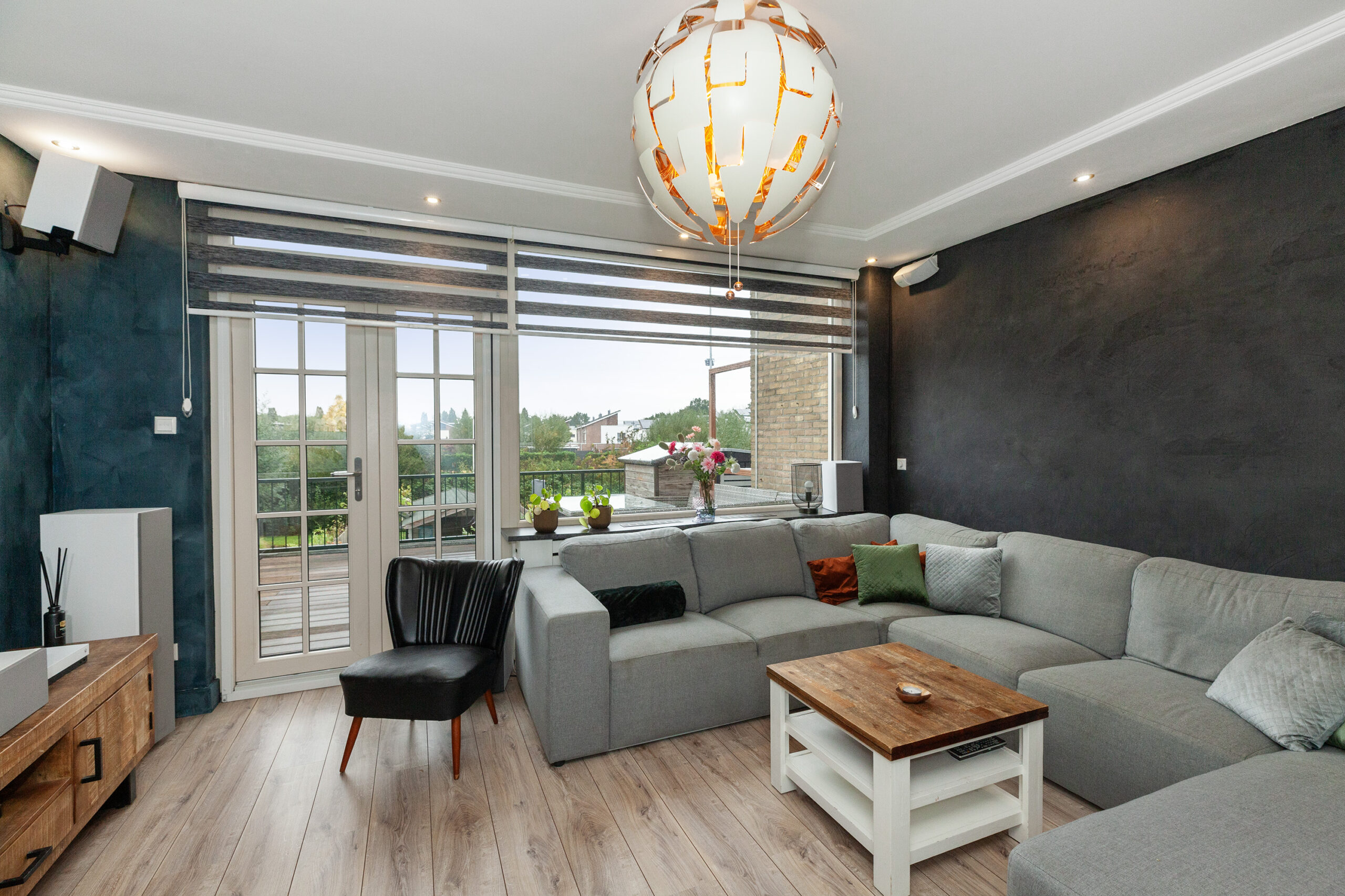 De woonkamer straalt warmte en gezelligheid uit! De sfeervolle houtkachel zorgt niet alleen voor behaaglijke warmte, maar vormt ook het charmante middelpunt in de koude wintermaanden. De spots in het plafond zorgen voor subtiele verlichting en voegen een moderne afwerking toe. Via de openslaande deuren kunt u naar het balkon (circa 4.89 x 3.89m) en aan de voorzijde vloeit de kamer over in de woonkeuken.