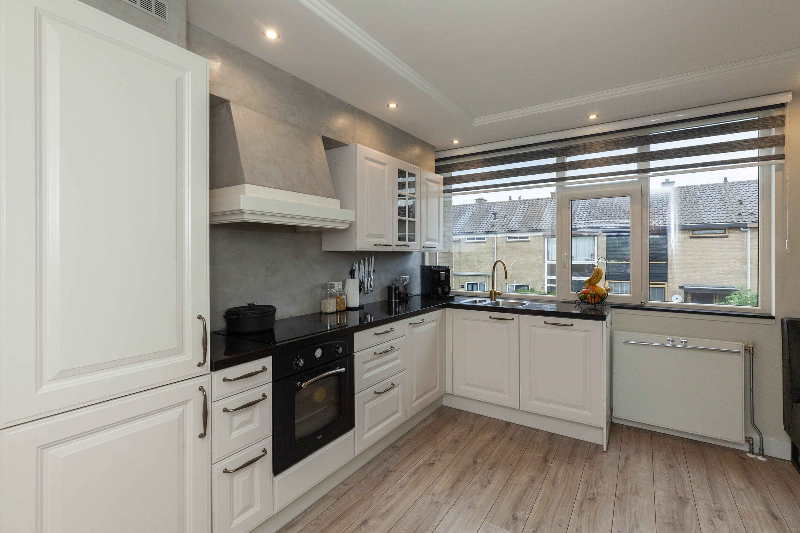 De ruim opgezette keuken is een heerlijke plek om samen te komen, te koken en te genieten. Doordat er alle ruimte is voor het plaatsen van een eettafel zal dit zorgen voor een gezellig samenzijn. De hoekopstelling biedt volop werkruimte en is afgewerkt met een composiet aanrechtblad. Alle denkbare inbouwapparatuur is aanwezig, zoals een inductiekookplaat, afzuigkap, combimagnetron, vaatwasser en een koel-/vriescombinatie. Een echte blikvanger is de goudkleurige kraan, die het geheel een eigentijdse en chique uitstraling geeft! Er is een inbouwkast van circa 0.59 x 0.54m voor het opbergen van allerhande proviand.